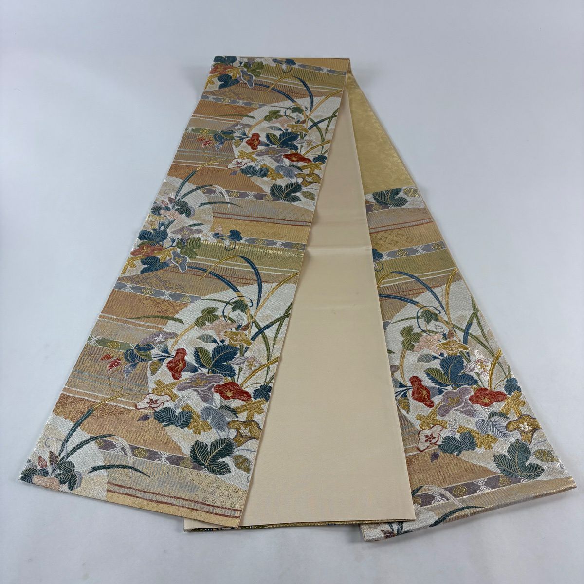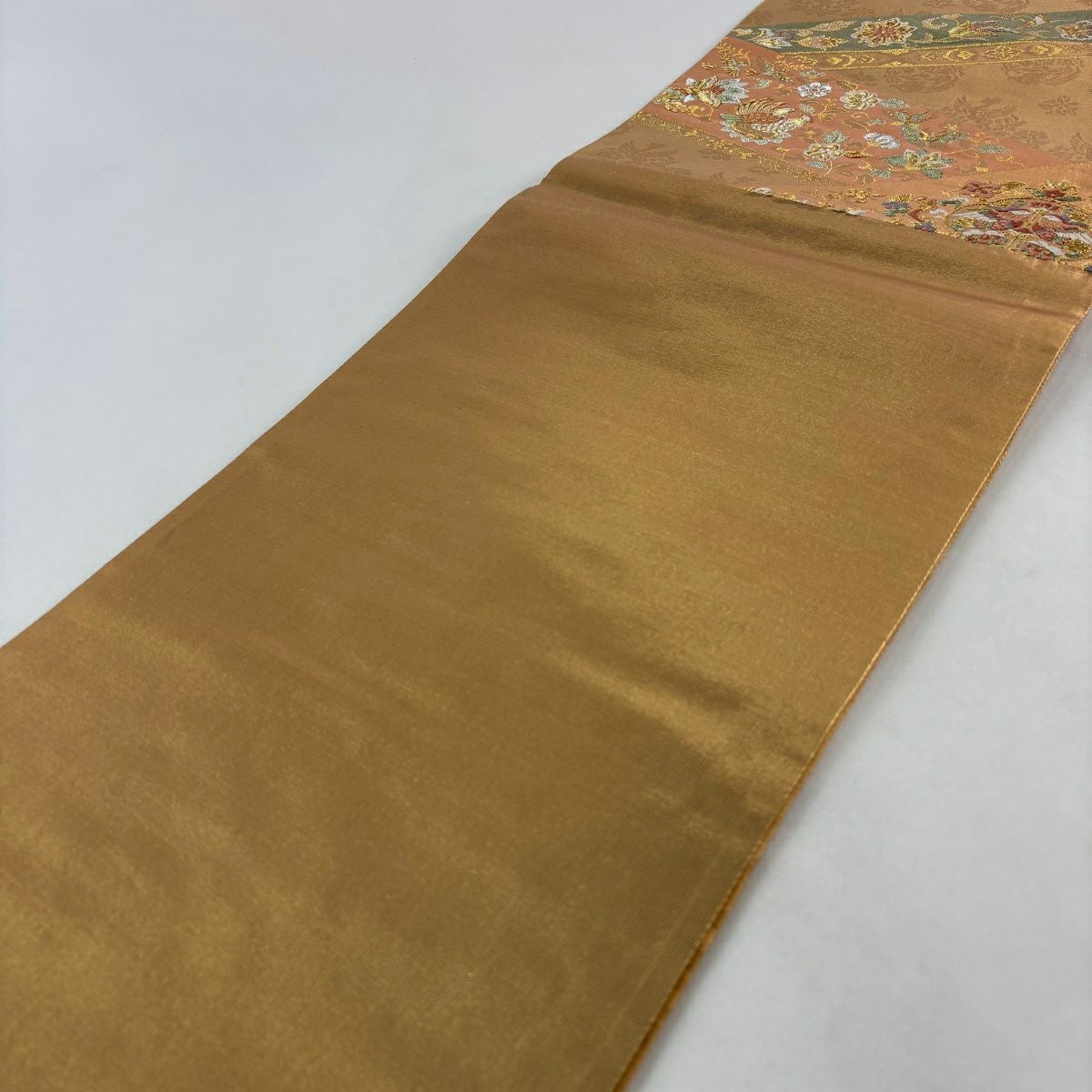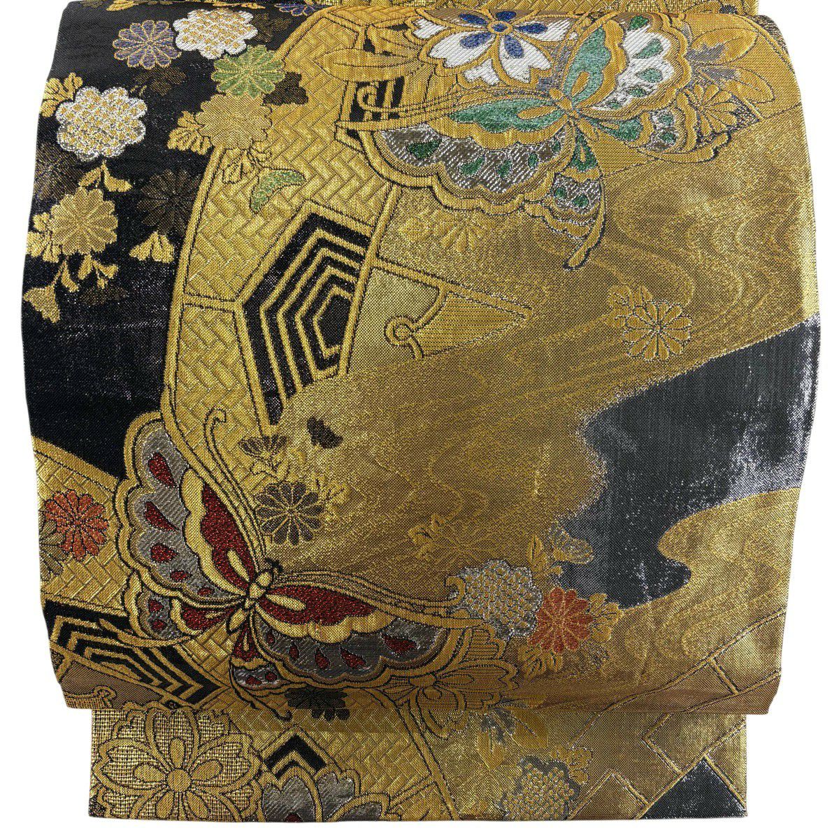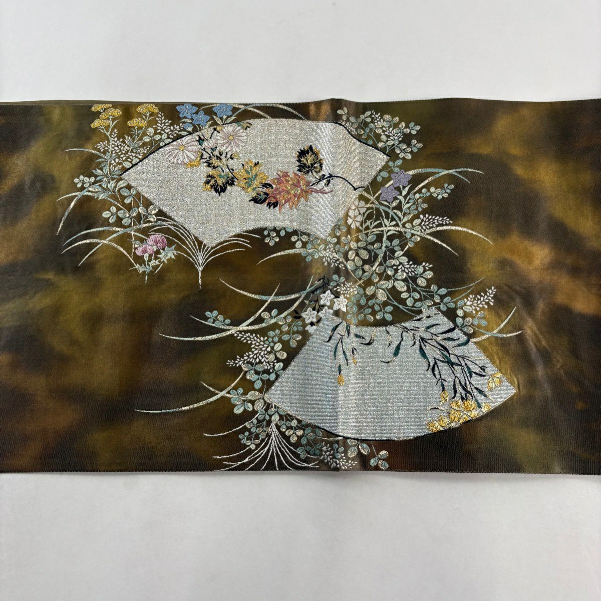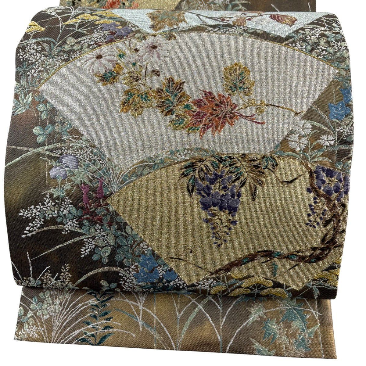 【美品】 袋帯 秀品 遊扇草花文 金銀糸 箔 金茶 お太鼓柄 正絹