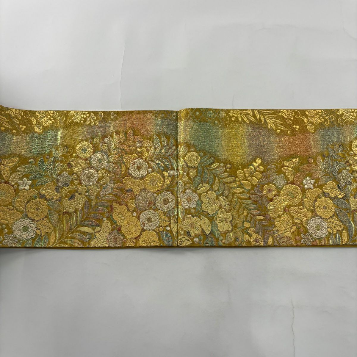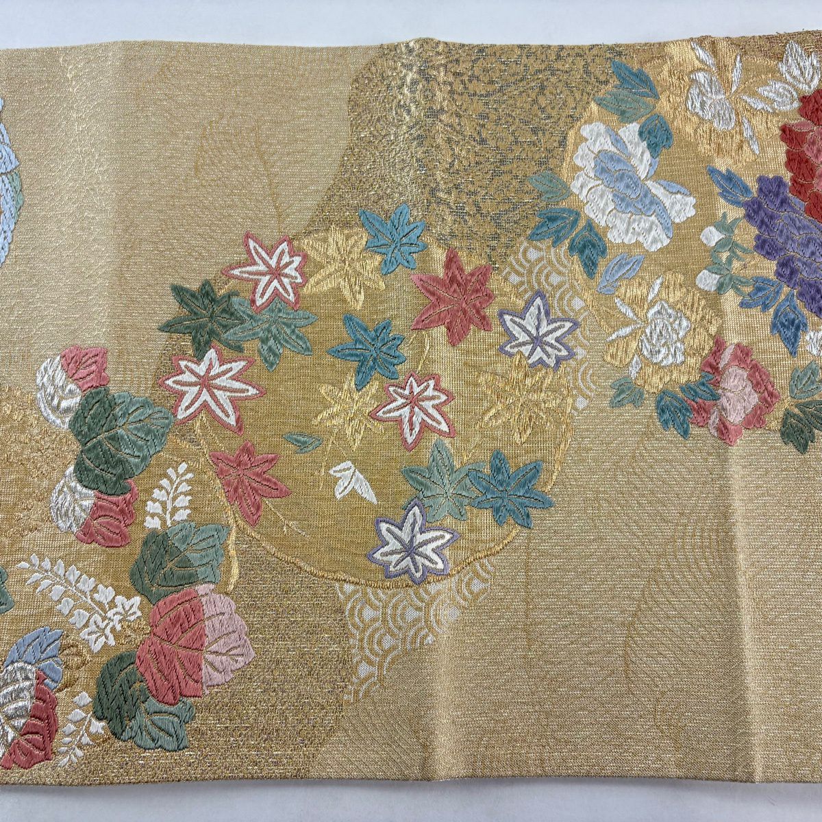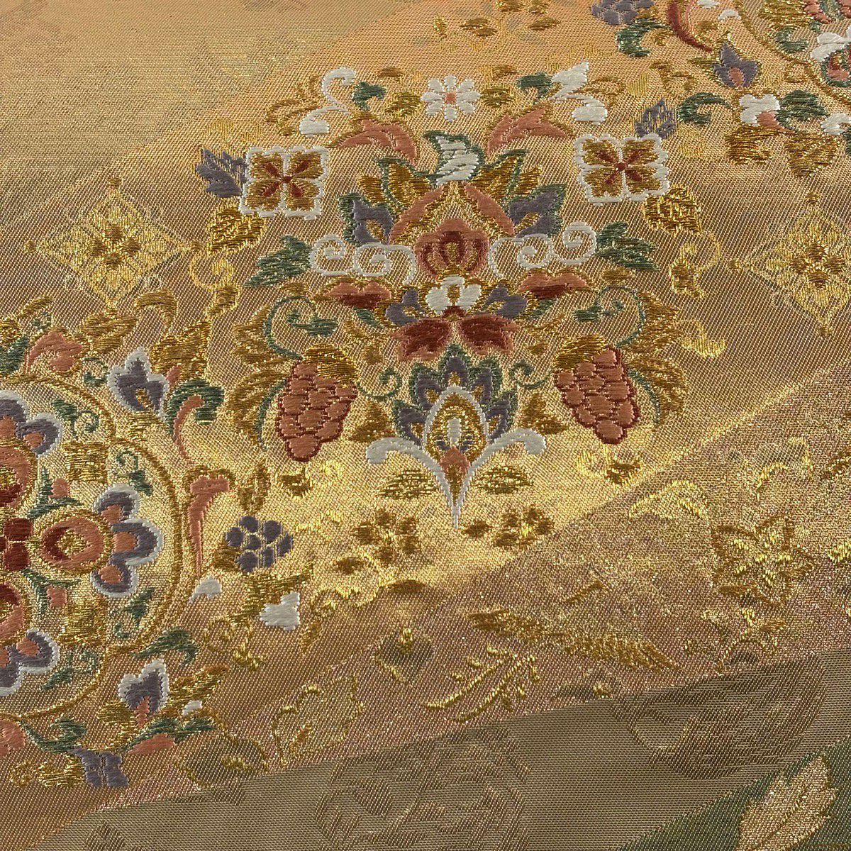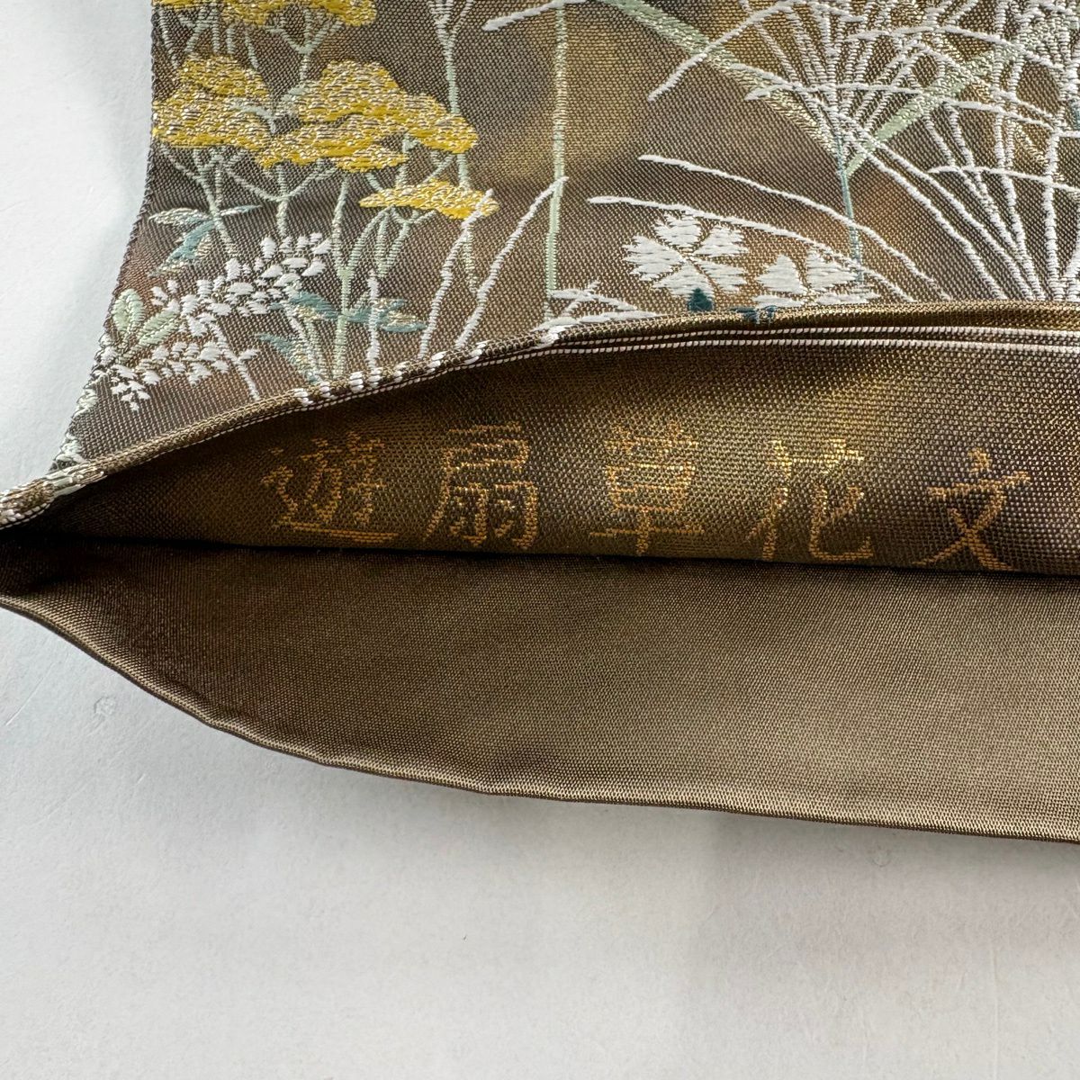 【美品】 袋帯 秀品 遊扇草花文 金銀糸 箔 金茶 お太鼓柄 正絹