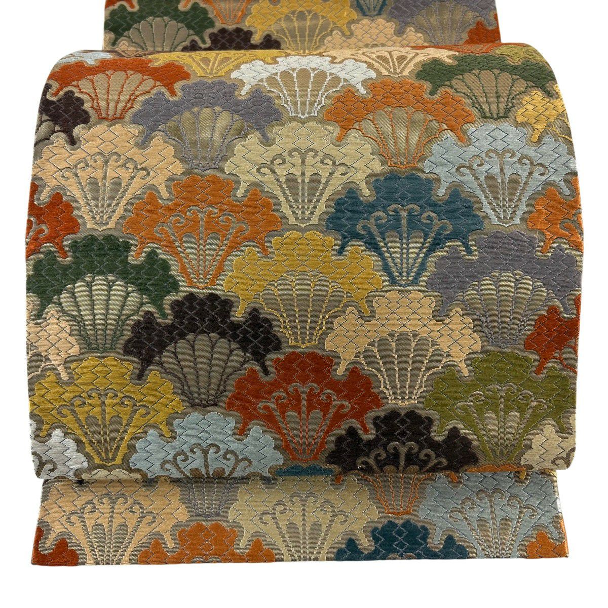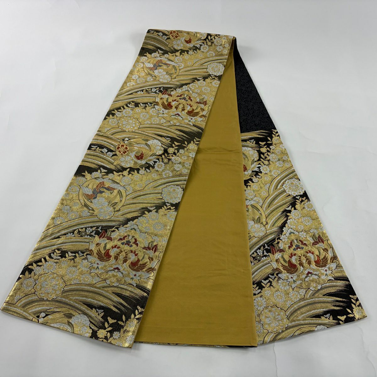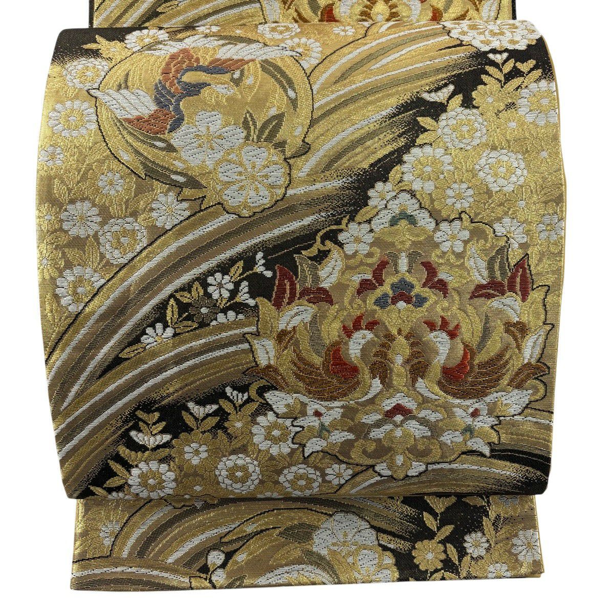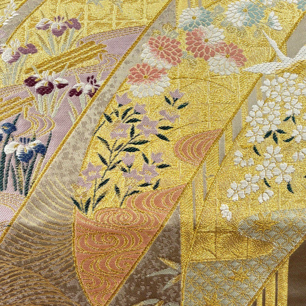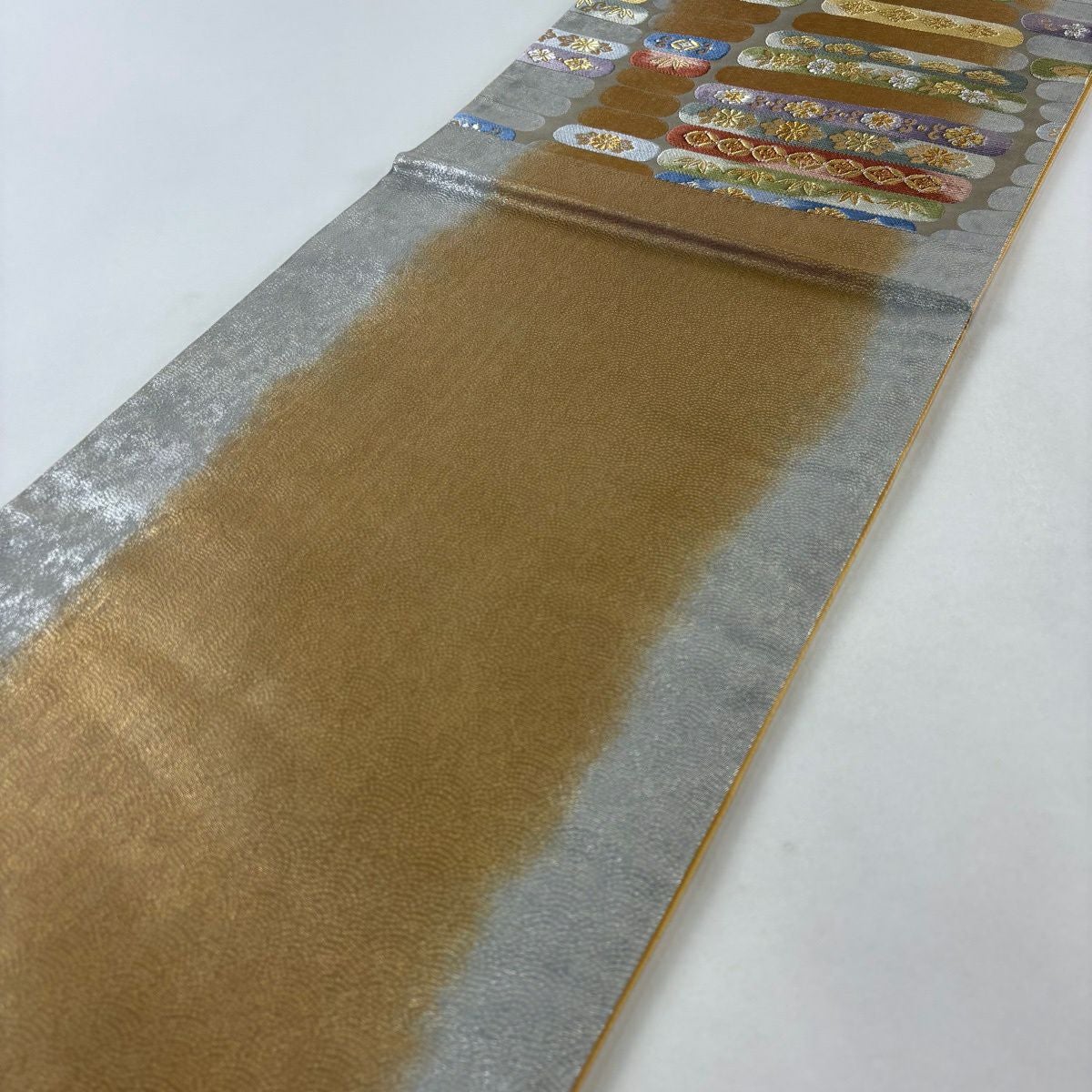 【美品】 袋帯 秀品 遊扇草花文 金銀糸 箔 金茶 お太鼓柄 正絹