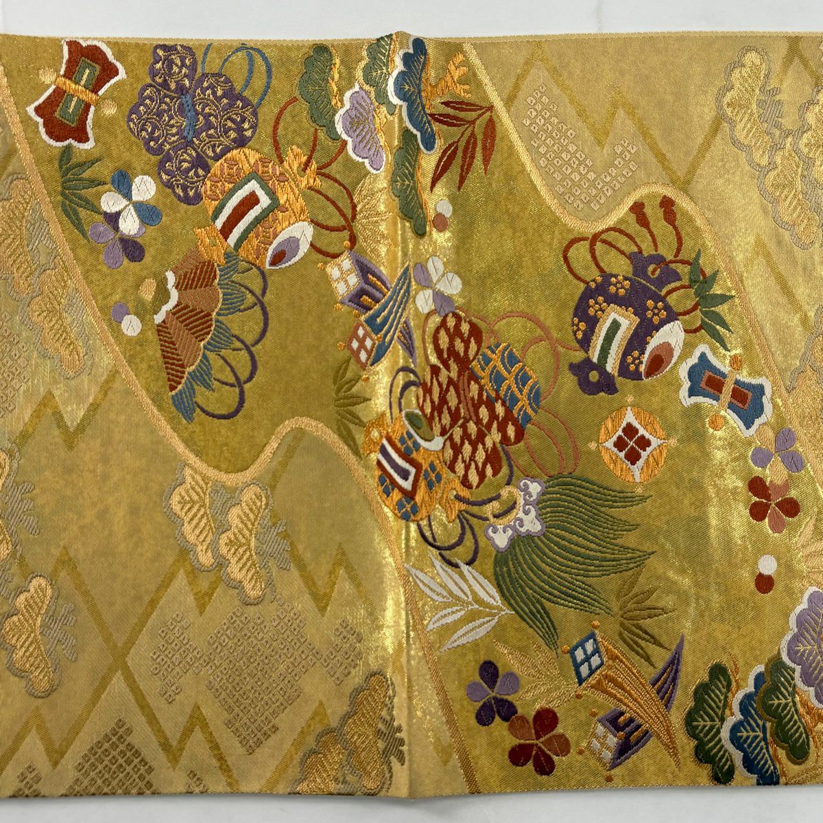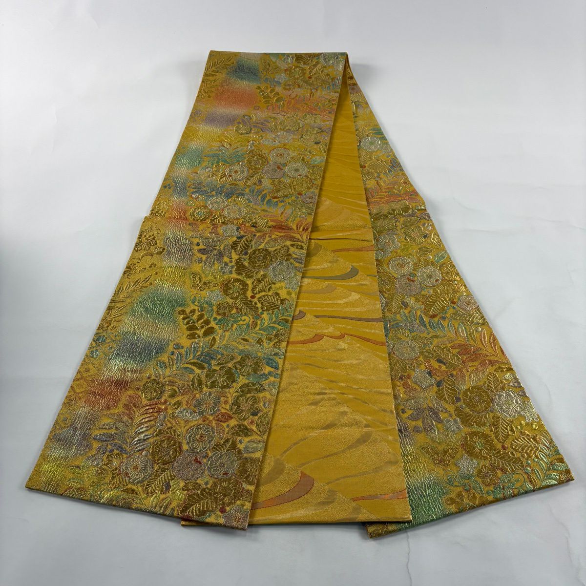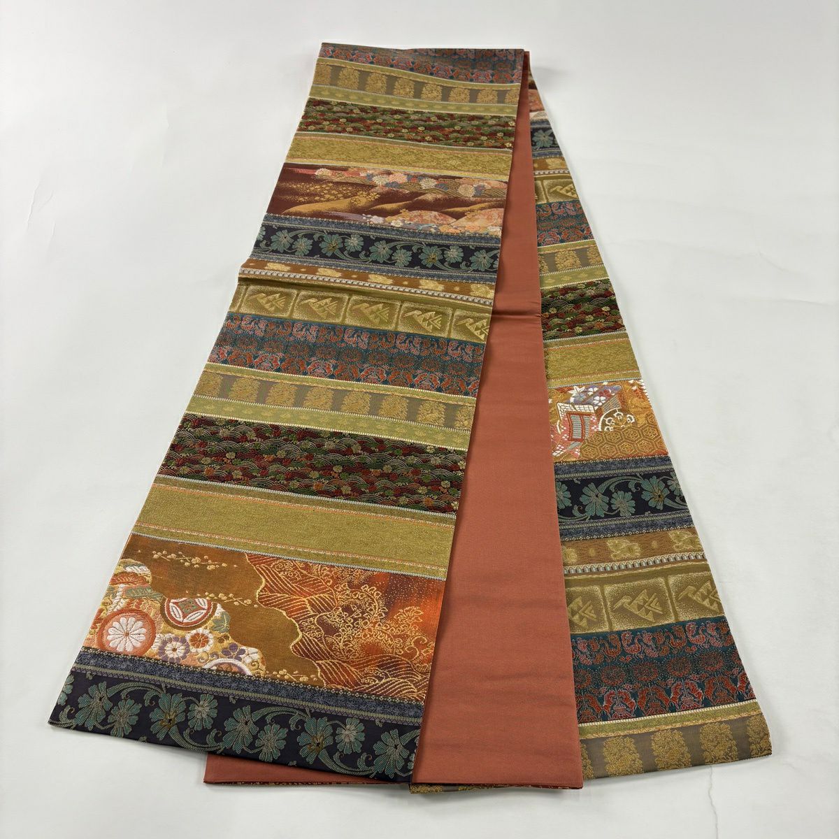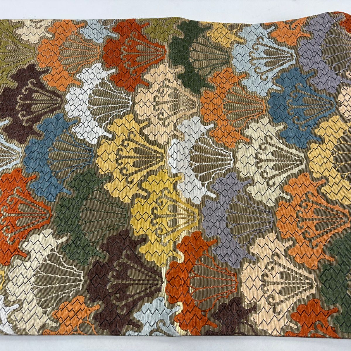 【美品】 袋帯 秀品 遊扇草花文 金銀糸 箔 金茶 お太鼓柄 正絹