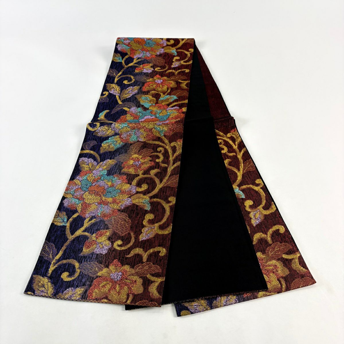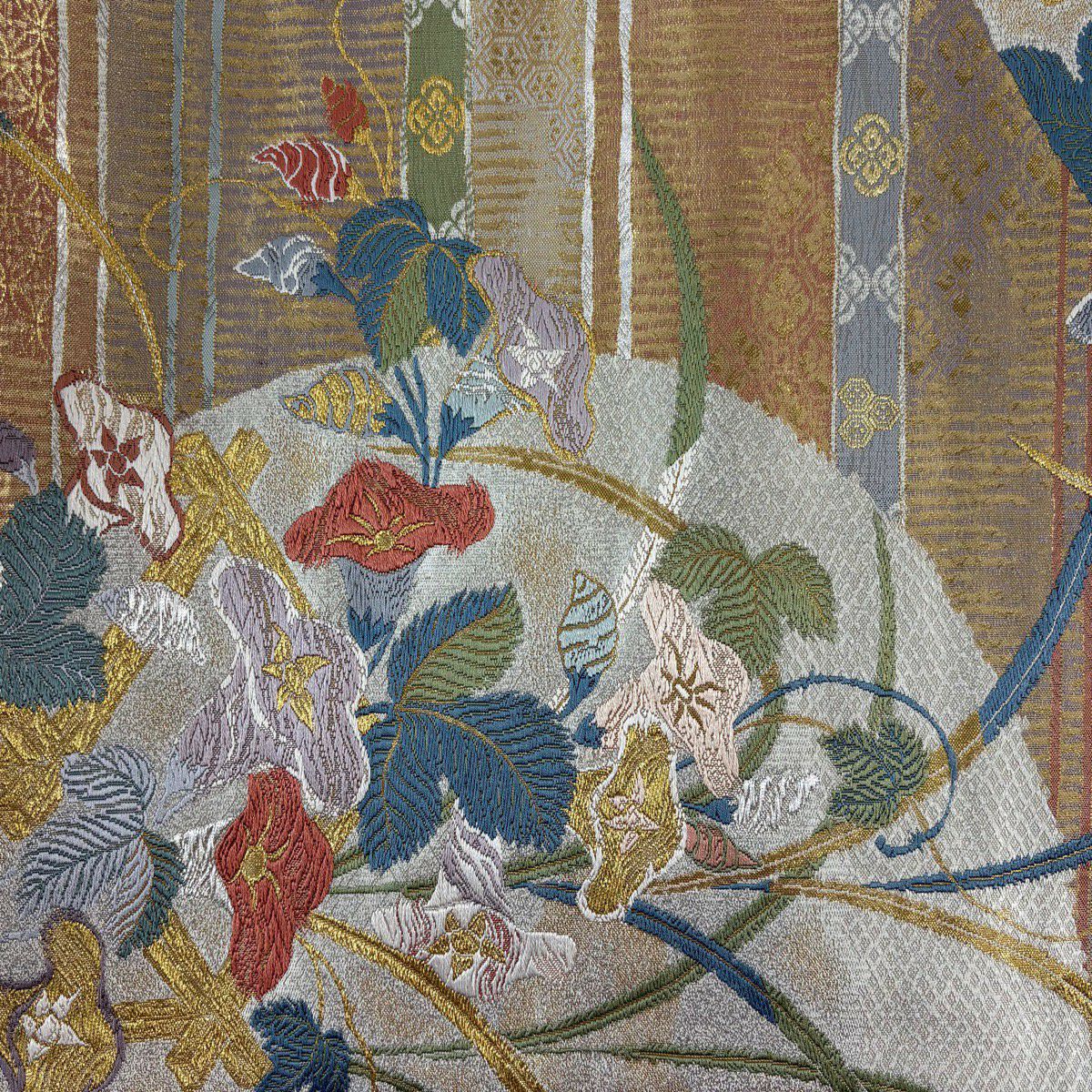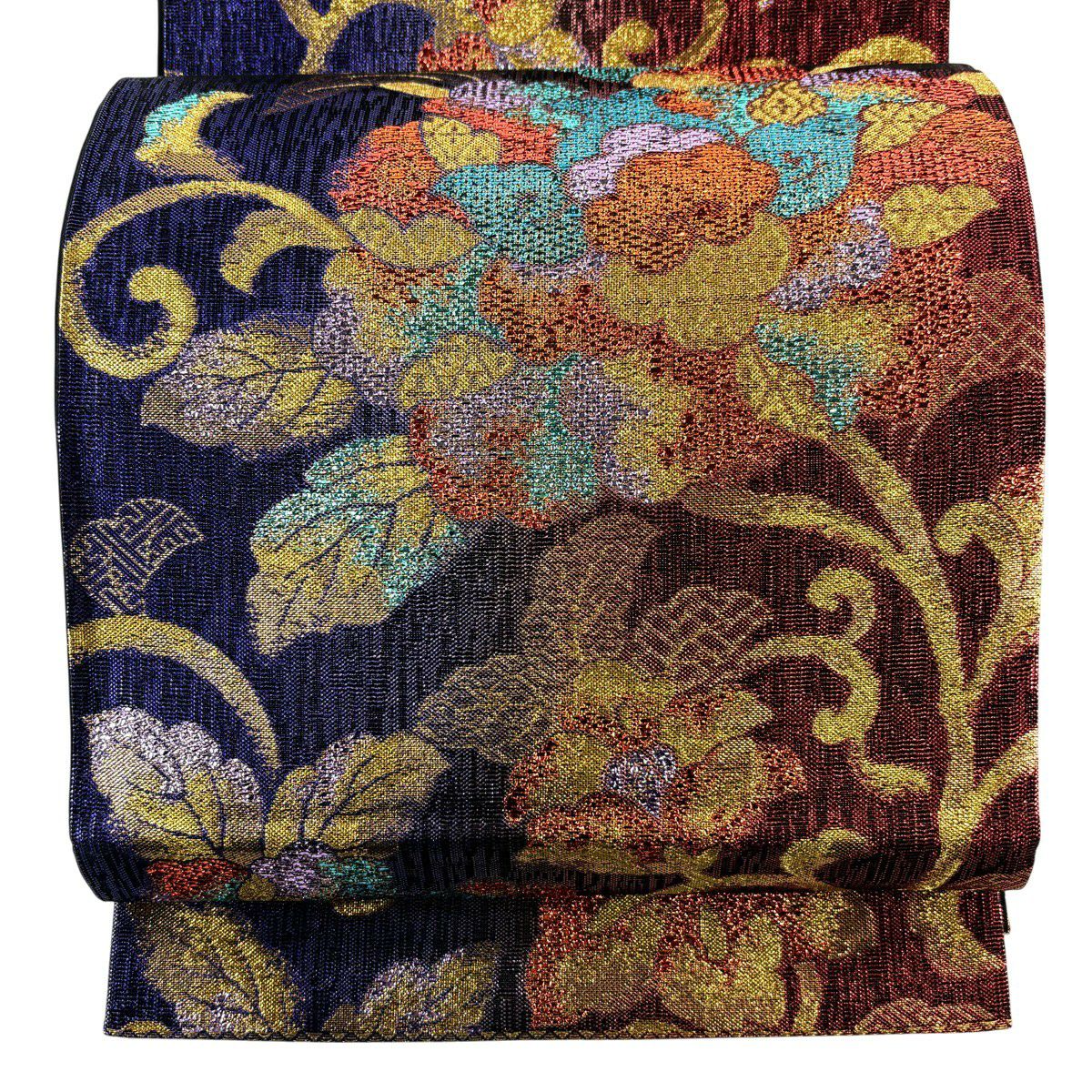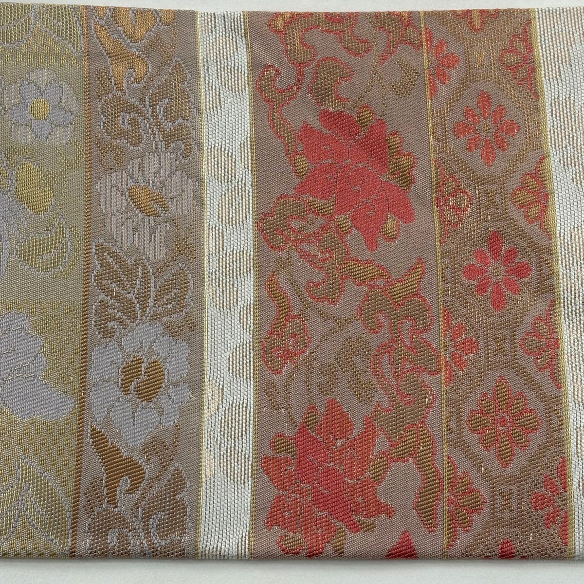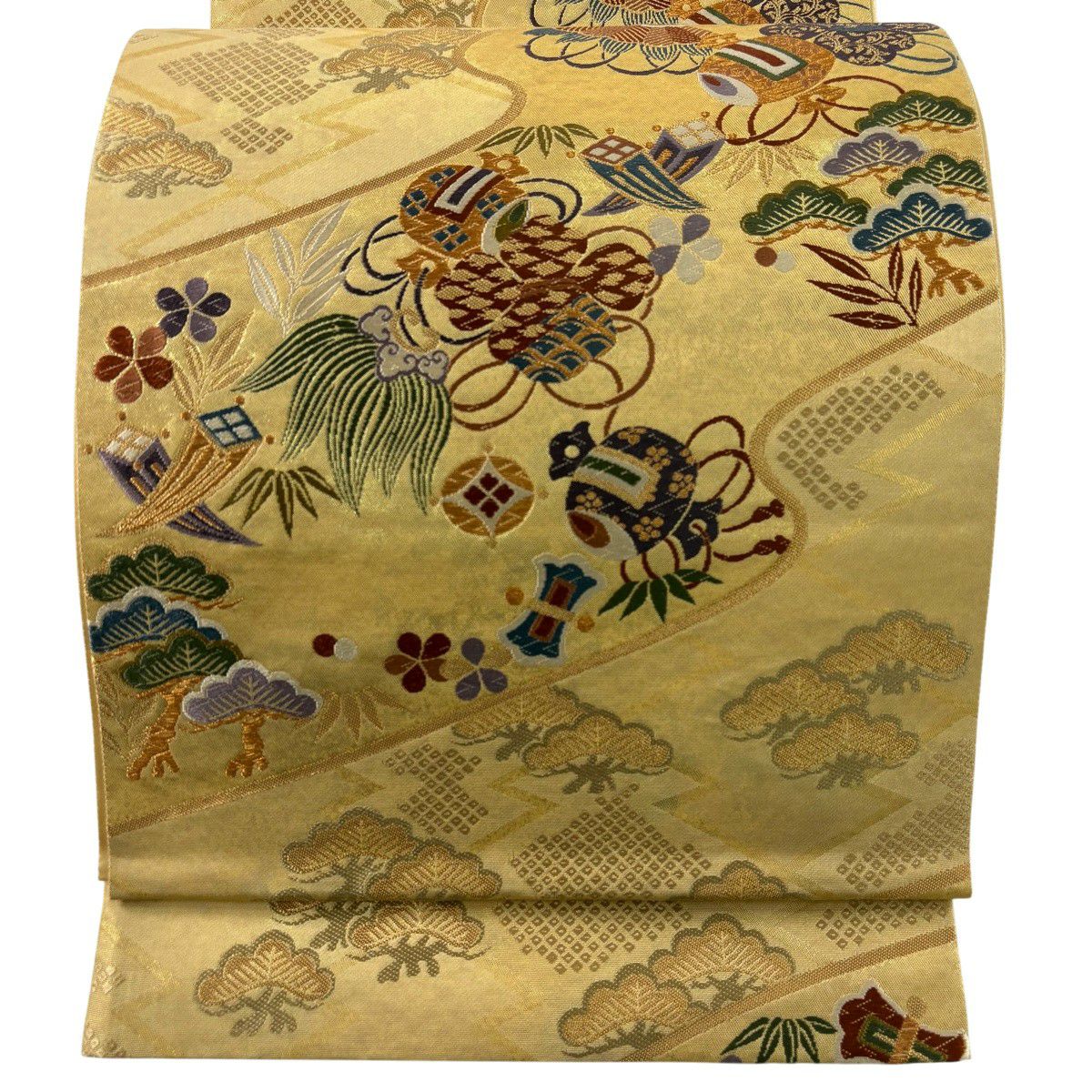【美品】 袋帯 秀品 遊扇草花文 金銀糸 箔 金茶 お太鼓柄 正絹