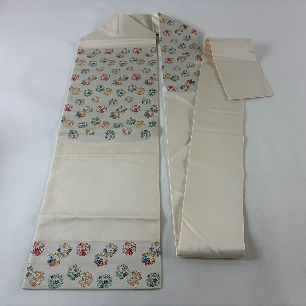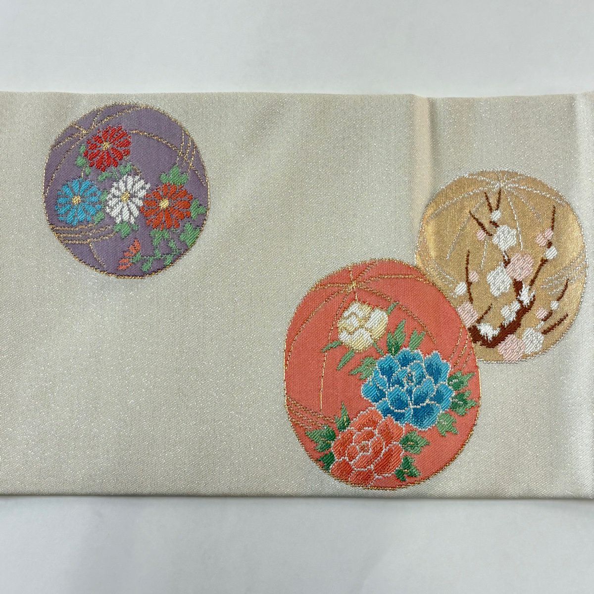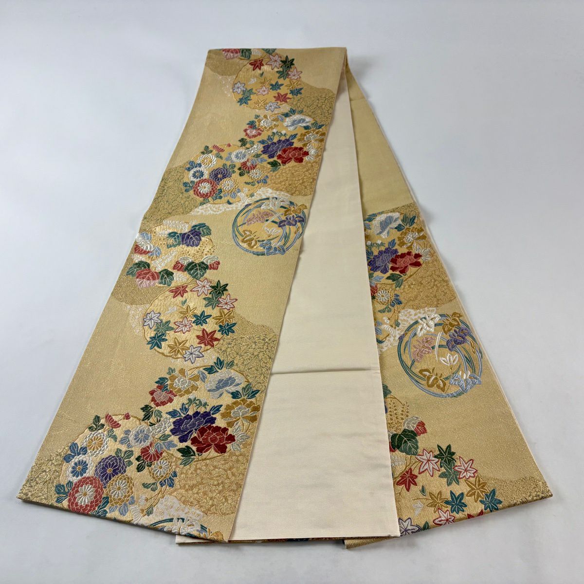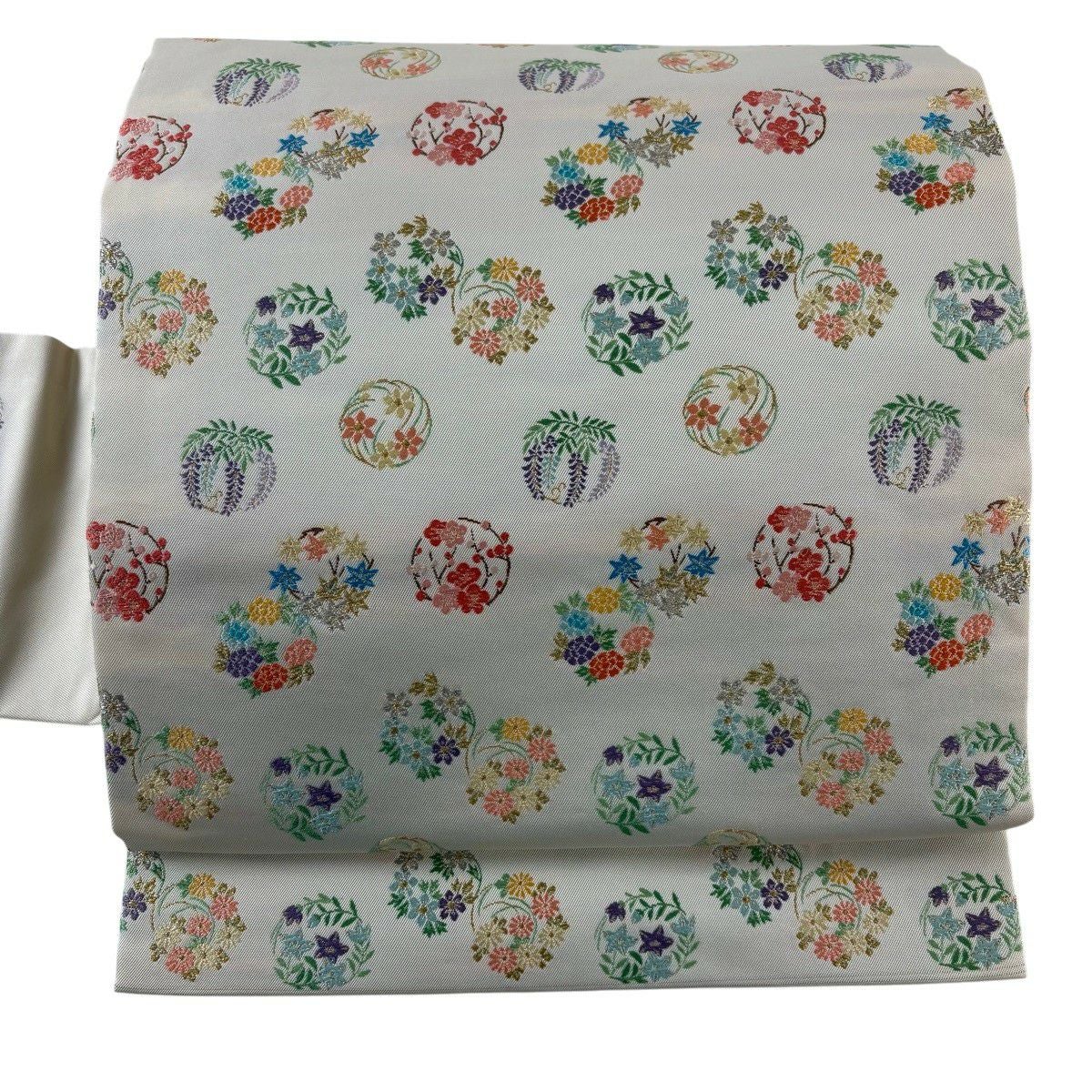 名古屋帯 秀品 関西仕立て 花丸文 金銀糸 刺繍 クリーム 正絹