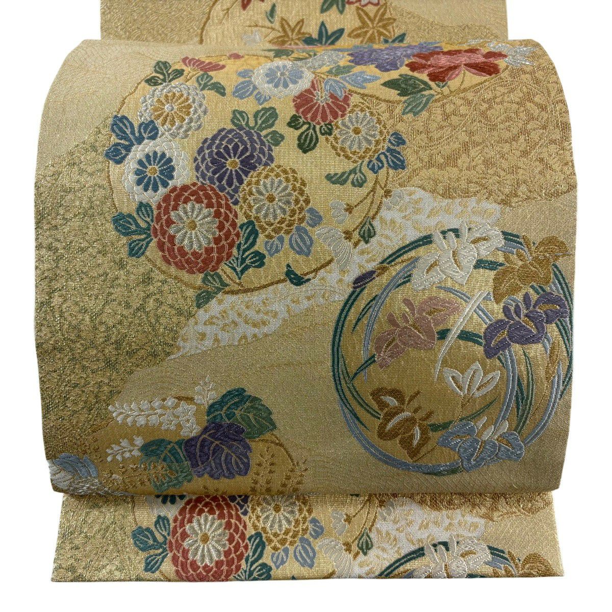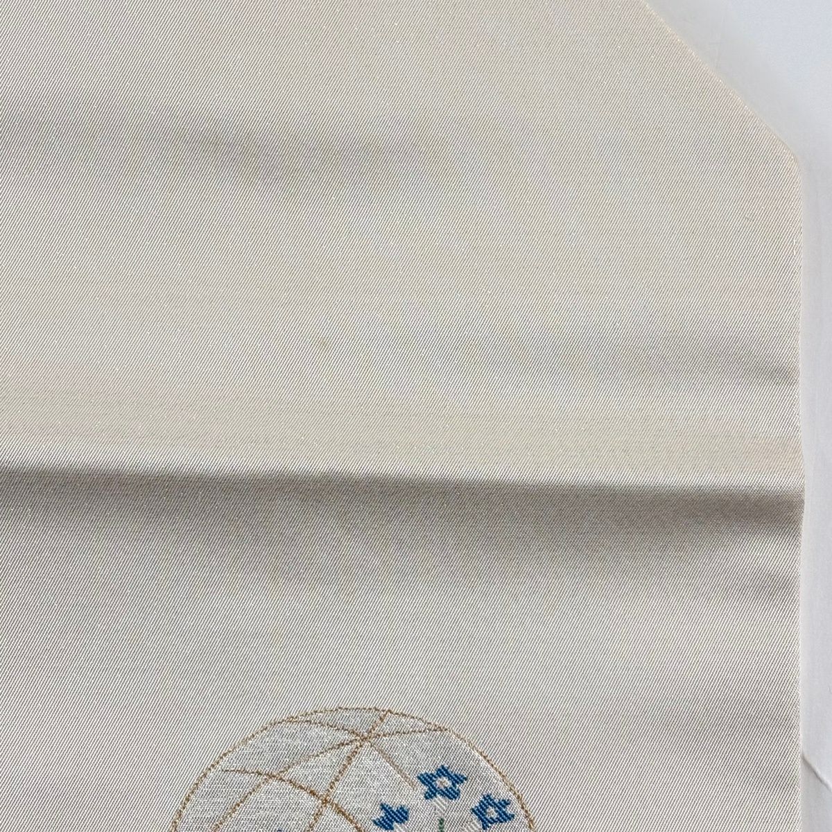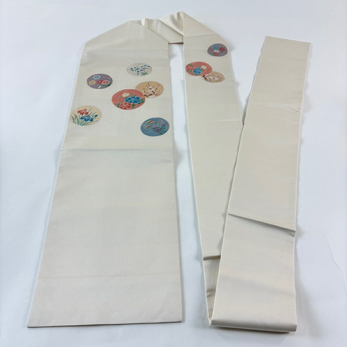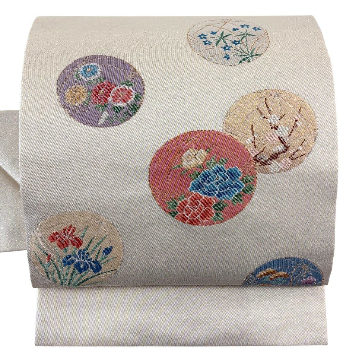 名古屋帯 秀品 関西仕立て 花丸文 金銀糸 刺繍 クリーム 正絹