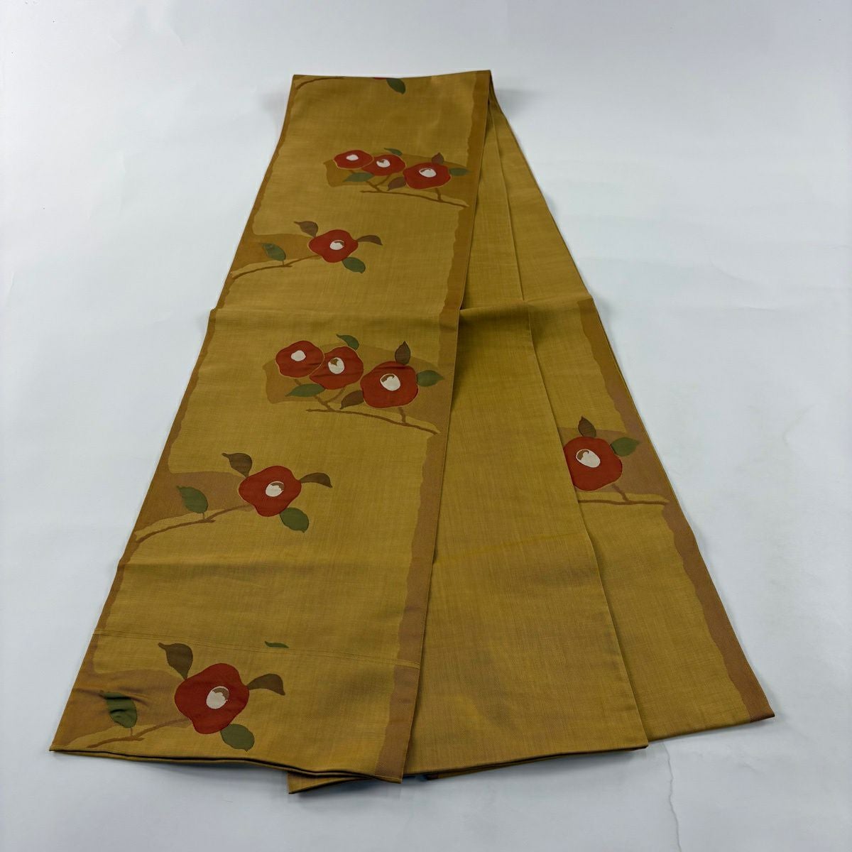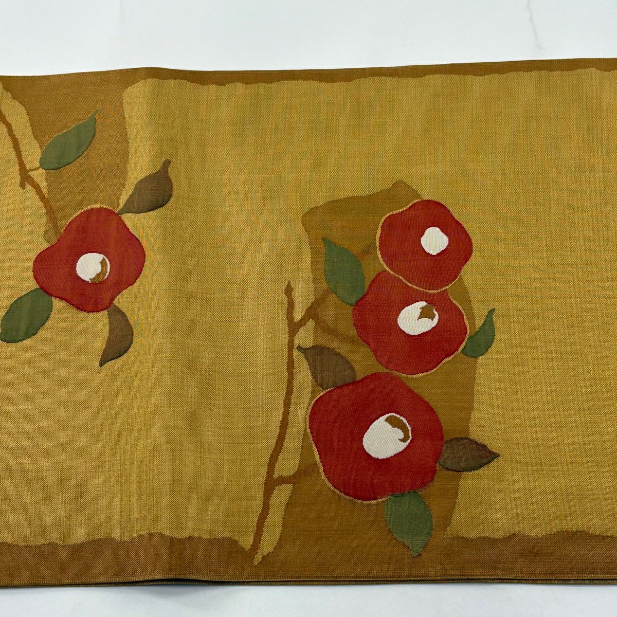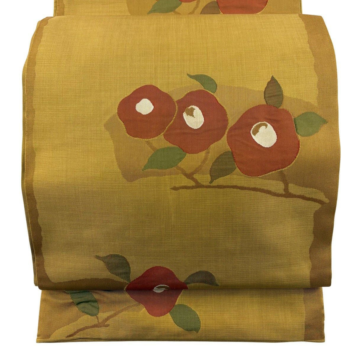 【美品】 袋帯 秀品 木屋太 落款あり 枝椿 黄土色 六通 正絹