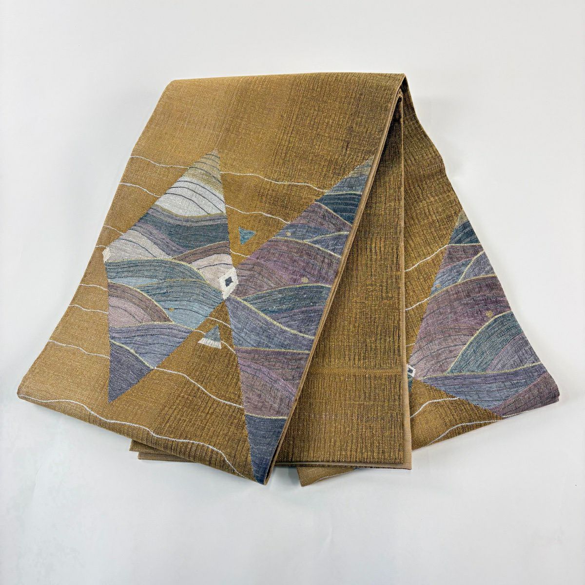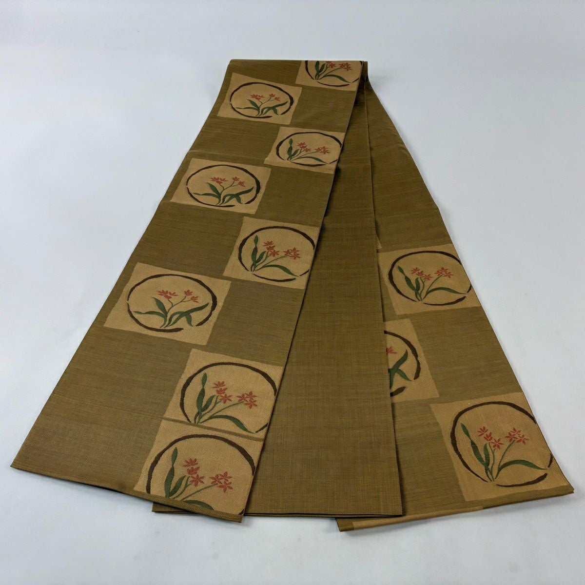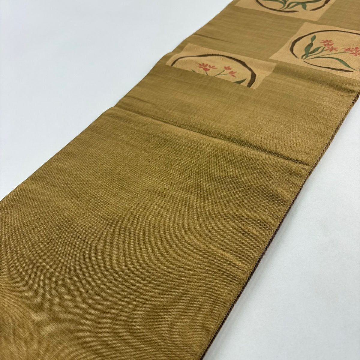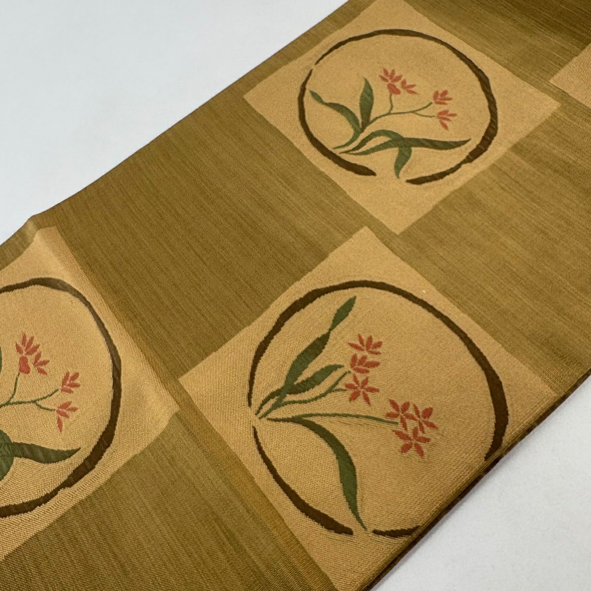 【美品】 袋帯 秀品 紬地 草花 幾何学模様 黄土色 六通 正絹