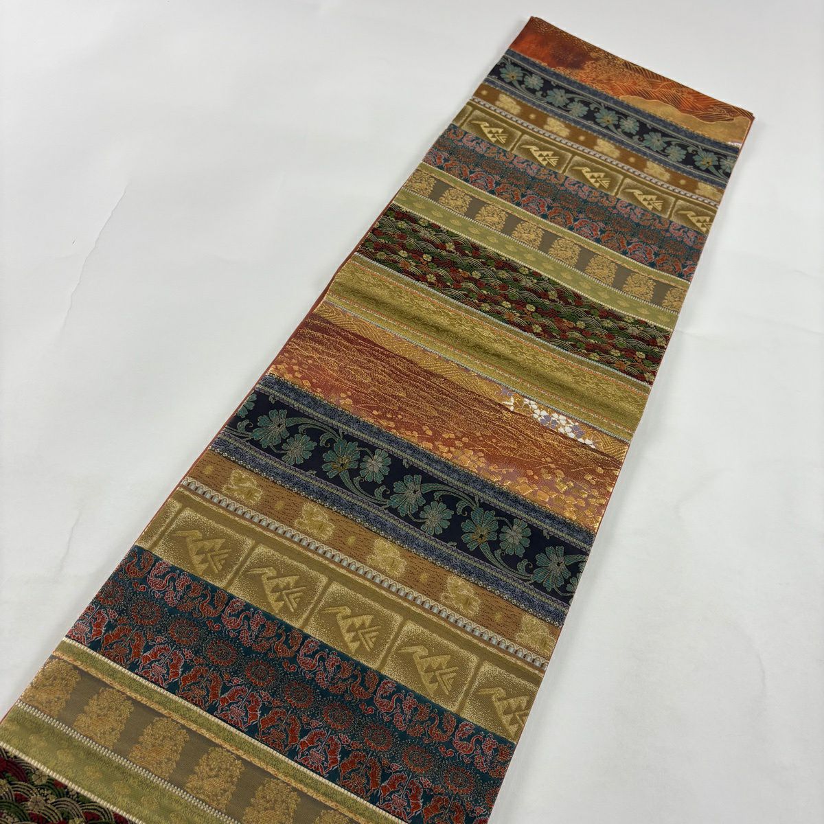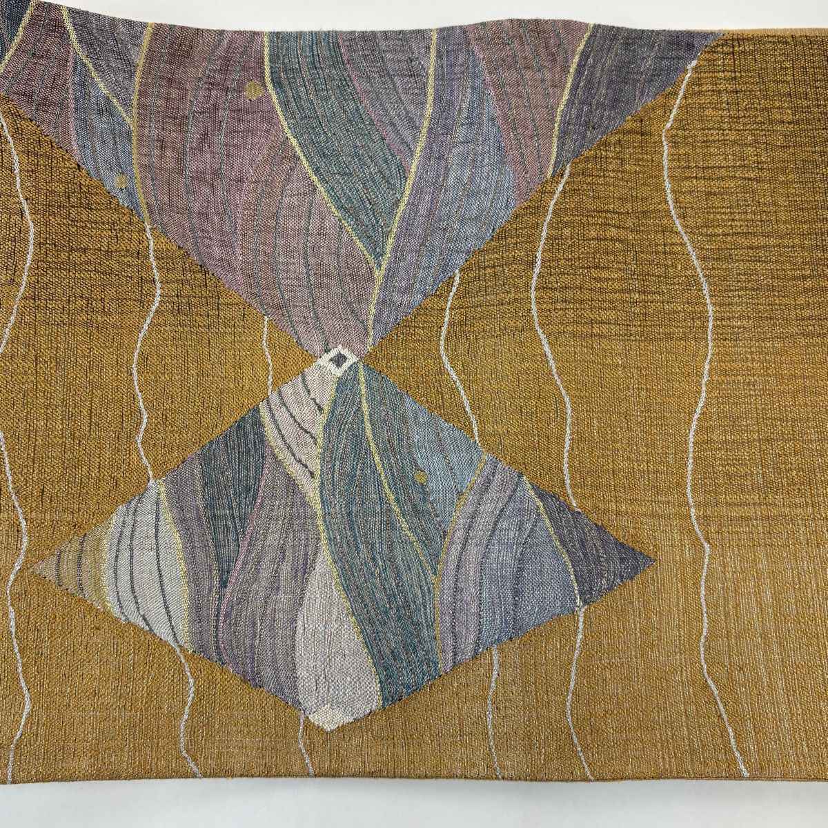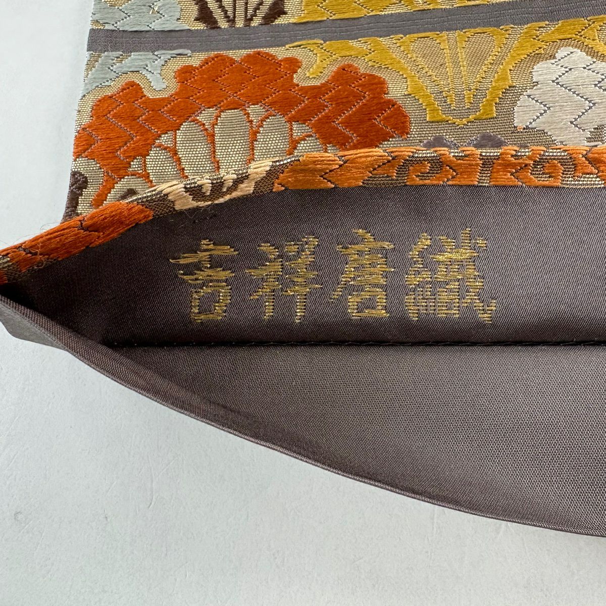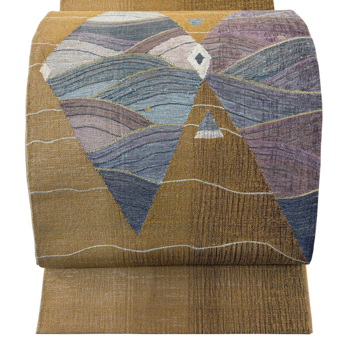 【美品】 袋帯 秀品 紬地 草花 幾何学模様 黄土色 六通 正絹