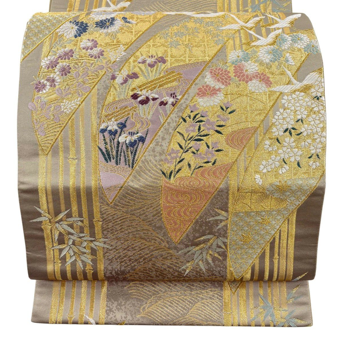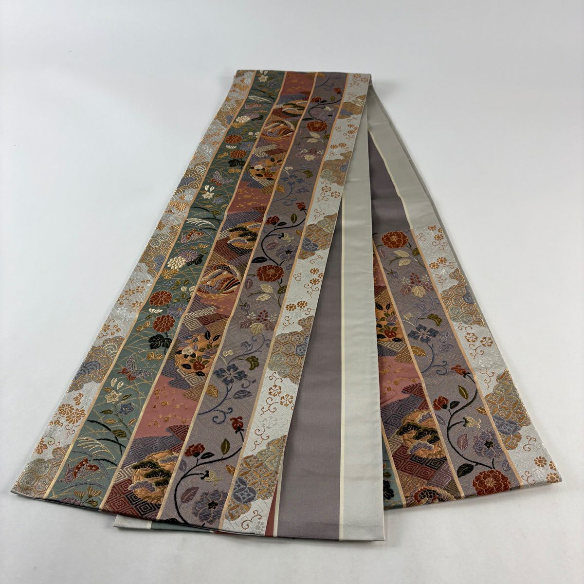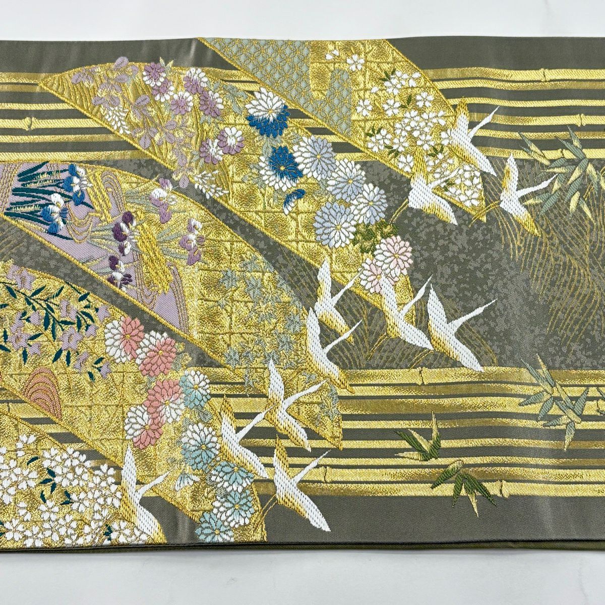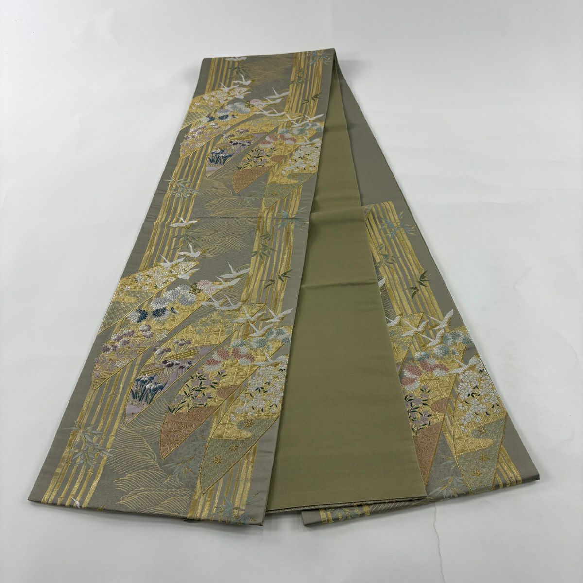 【美品】 袋帯 秀品 四季彩花 草花 鶴 金糸 灰緑 六通 正絹