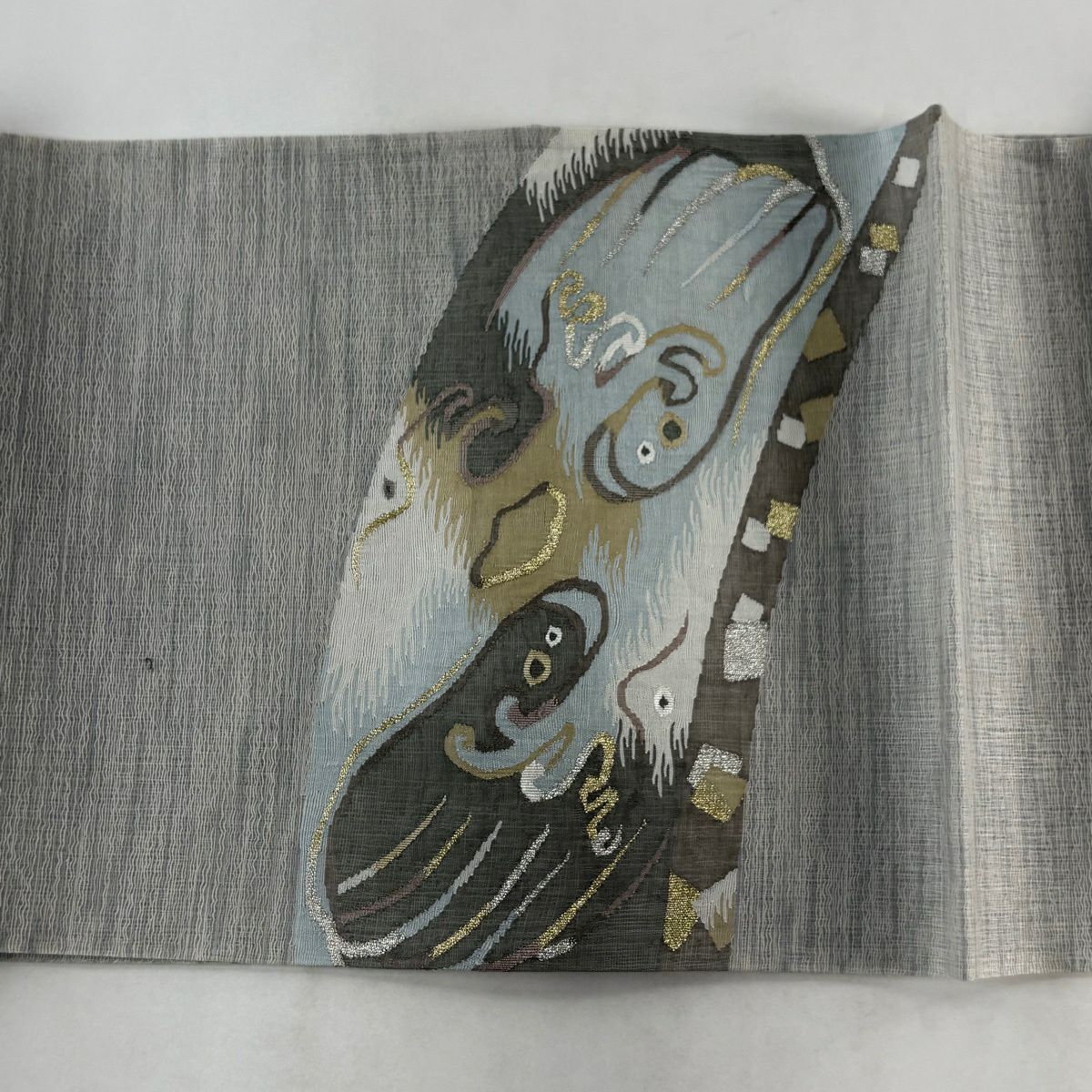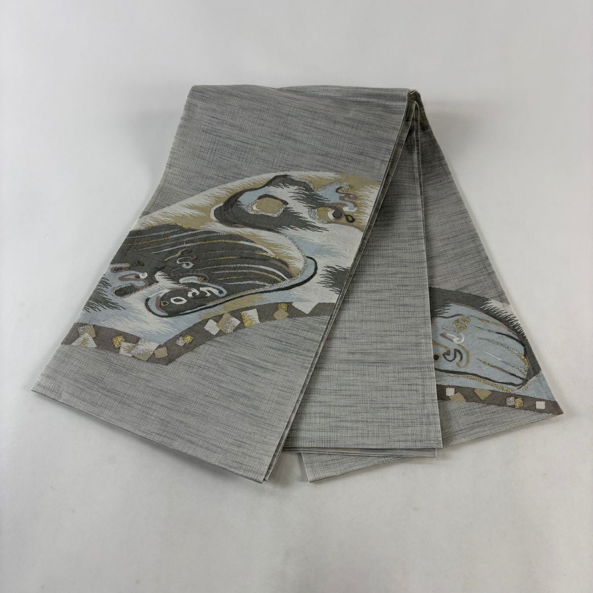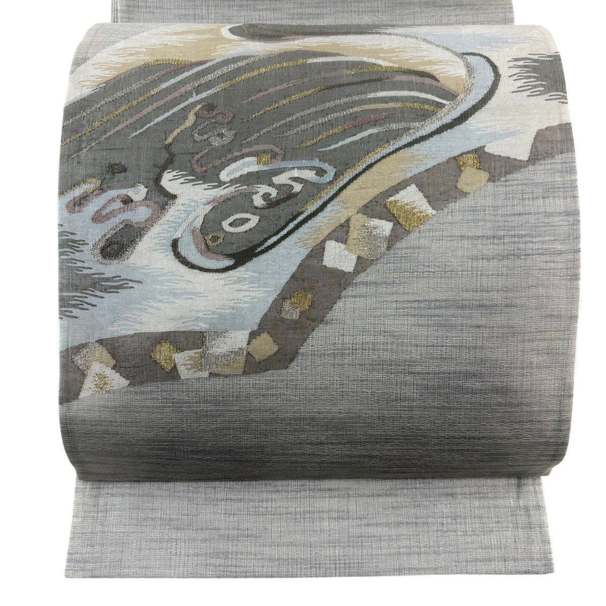【美品】 名古屋帯 秀品 八寸名古屋帯 夏帯 亀甲 幾何学 灰色 正絹