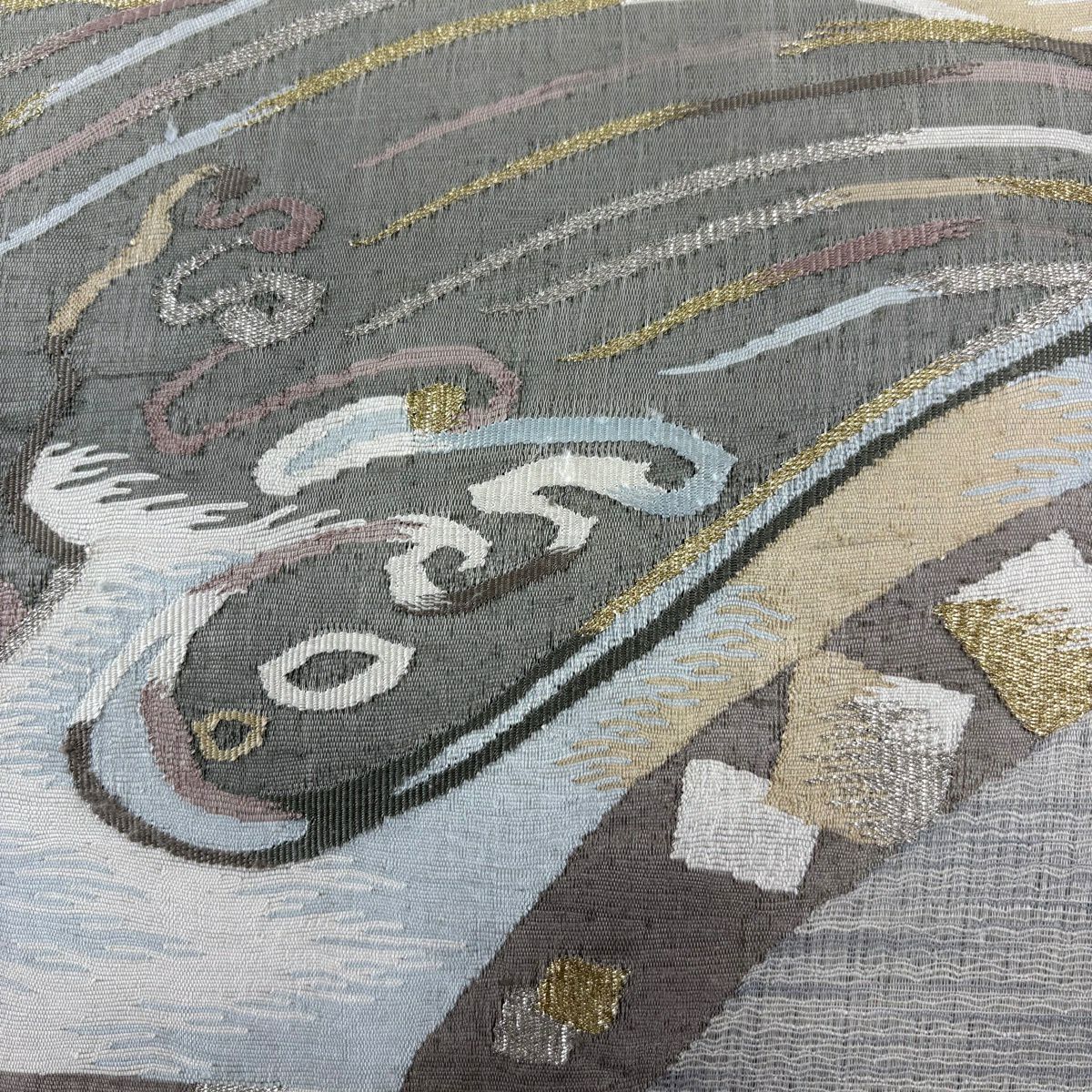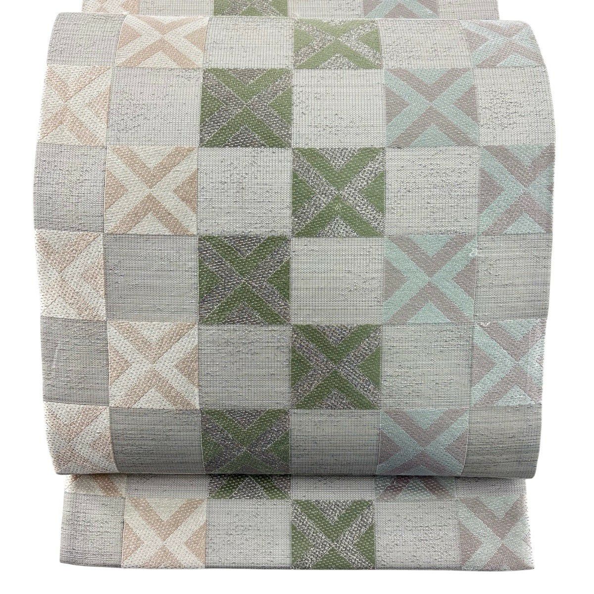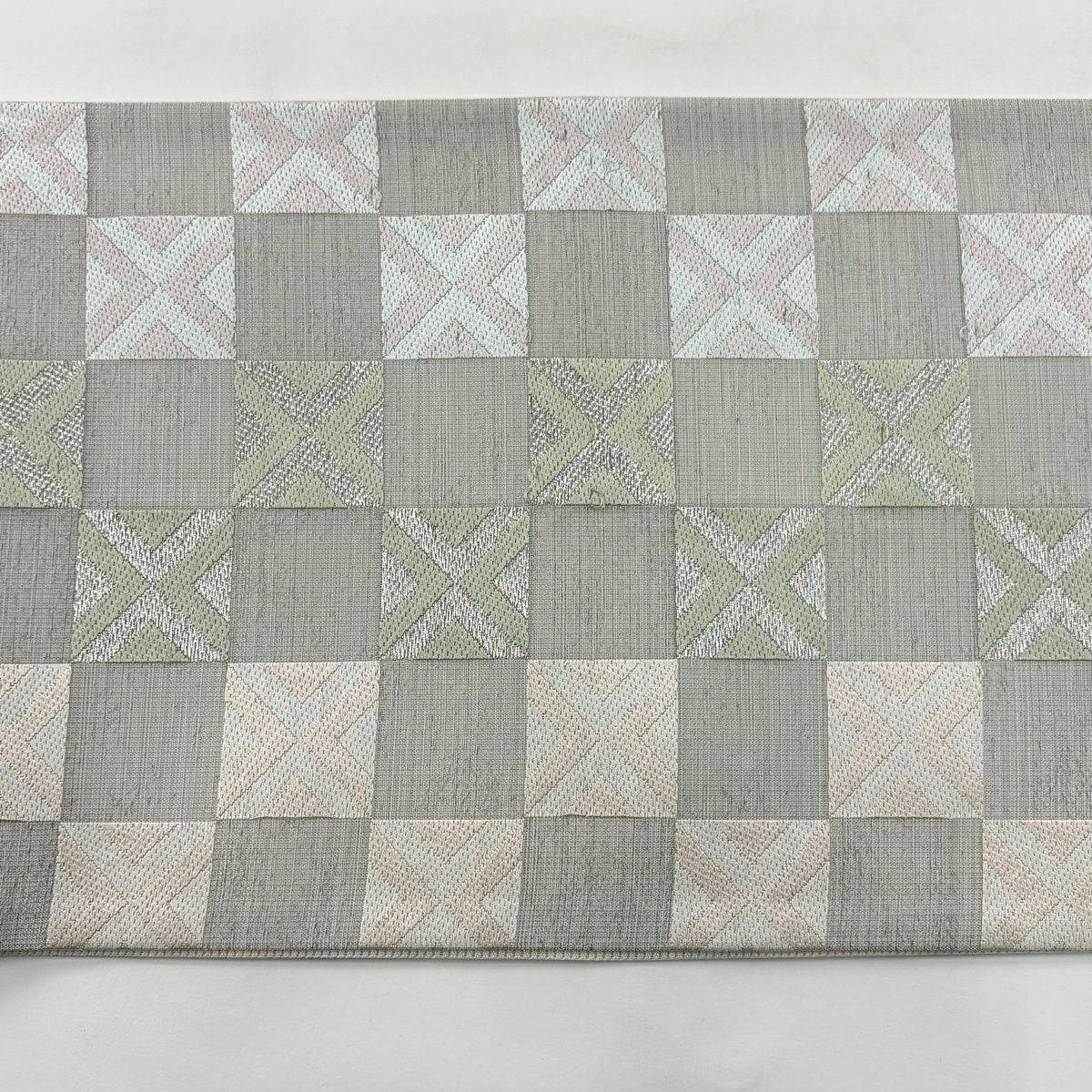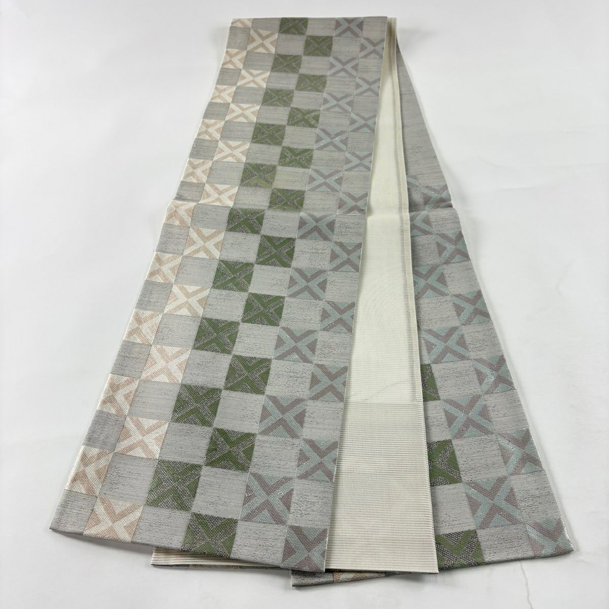 【美品】 袋帯 秀品 市松 幾何学 銀糸 刺繍 灰色 六通 正絹