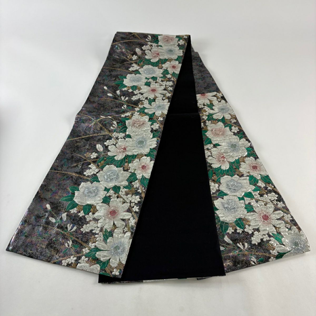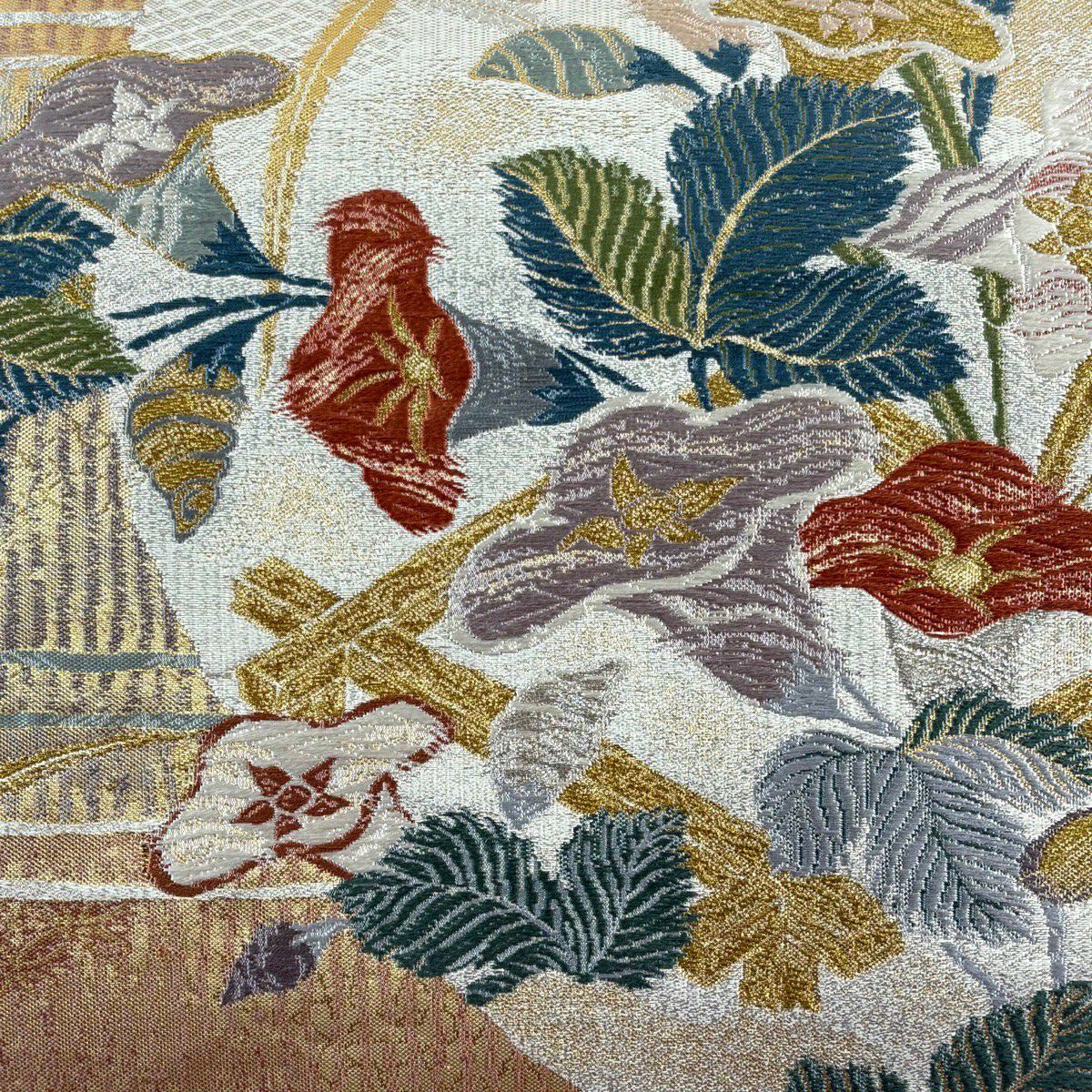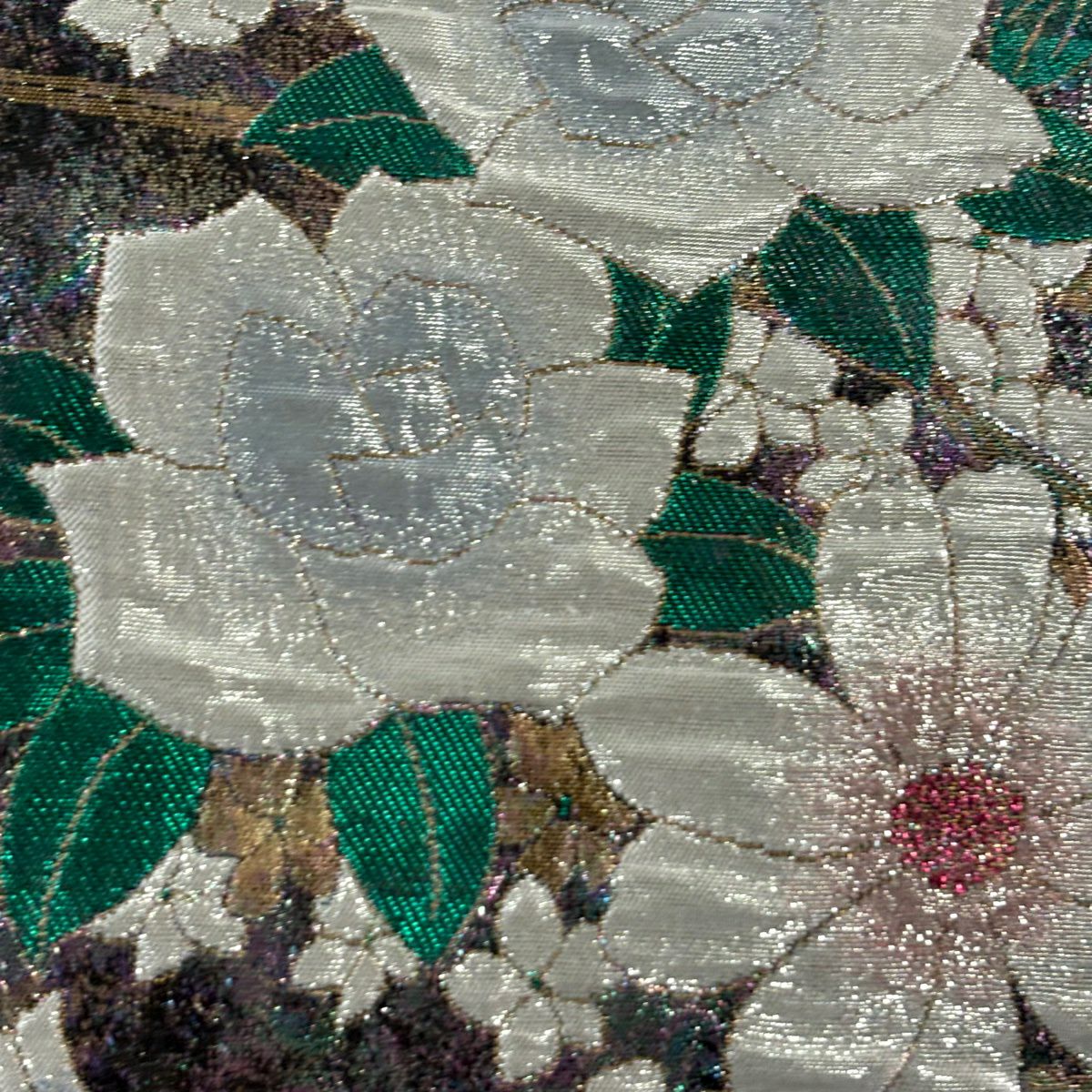【美品】 袋帯 秀品 振袖向き 草花 箔 ラメ 銀色 六通 正絹