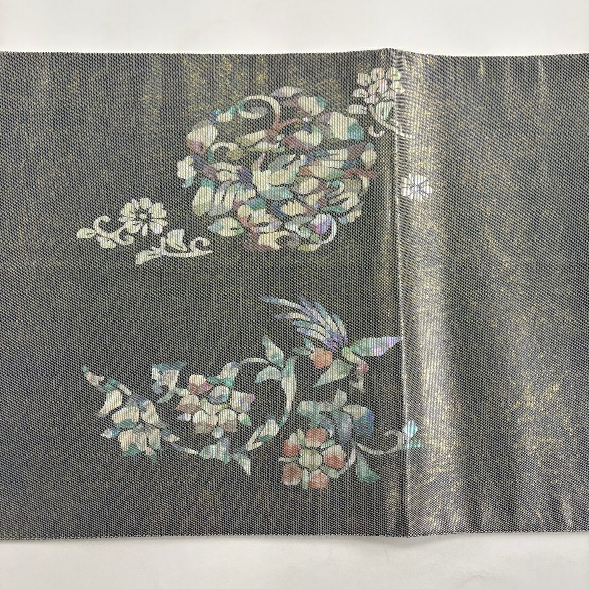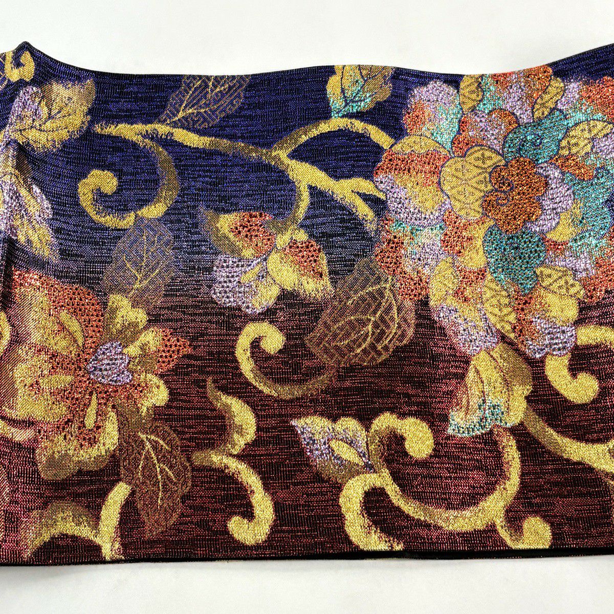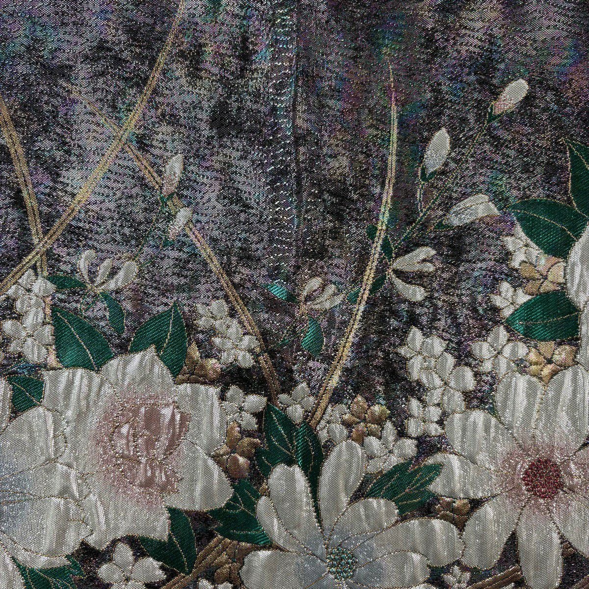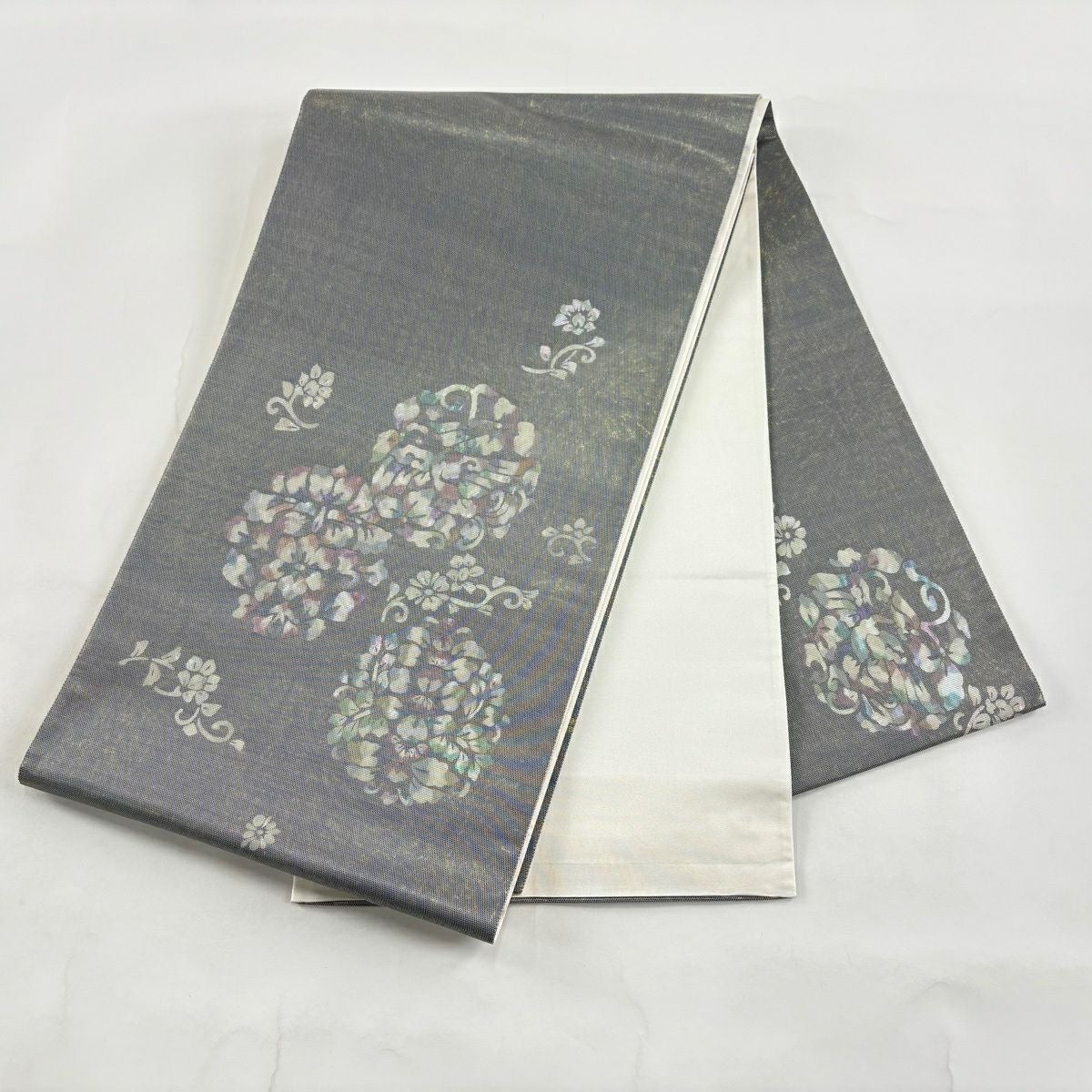 【美品】 袋帯 秀品 振袖向き 草花 箔 ラメ 銀色 六通 正絹