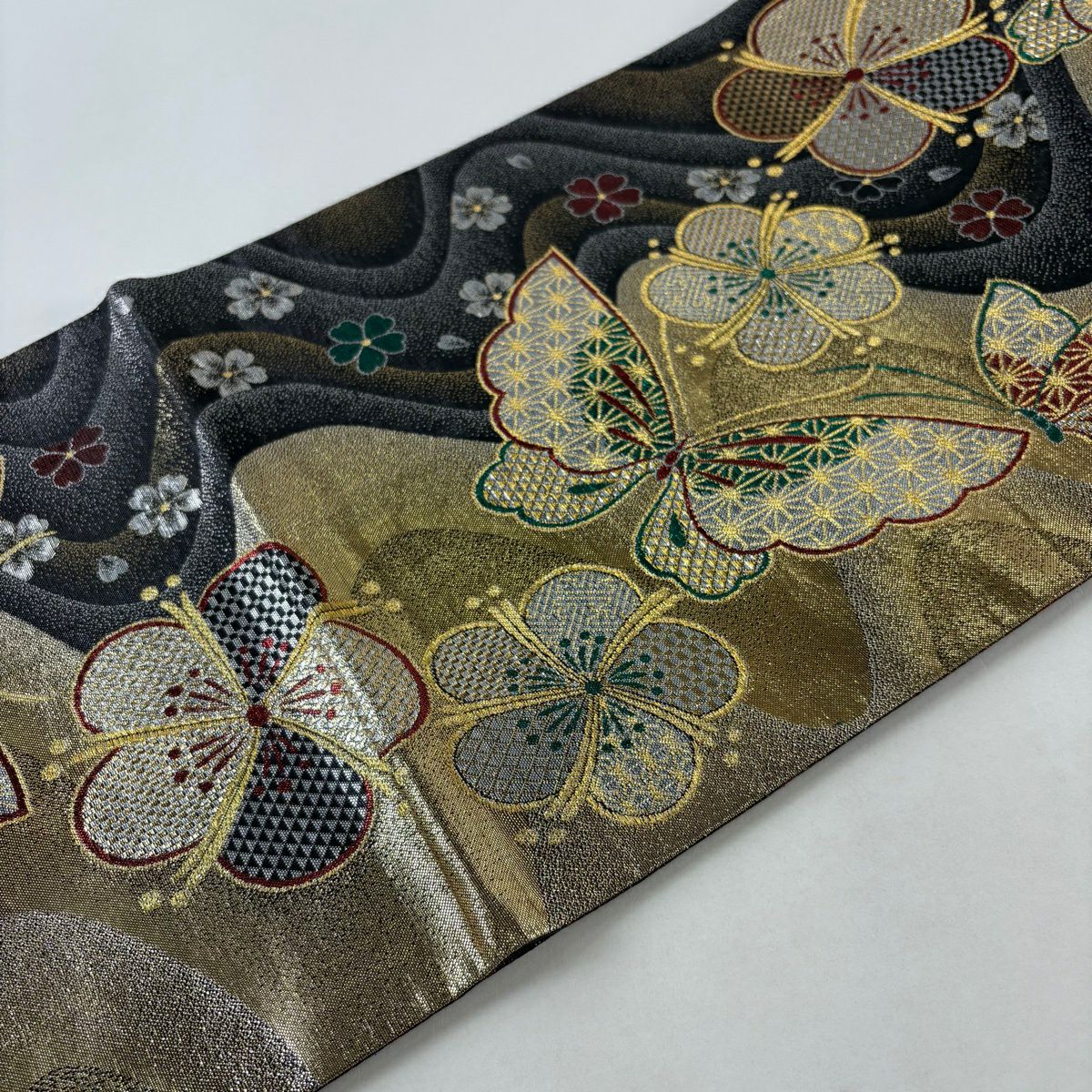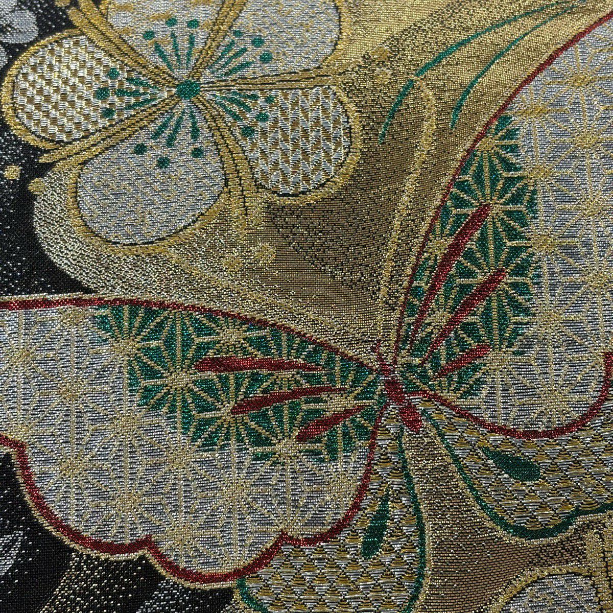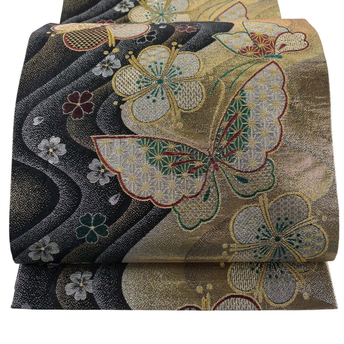【美品】 袋帯 秀品 振袖向き 桜 蝶 金糸 箔 金色 六通 正絹