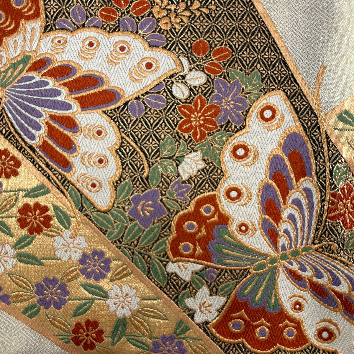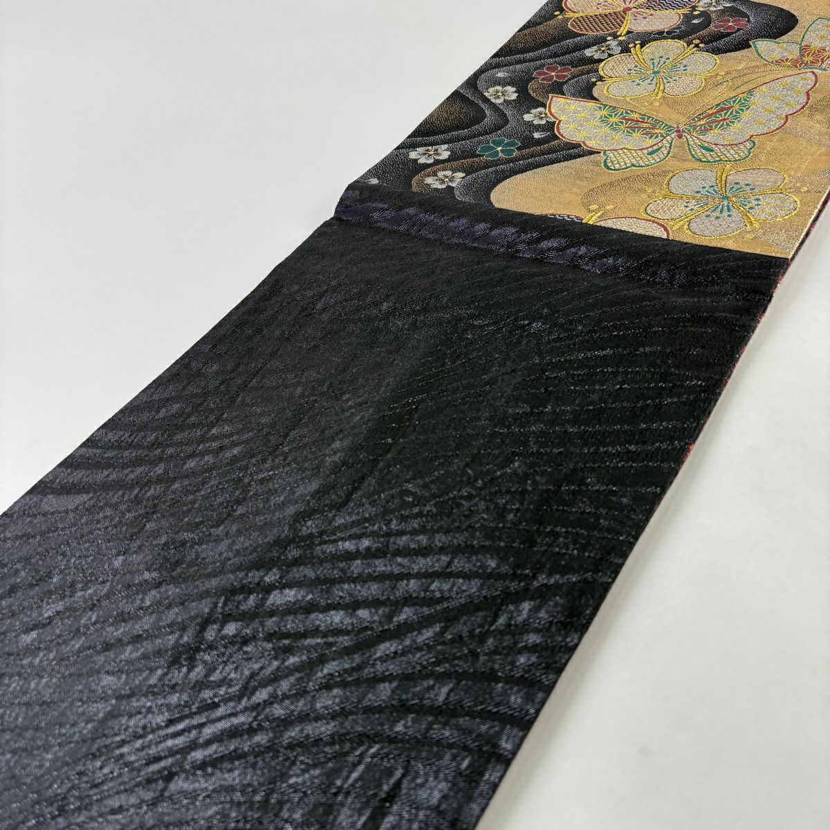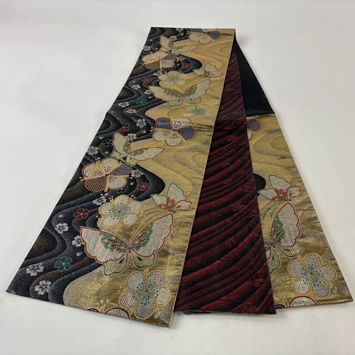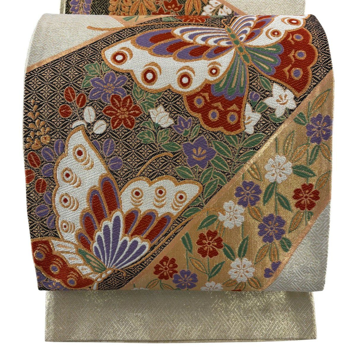【美品】 袋帯 秀品 振袖向き 桜 蝶 金糸 箔 金色 六通 正絹