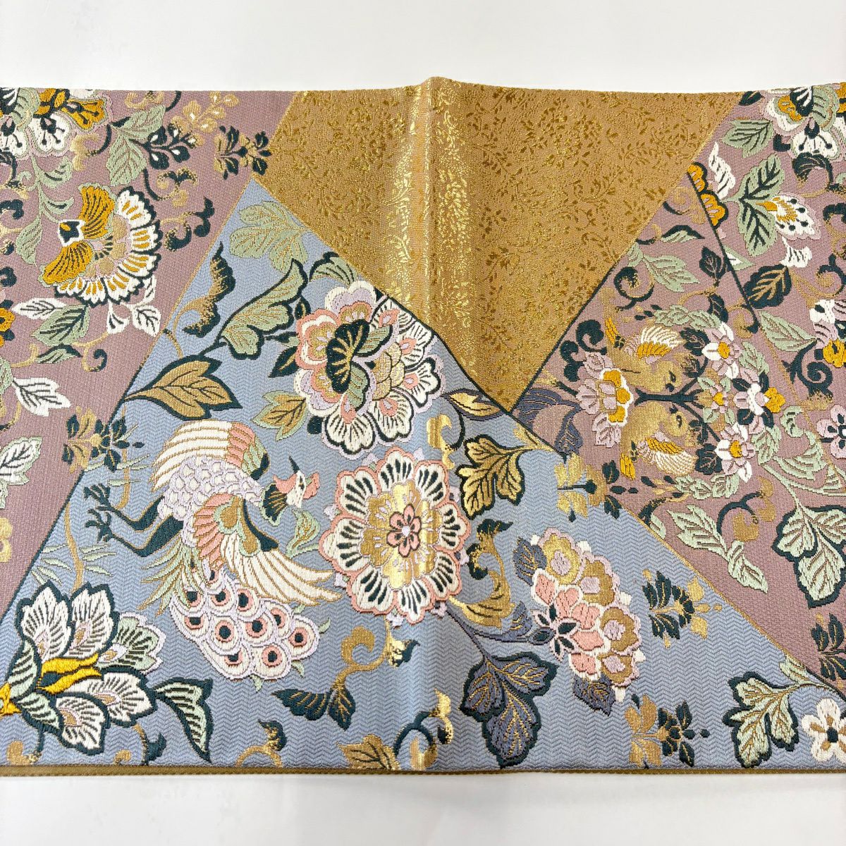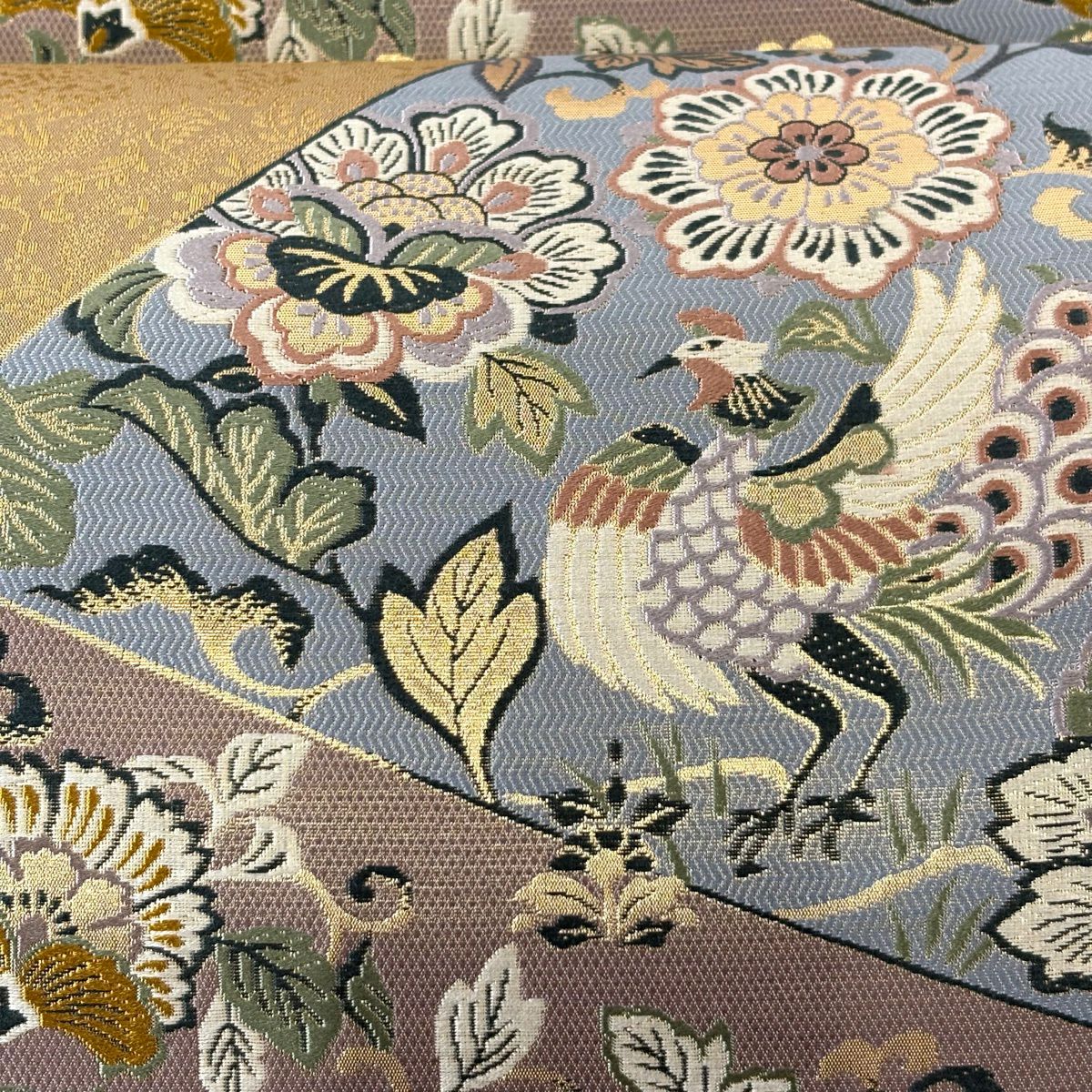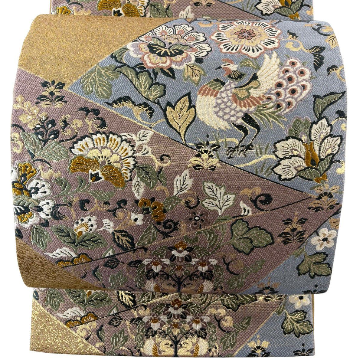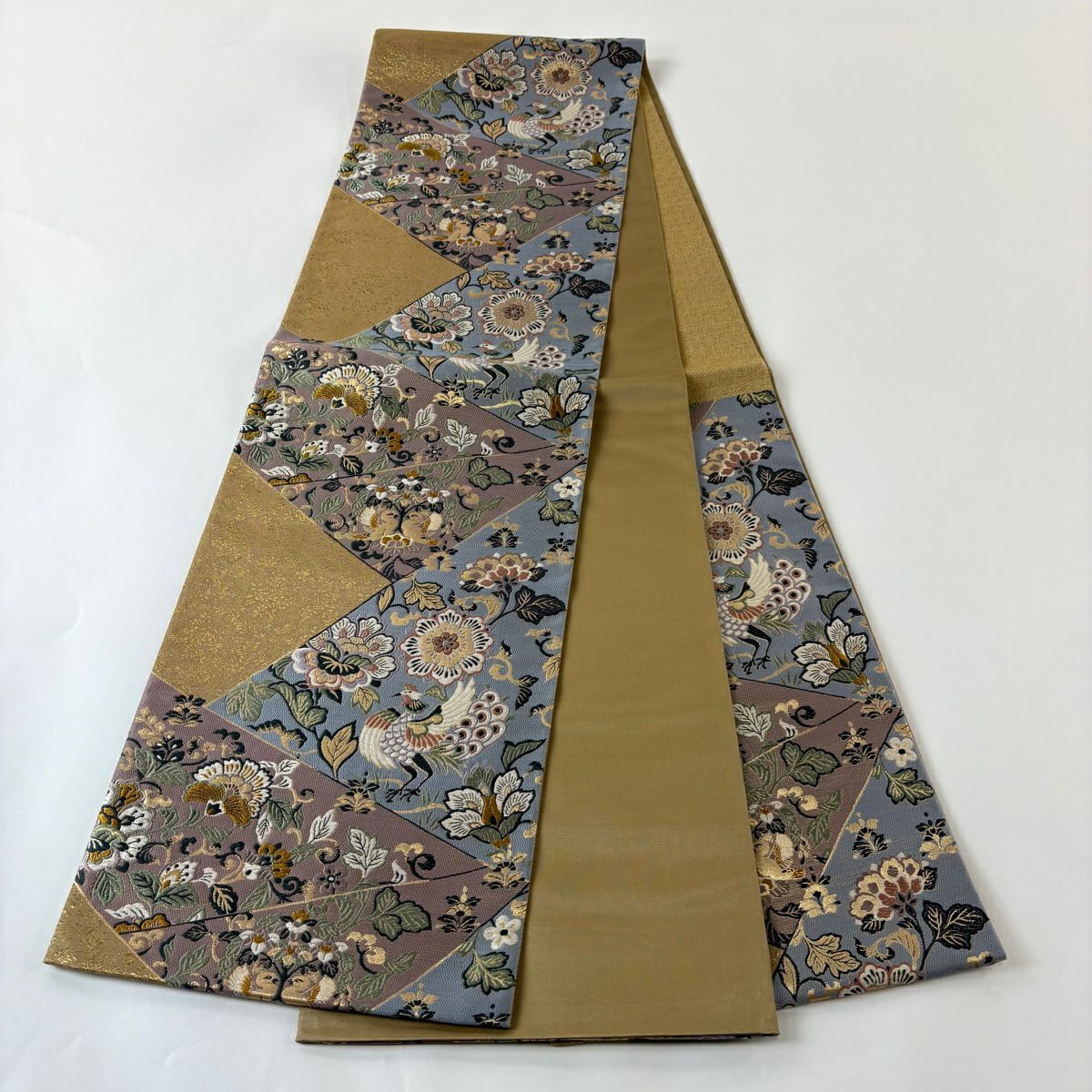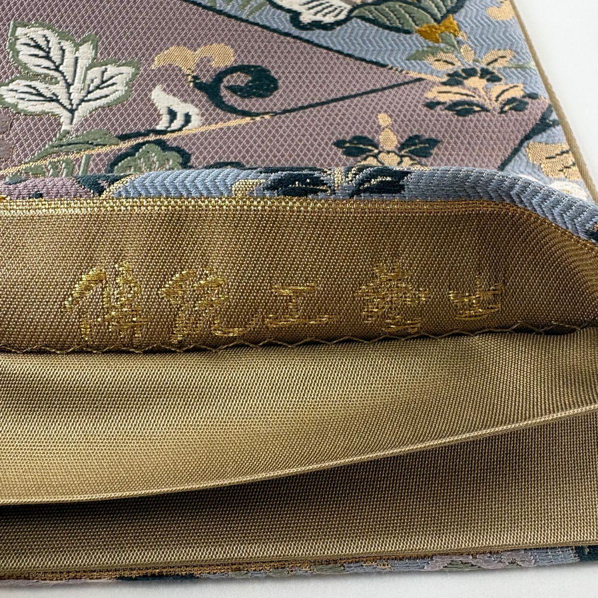 【美品】 袋帯 秀品 向かい鳥 草花 箔 金糸 灰紫 六通 正絹