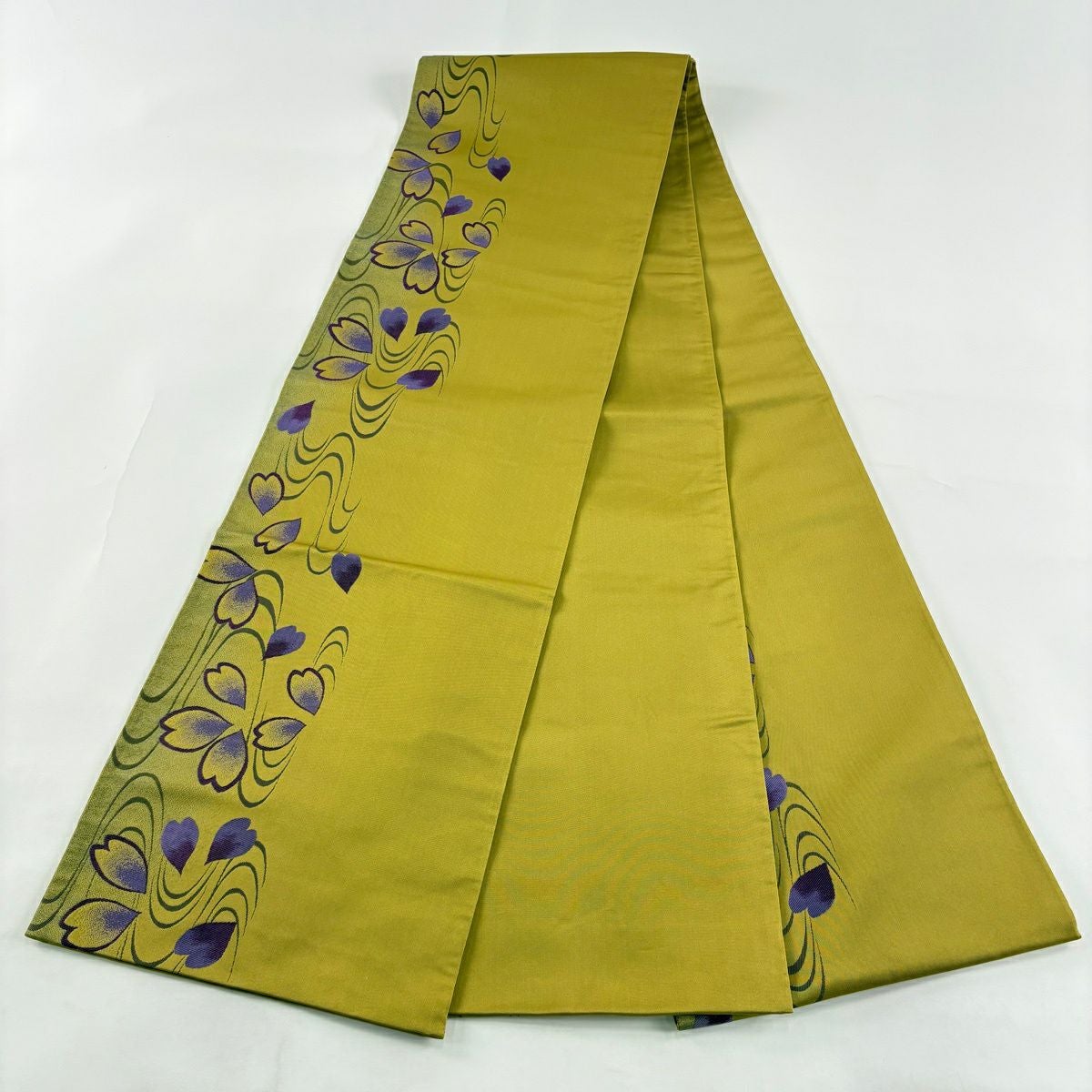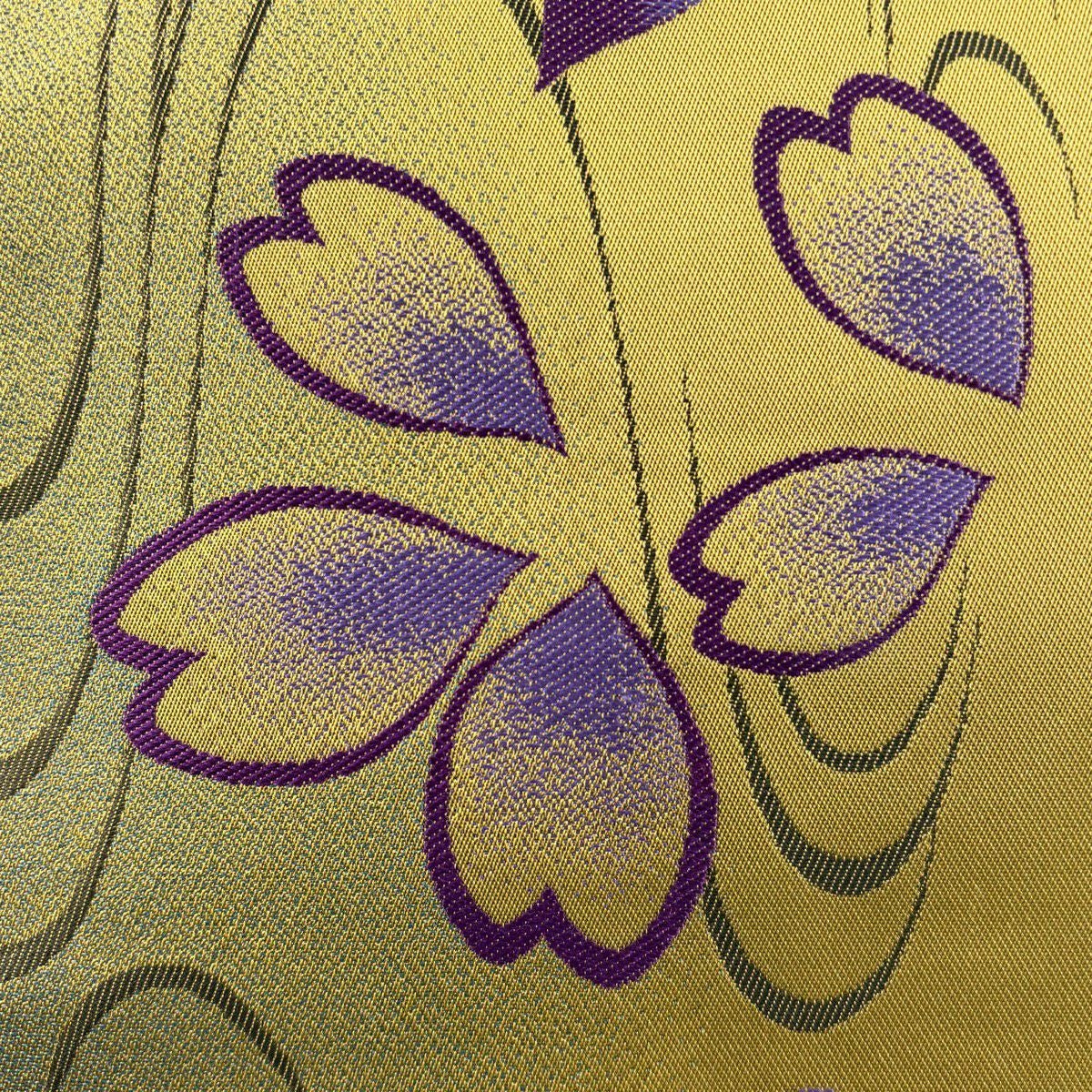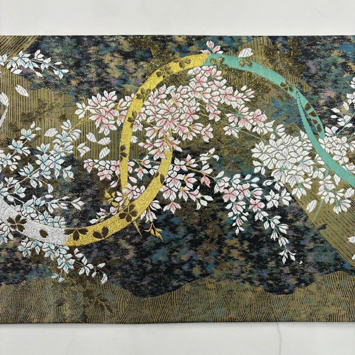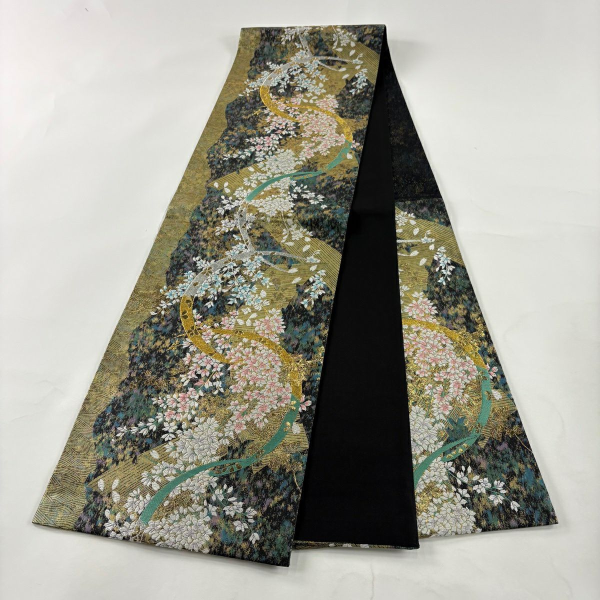 袋帯 秀品 落款あり 桜の花びら 流水 刺繍 黄土色 六通 正絹