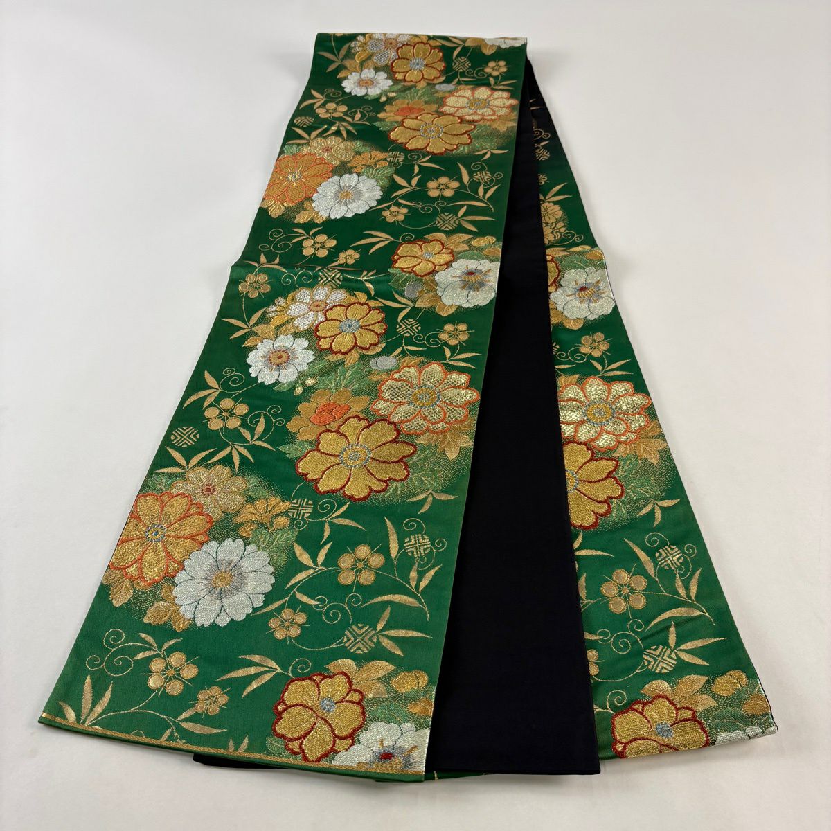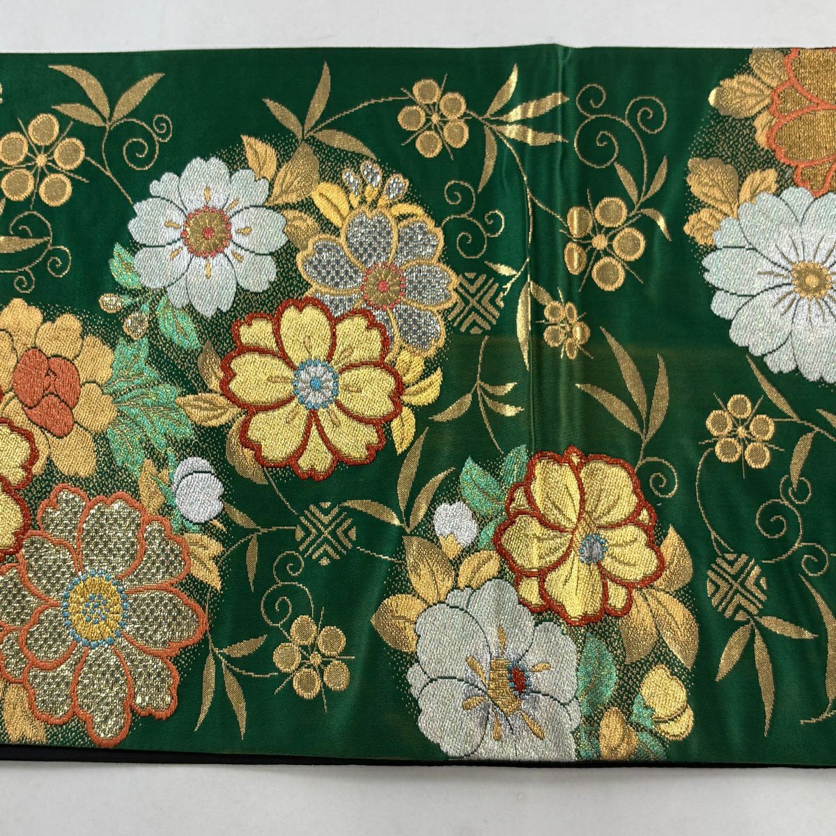 袋帯 秀品 振袖向き 花丸文 笹蔓 金糸 箔 緑 お太鼓柄 正絹