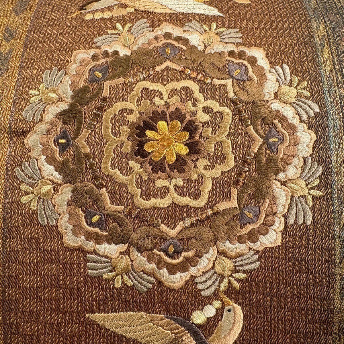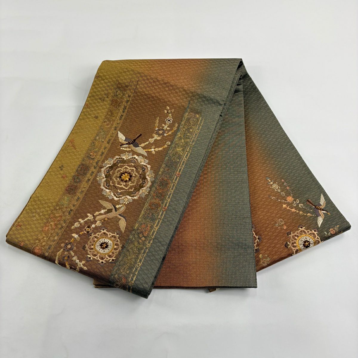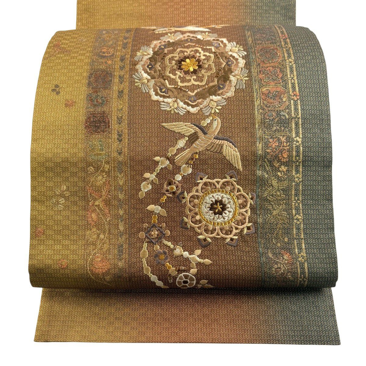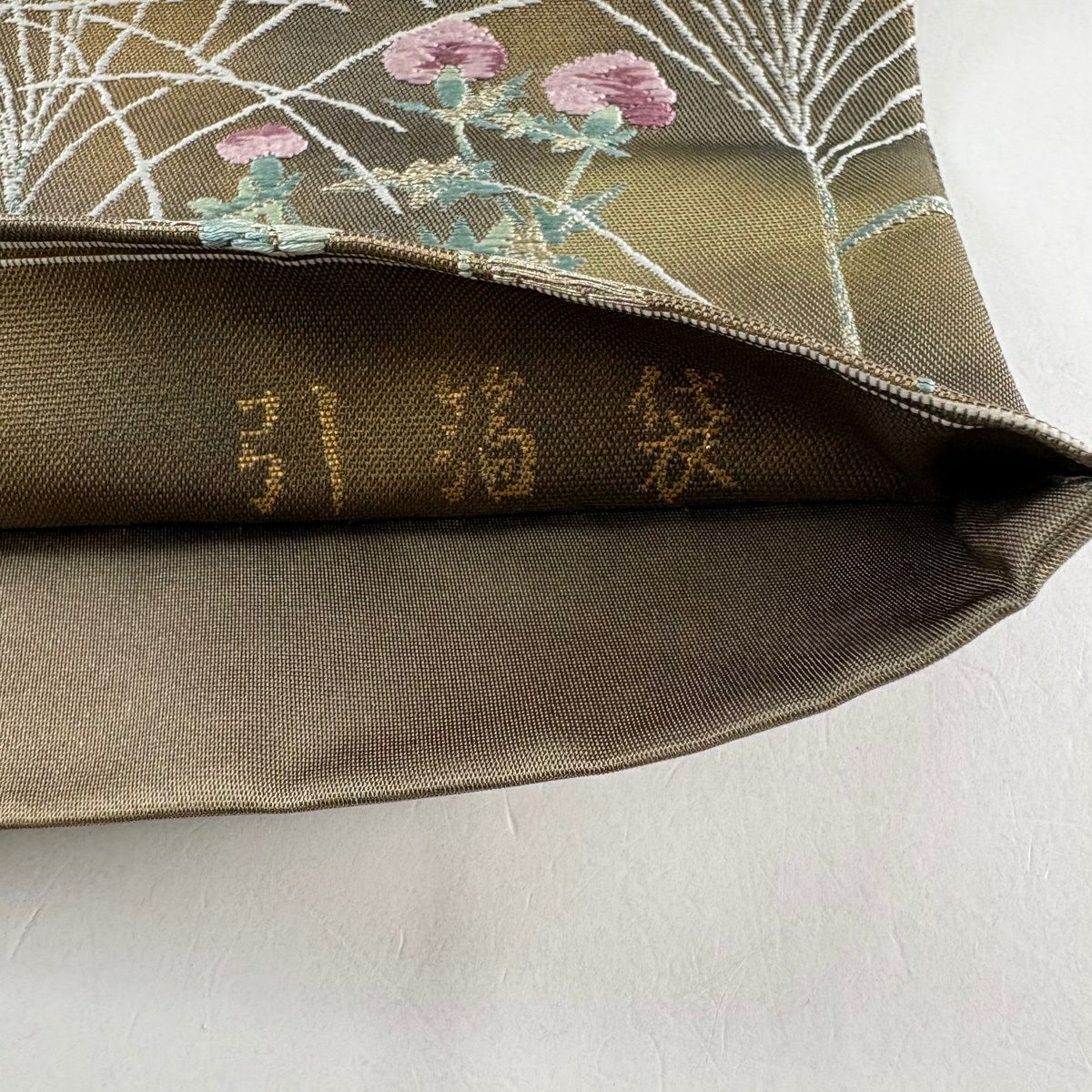 【美品】 袋帯 秀品 珈琲染 花 金銀糸 箔 茶緑色 六通 正絹