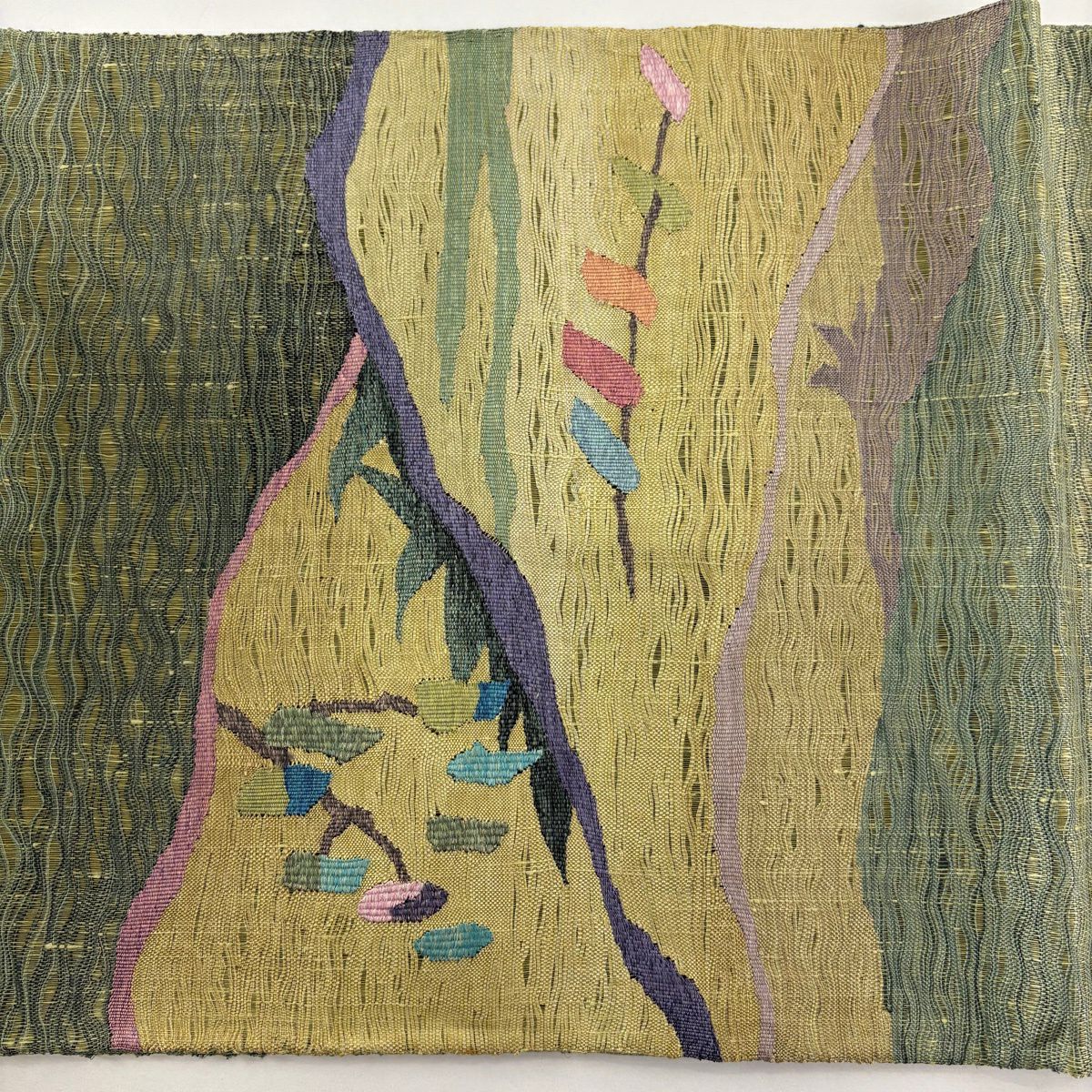 【美品】 袋帯 秀品 樹木 葉柄 金銀糸 黄緑色 お太鼓柄 正絹