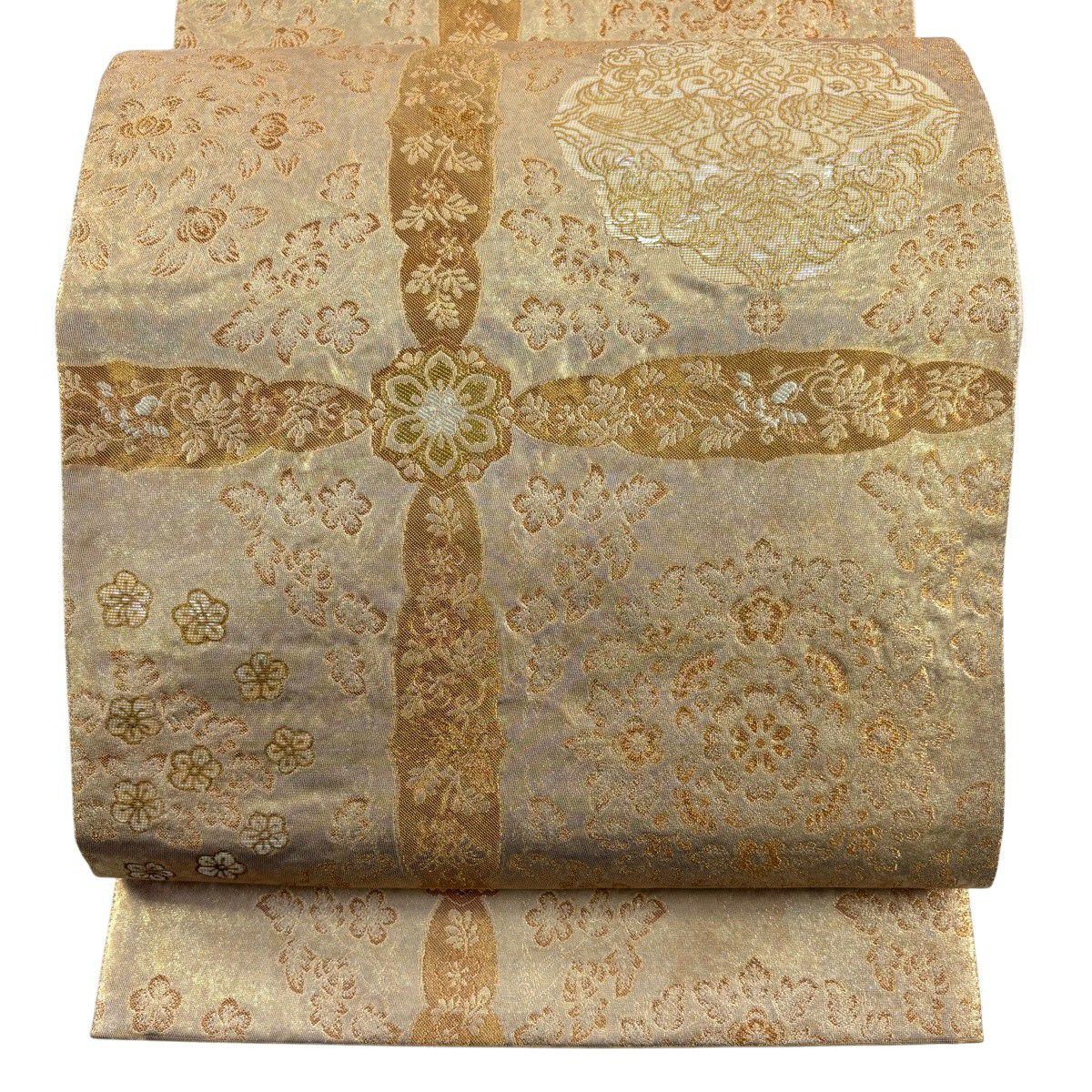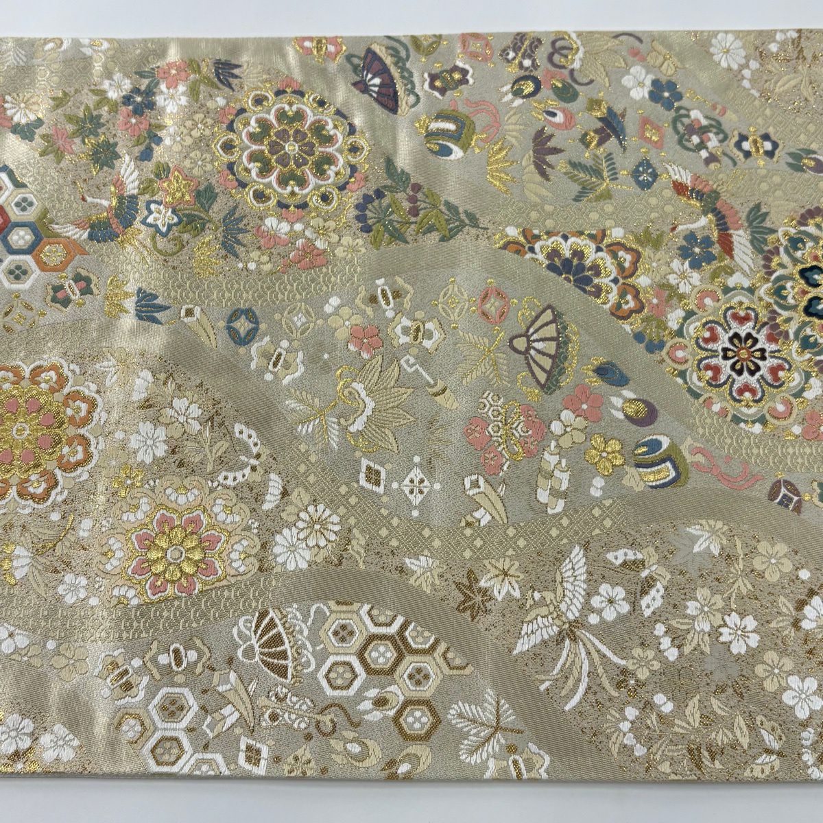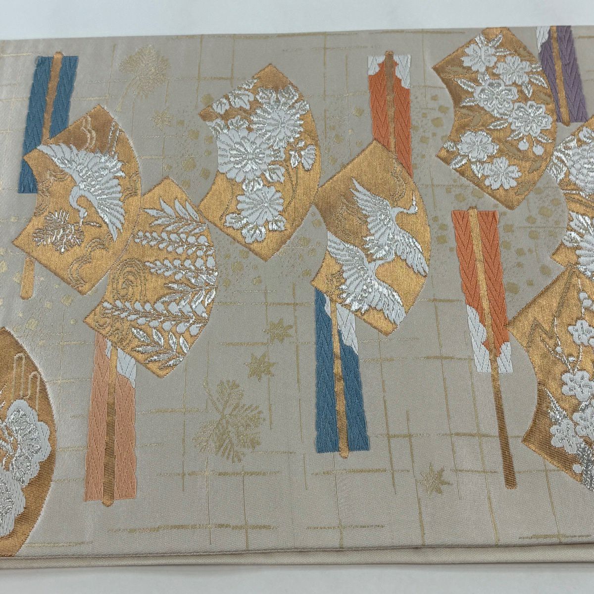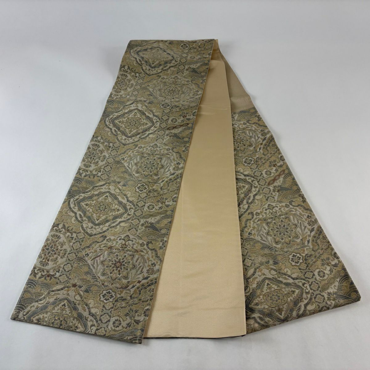 【美品】 袋帯 秀品 華文 鶴菱 金糸 ベージュ 六通 正絹