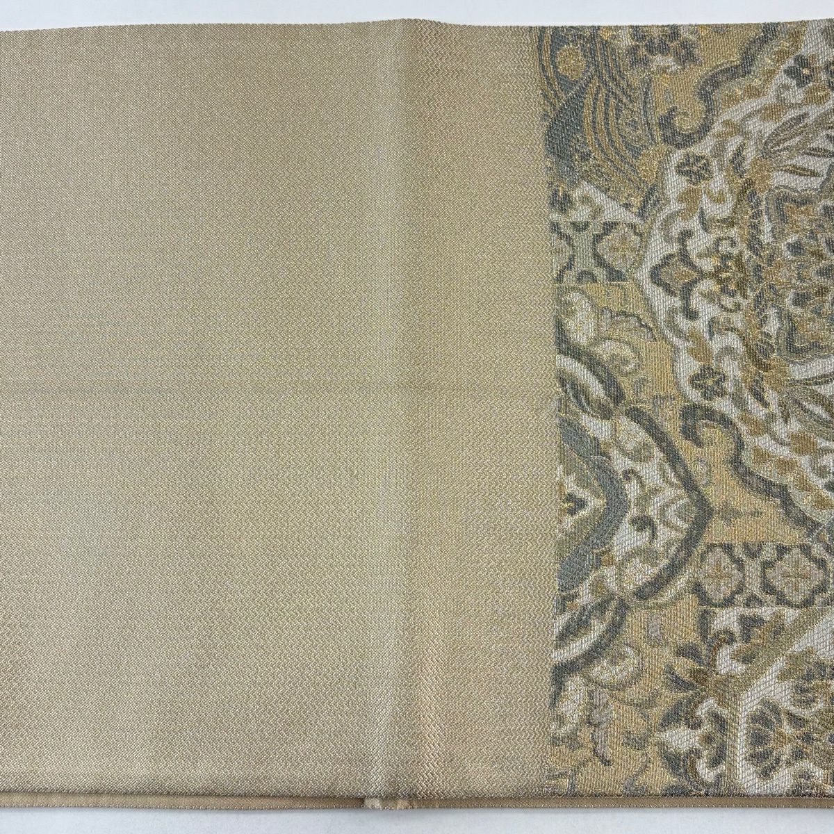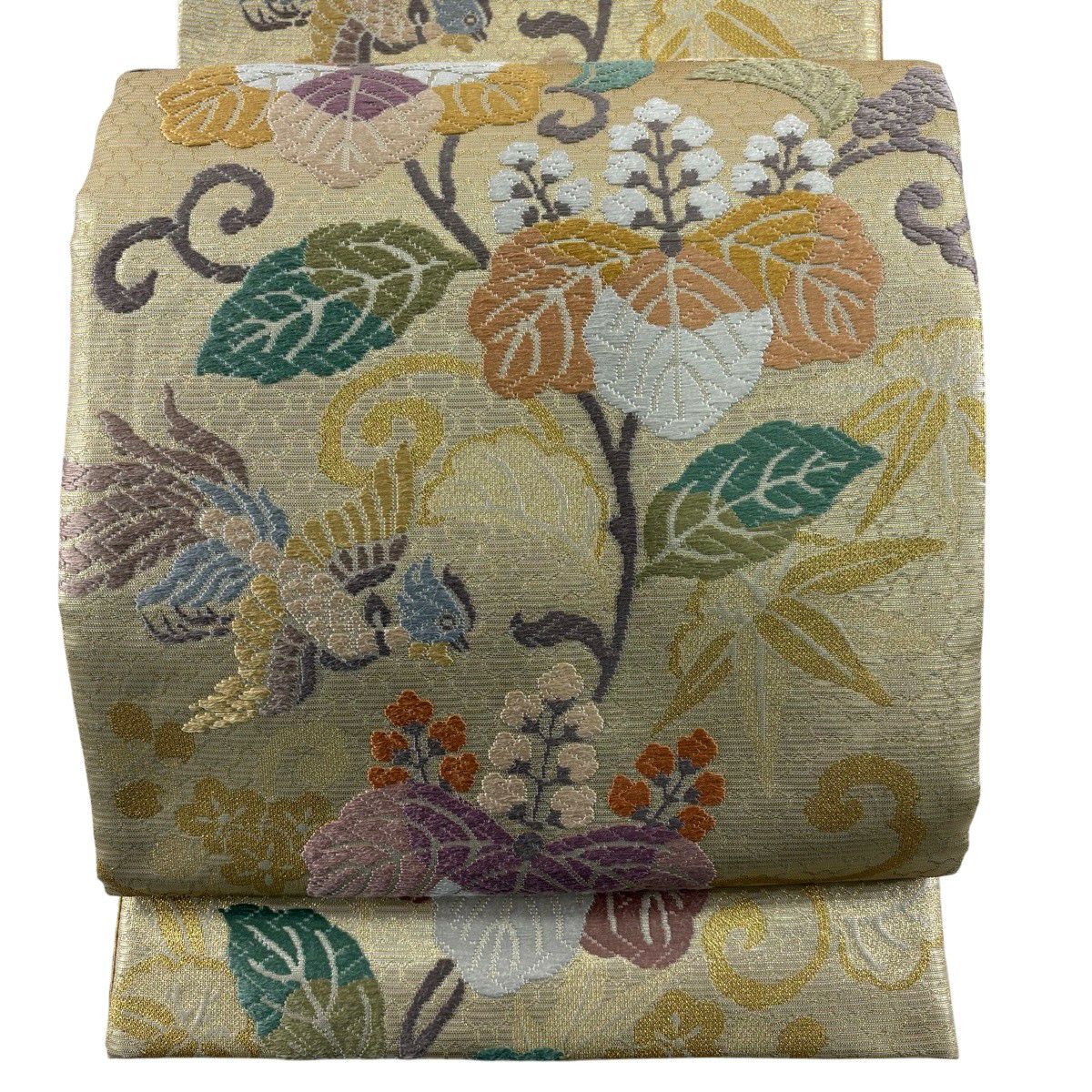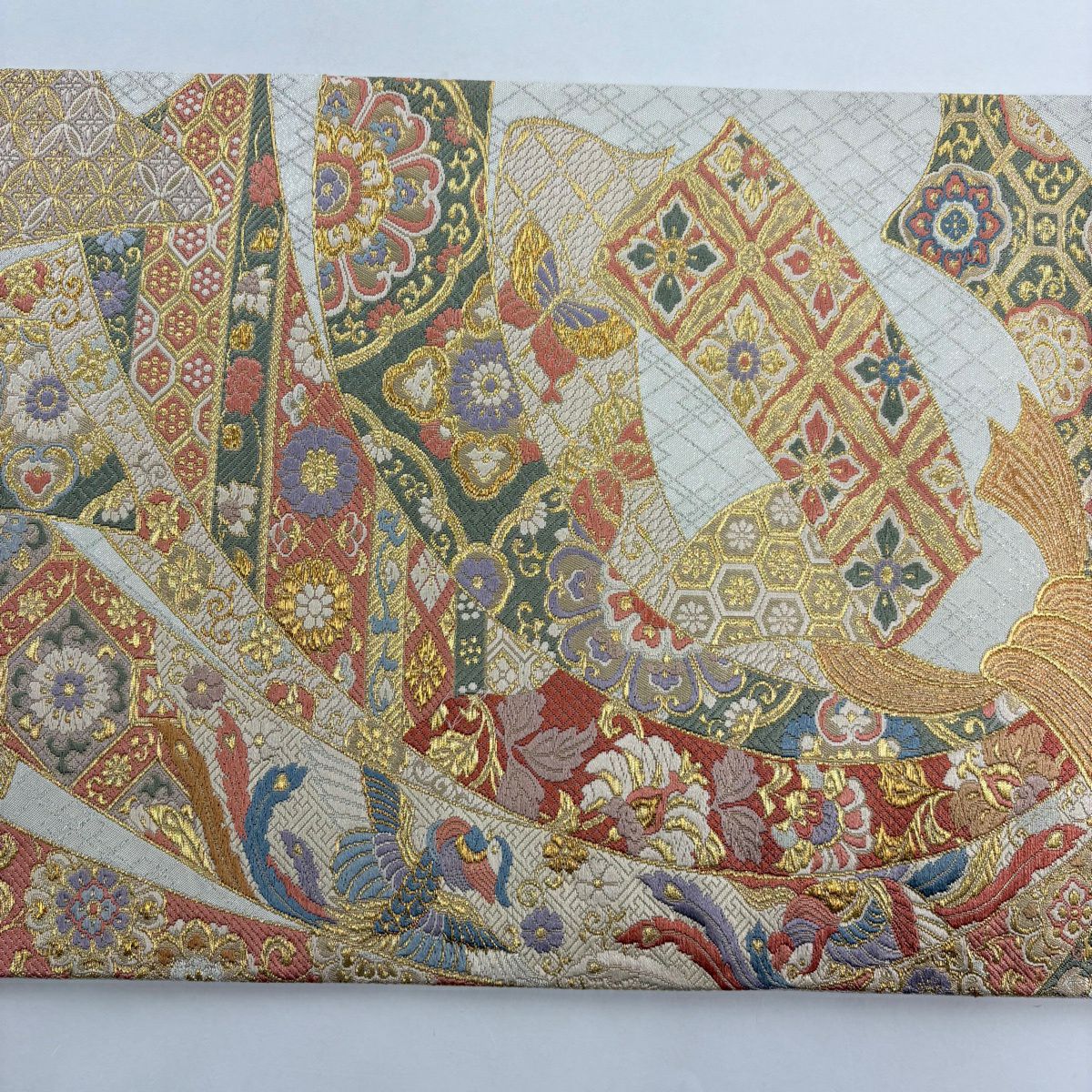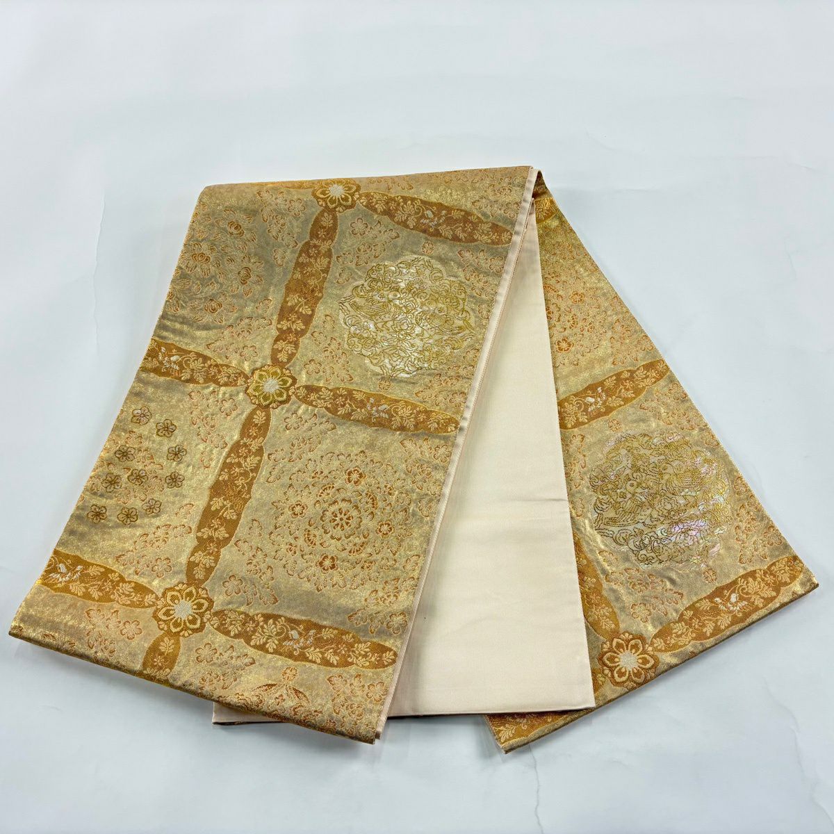 【美品】 袋帯 秀品 華文 鶴菱 金糸 ベージュ 六通 正絹