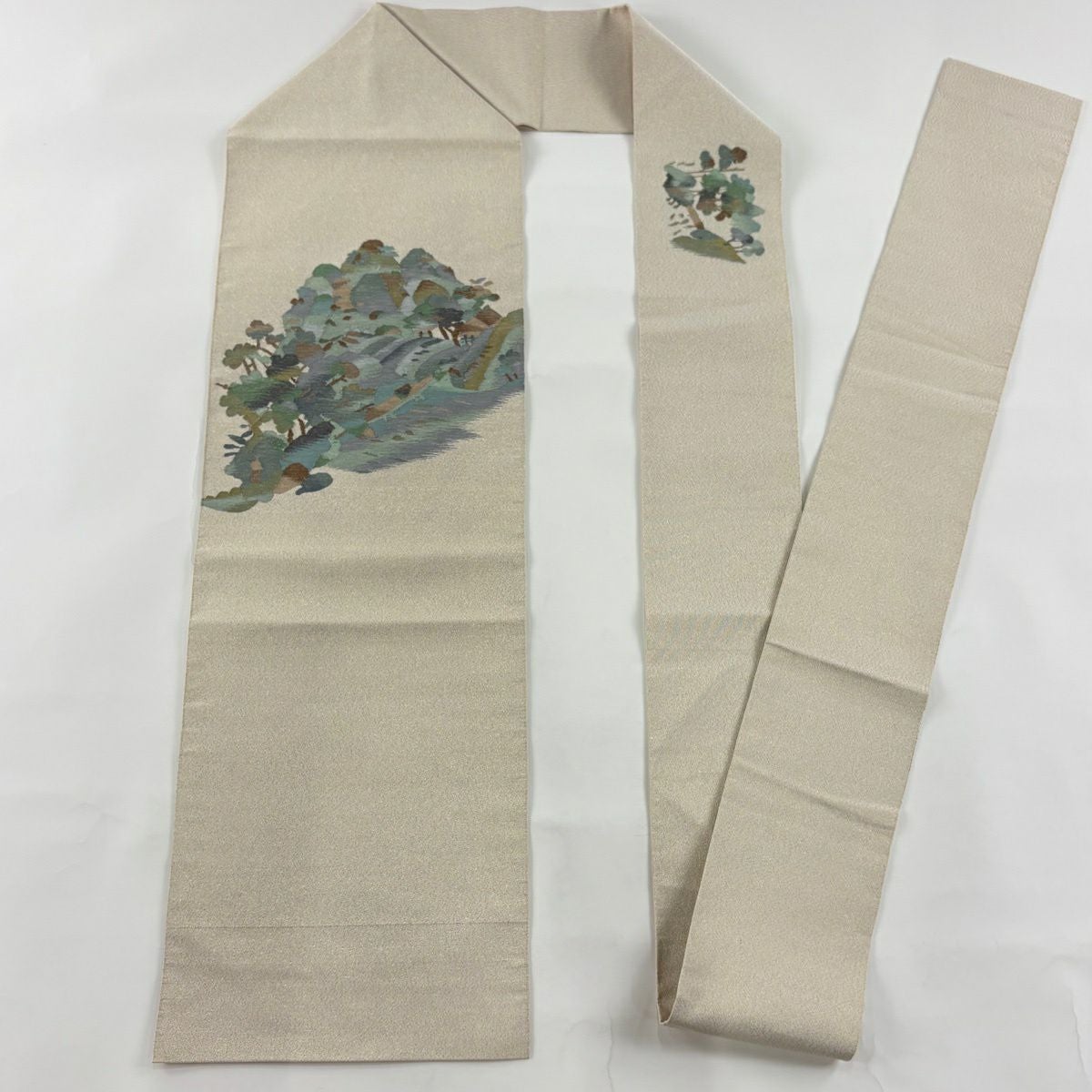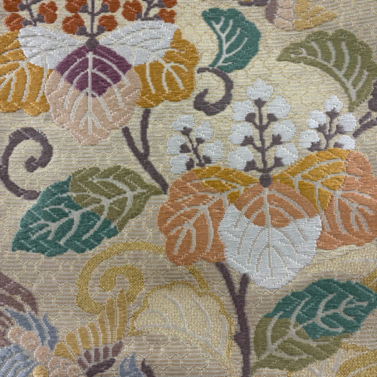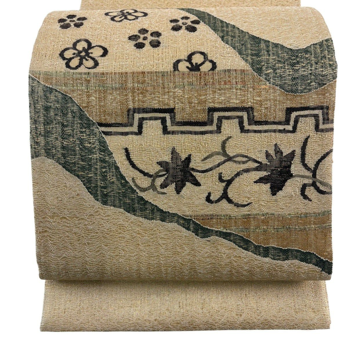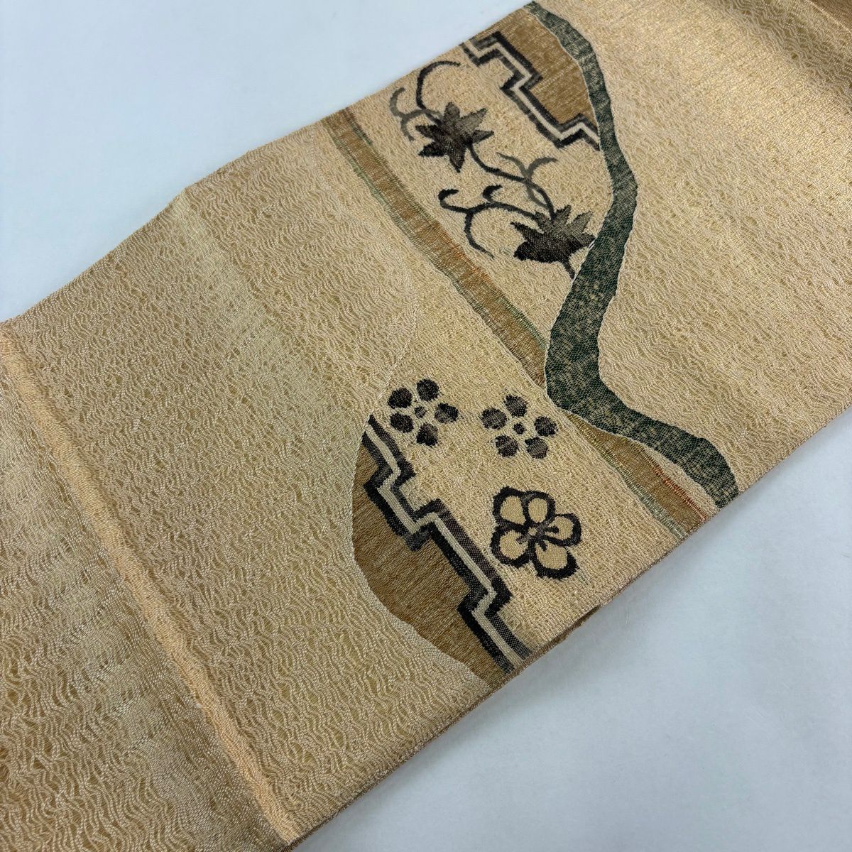 【美品】 袋帯 秀品 梅 葉 金糸 ベージュ お太鼓柄 正絹