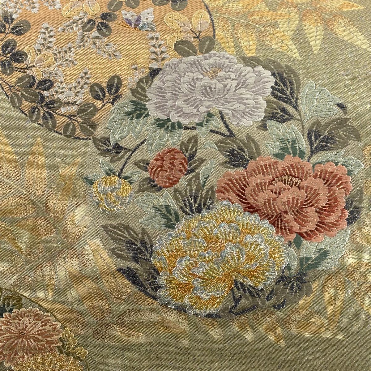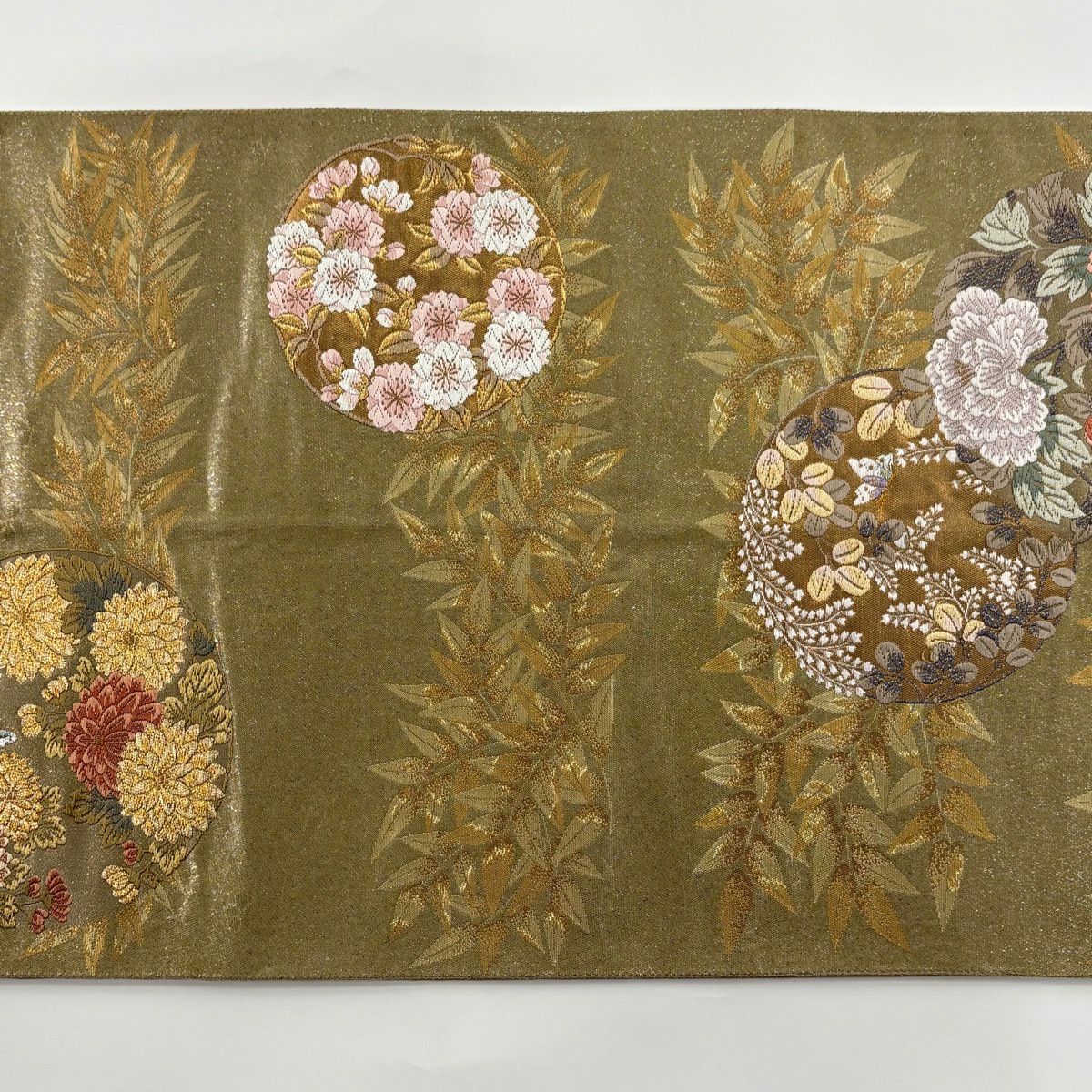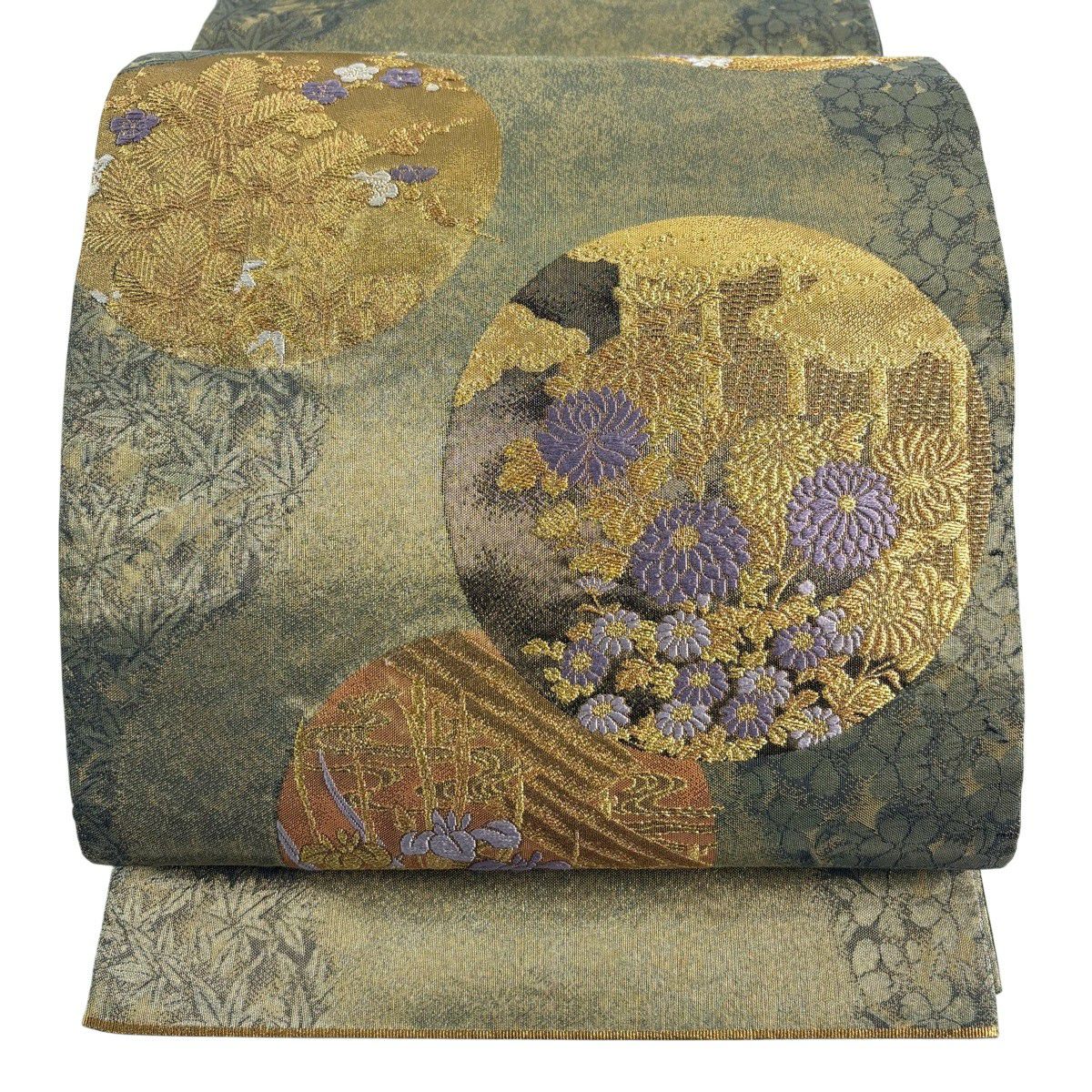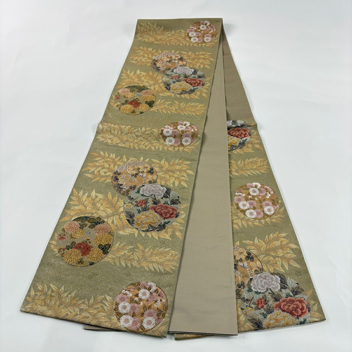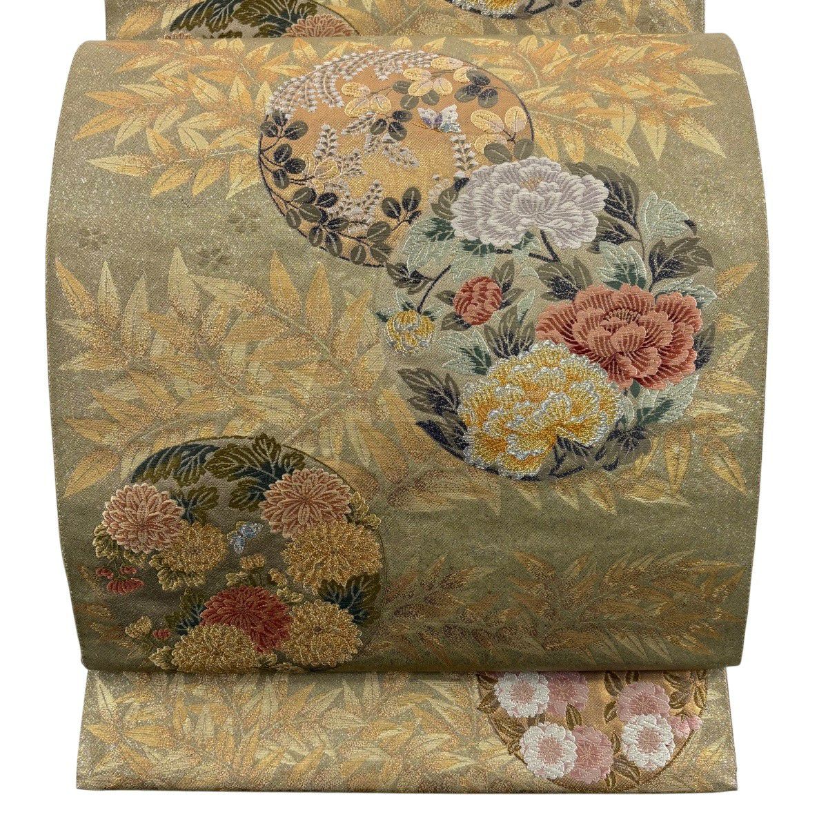 【美品】 袋帯 秀品 丸文 草花 金糸 箔 鶯色 お太鼓柄 正絹