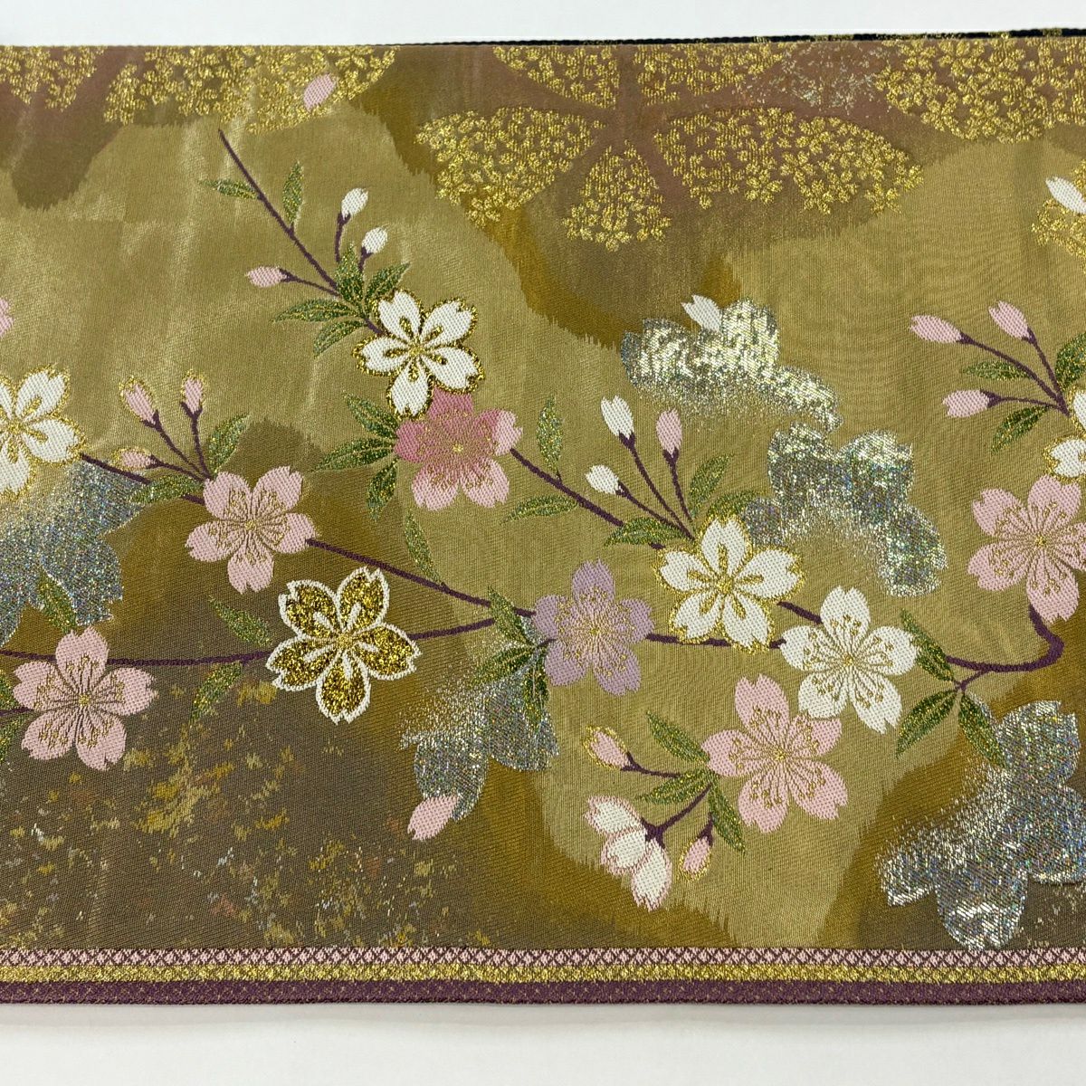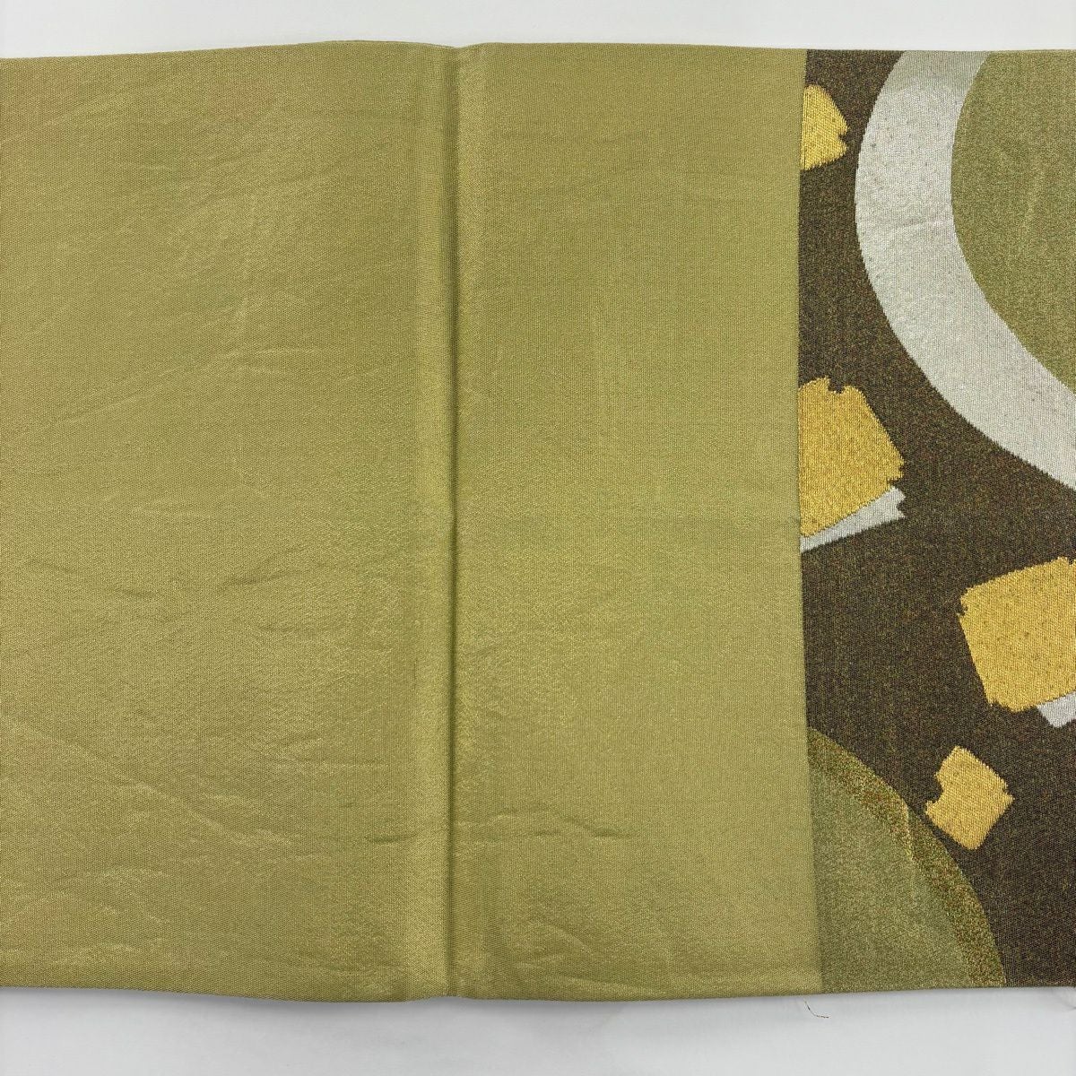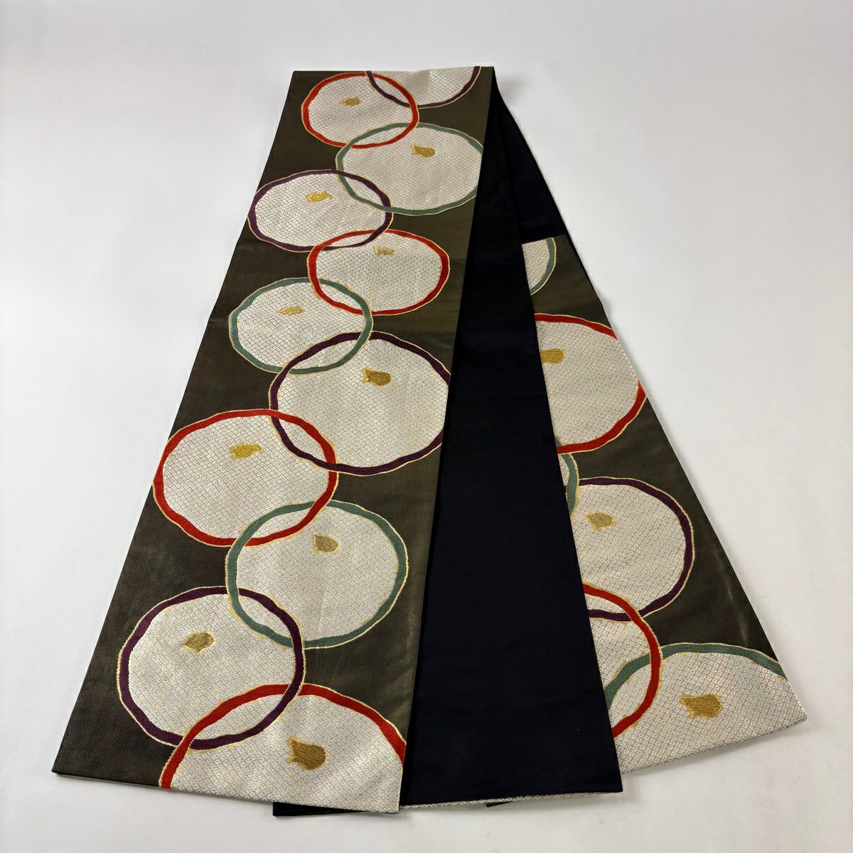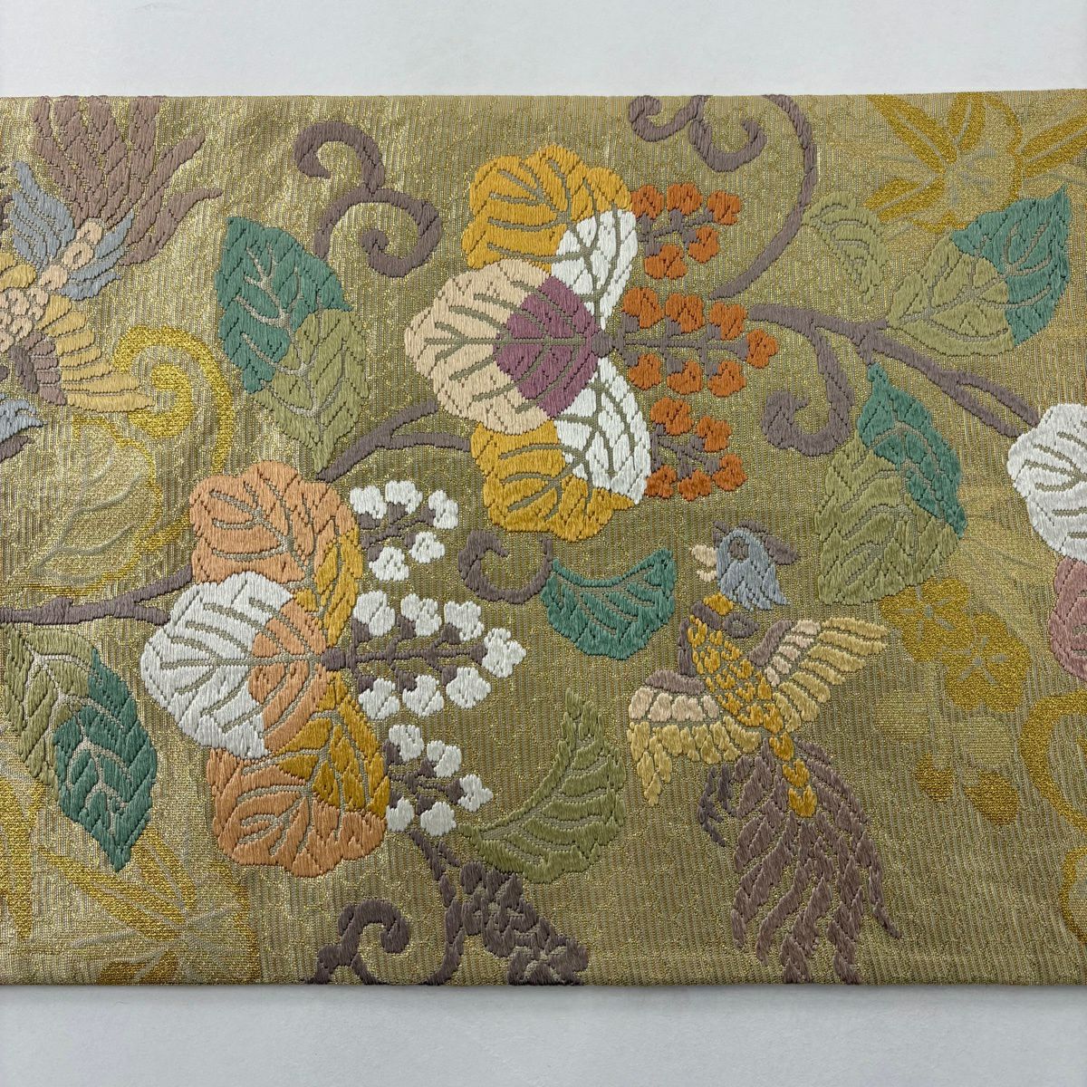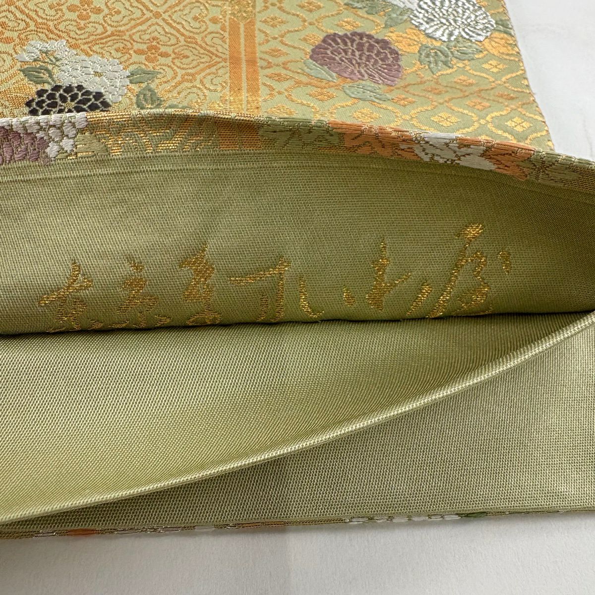 【美品】 袋帯 秀品 丸文 草花 金糸 箔 鶯色 お太鼓柄 正絹