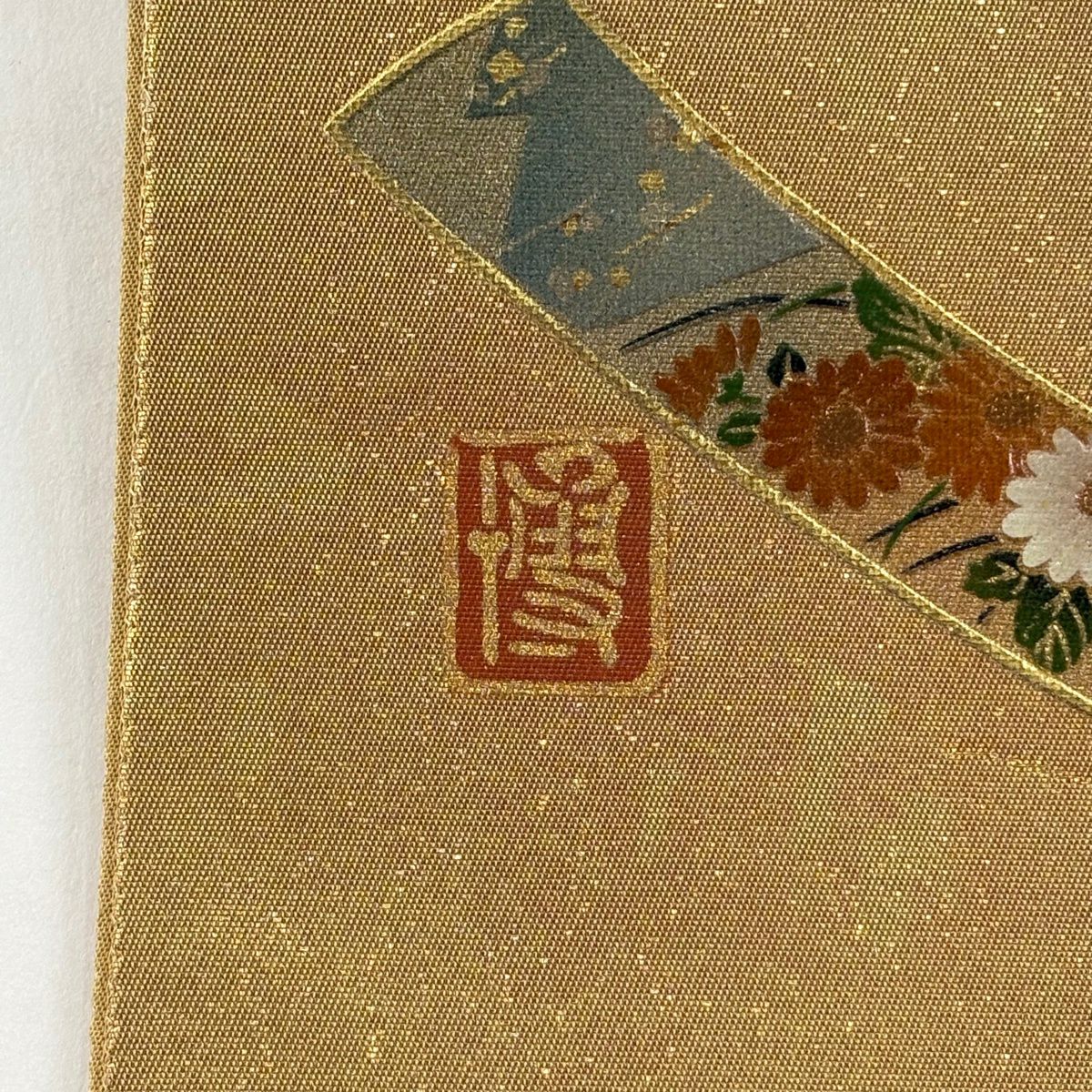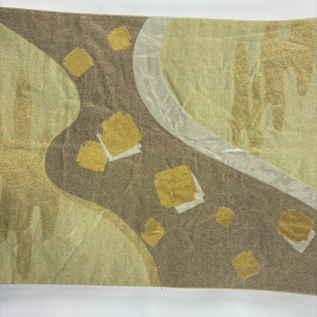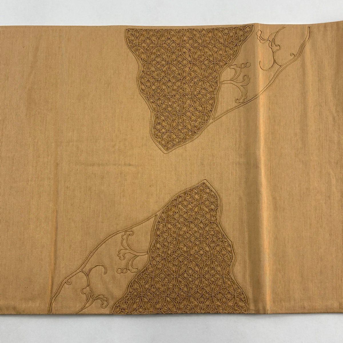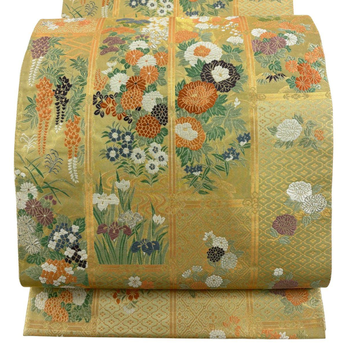 【美品】 袋帯 秀品 蕾 幾何学模様 箔 黄土色 お太鼓柄 正絹