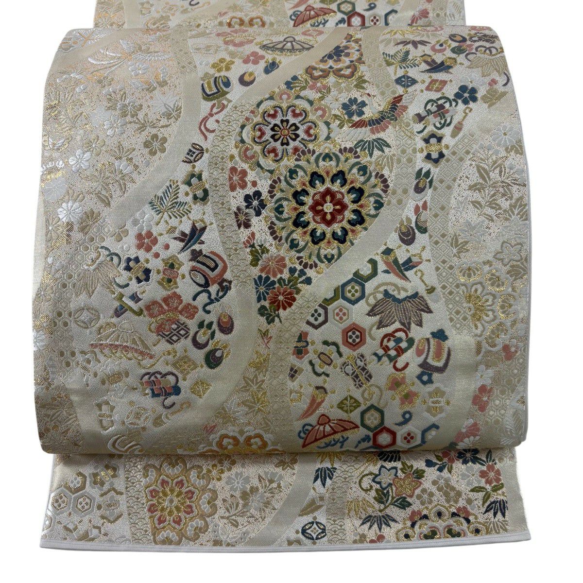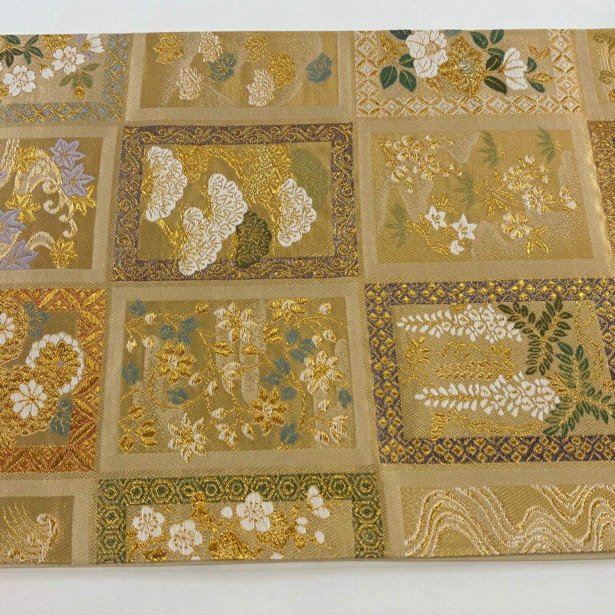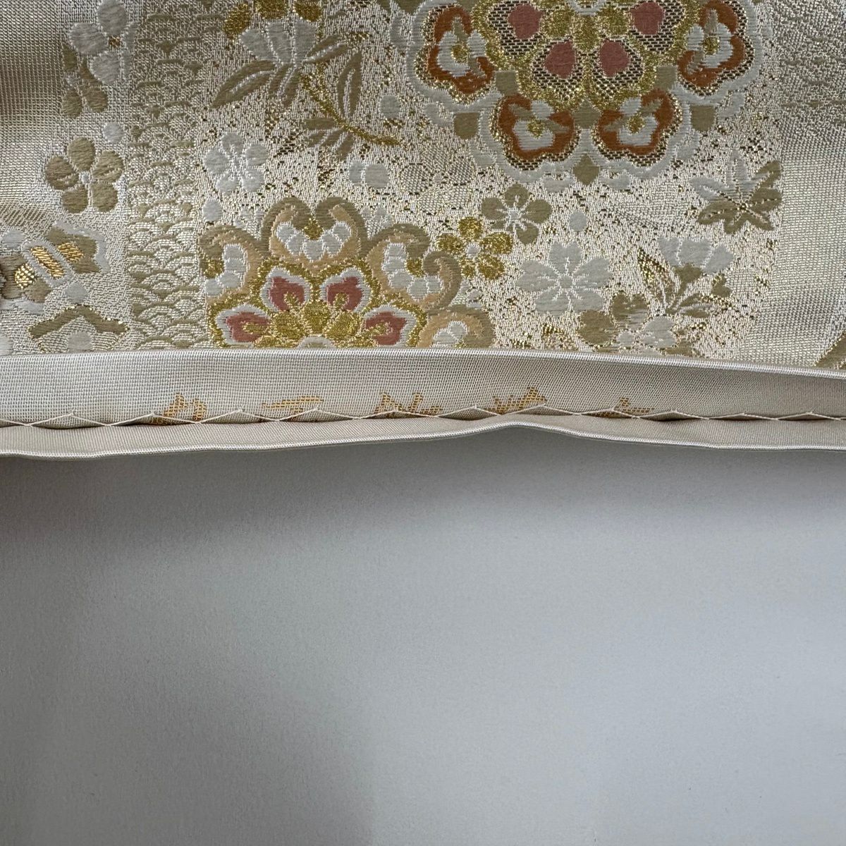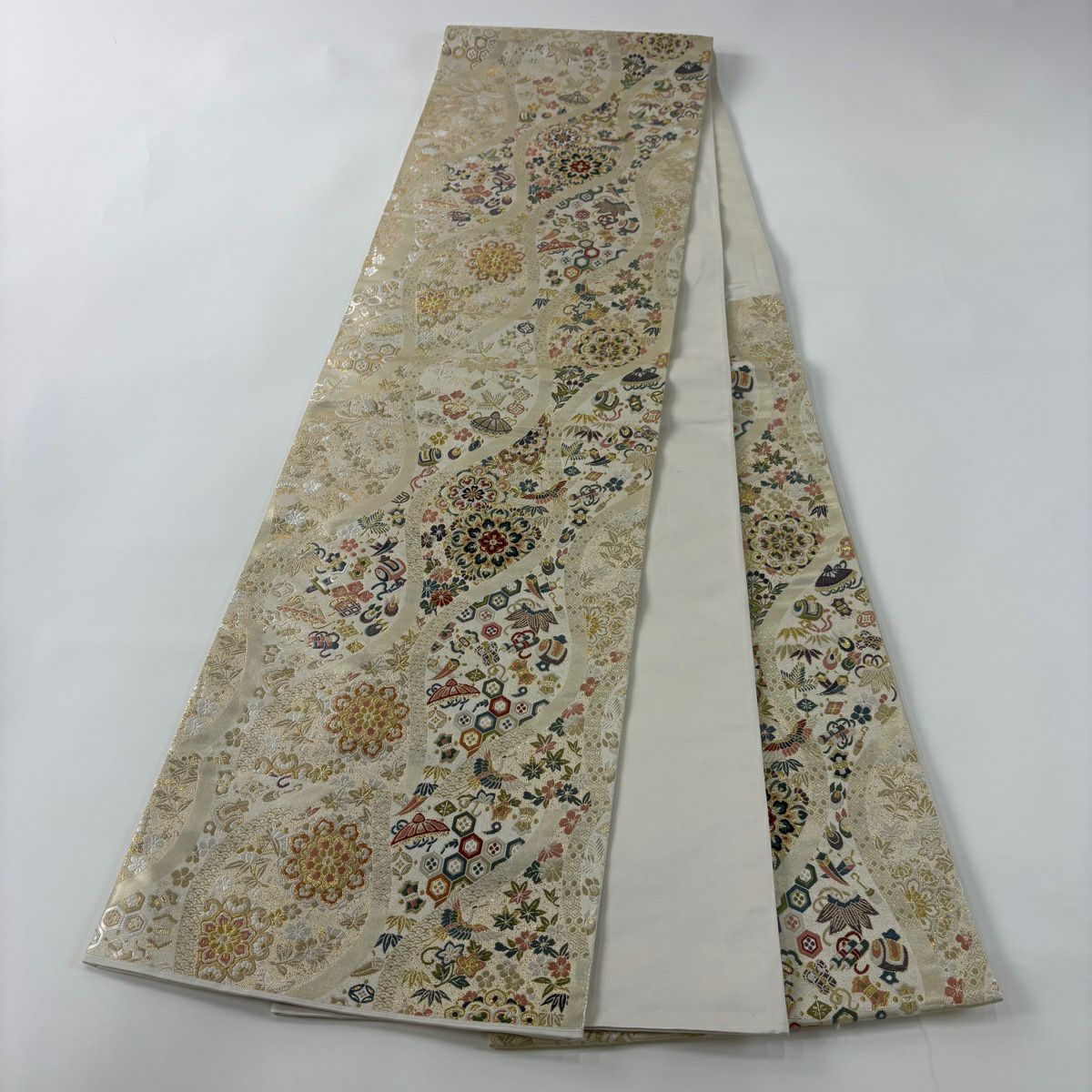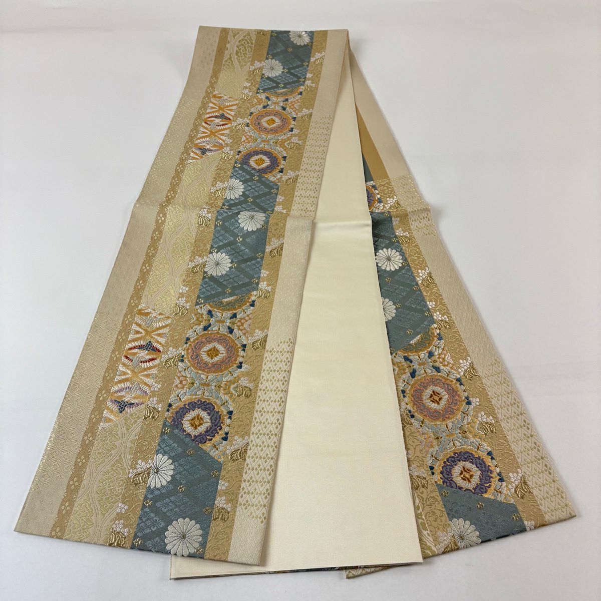 【美品】 袋帯 秀品 青海波 菊 箔 唐織 クリーム 六通 正絹