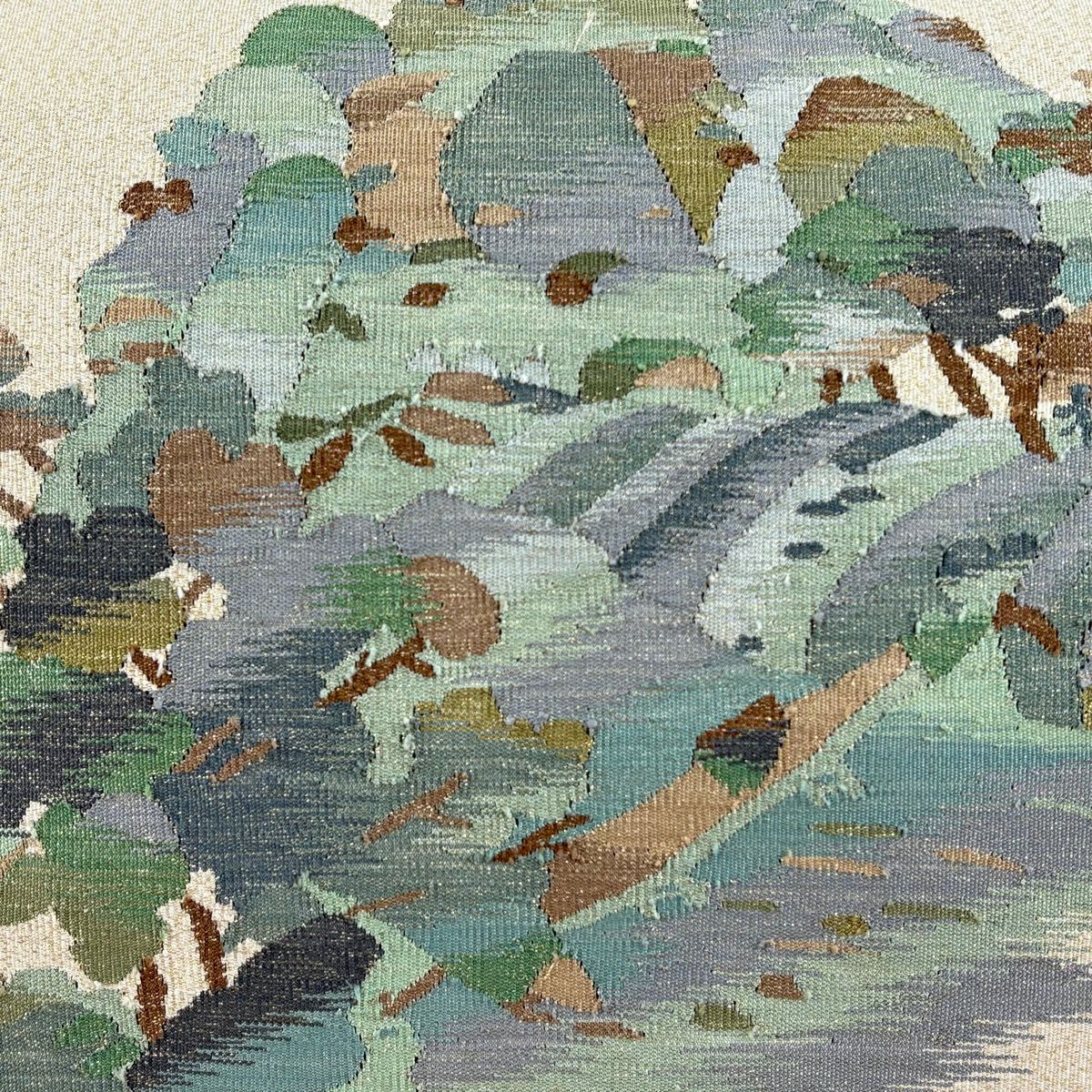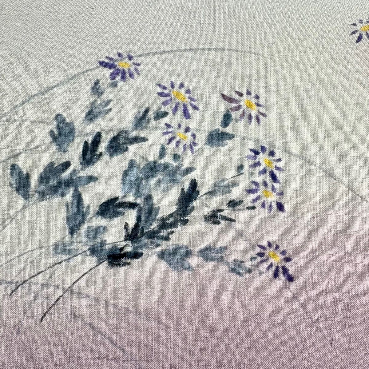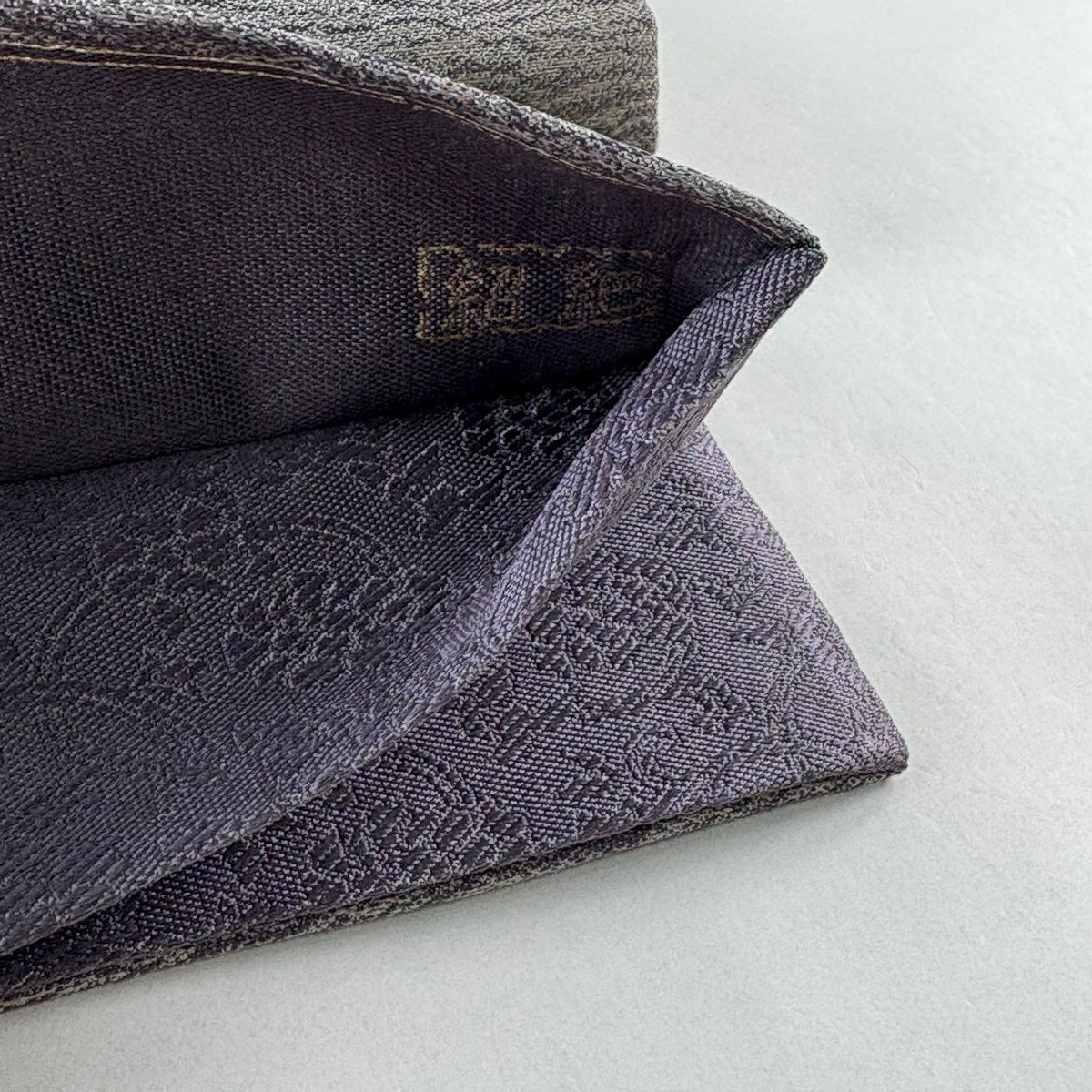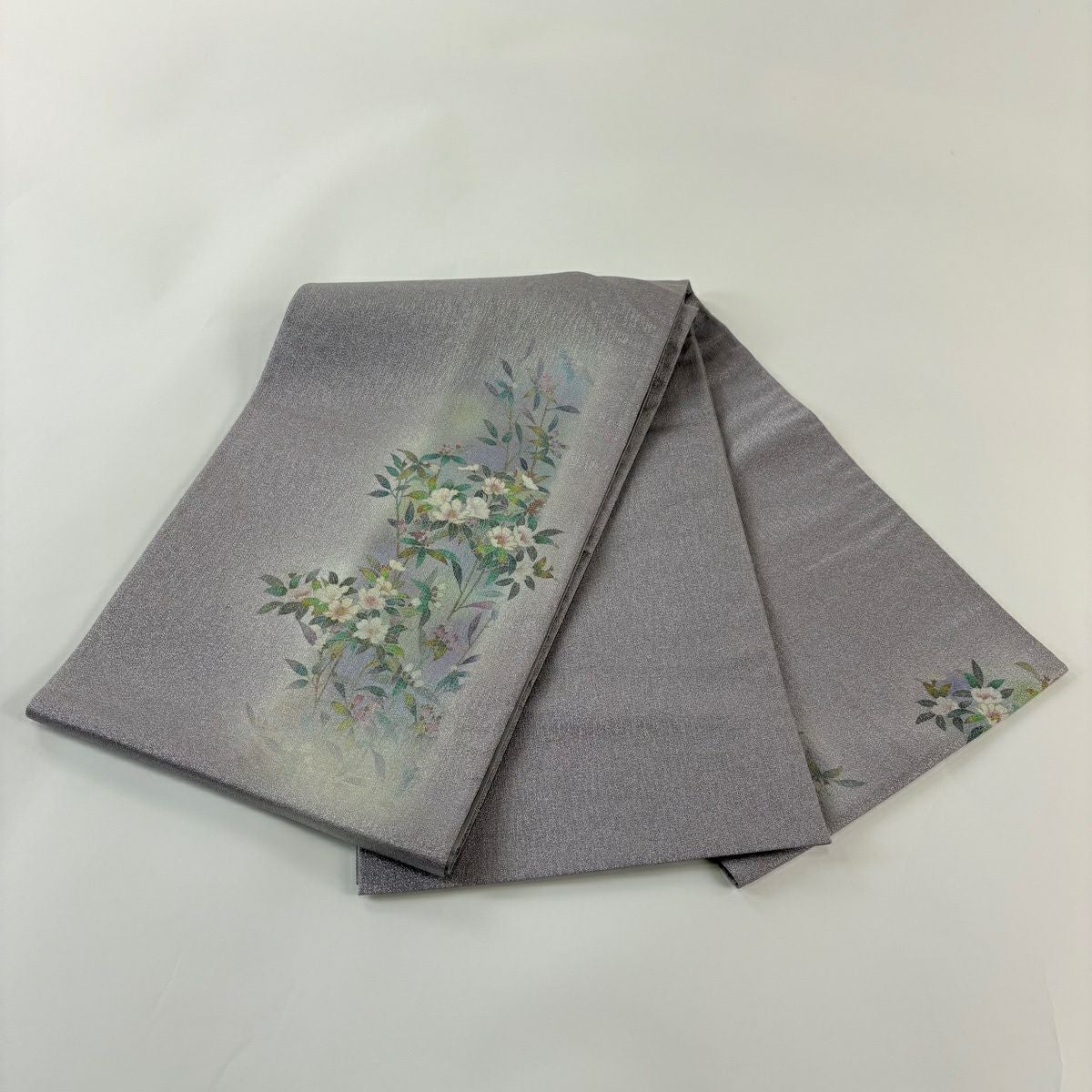 袋帯 秀品 落款あり 紬地 草花 霞ぼかし 灰紫 お太鼓柄 正絹