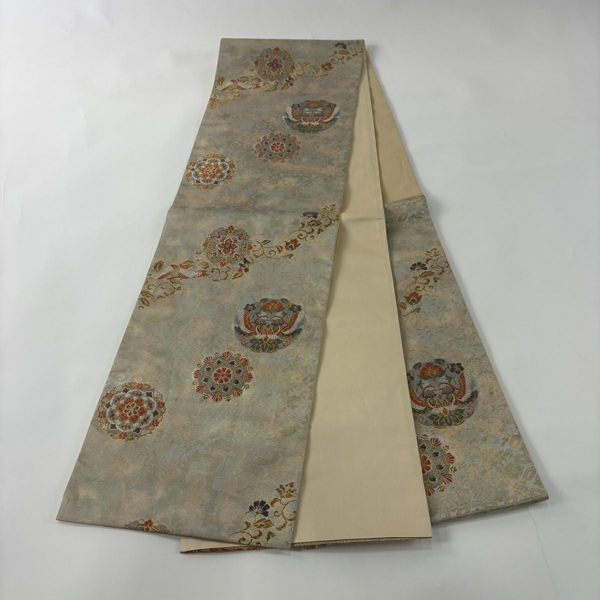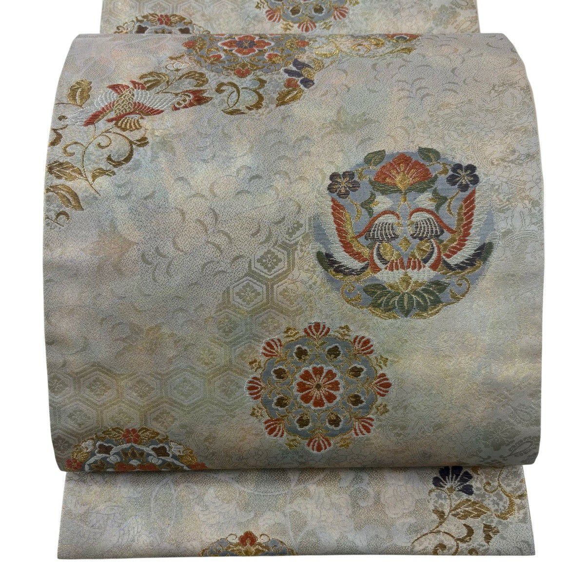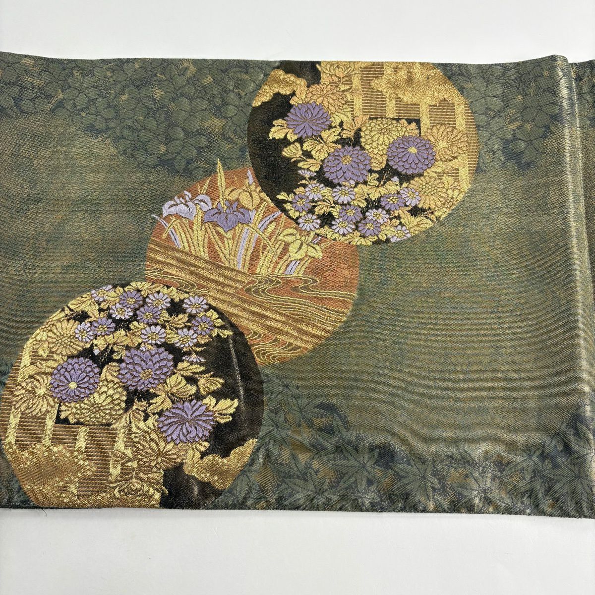 【美品】 袋帯 秀品 花丸文 葉柄 金銀糸 箔 灰緑 六通 正絹