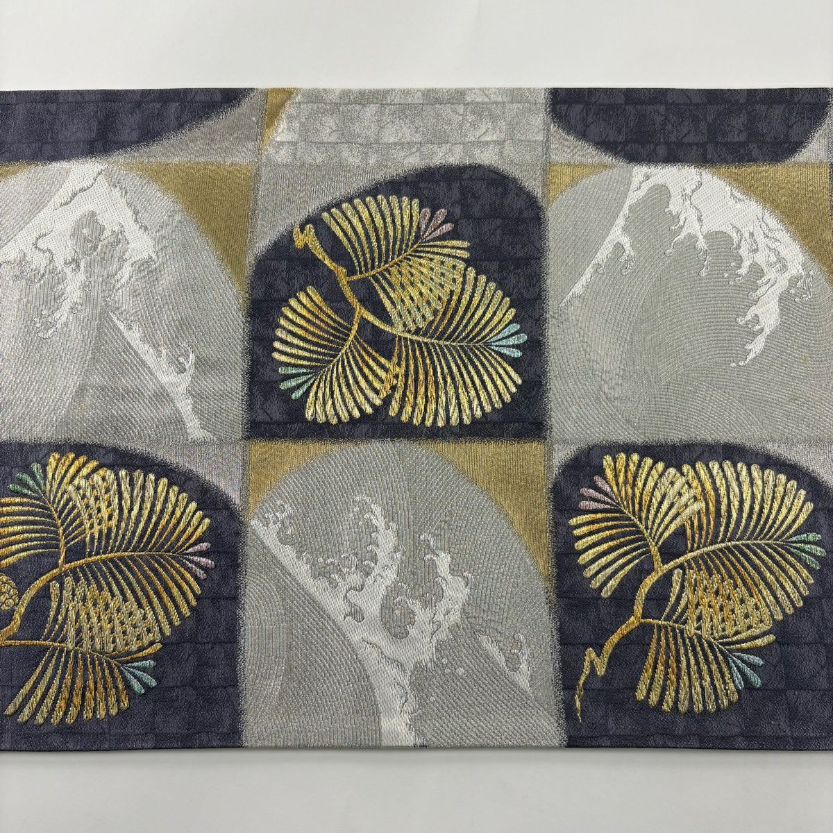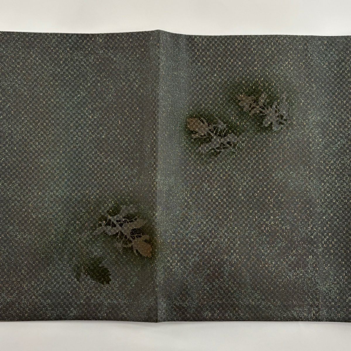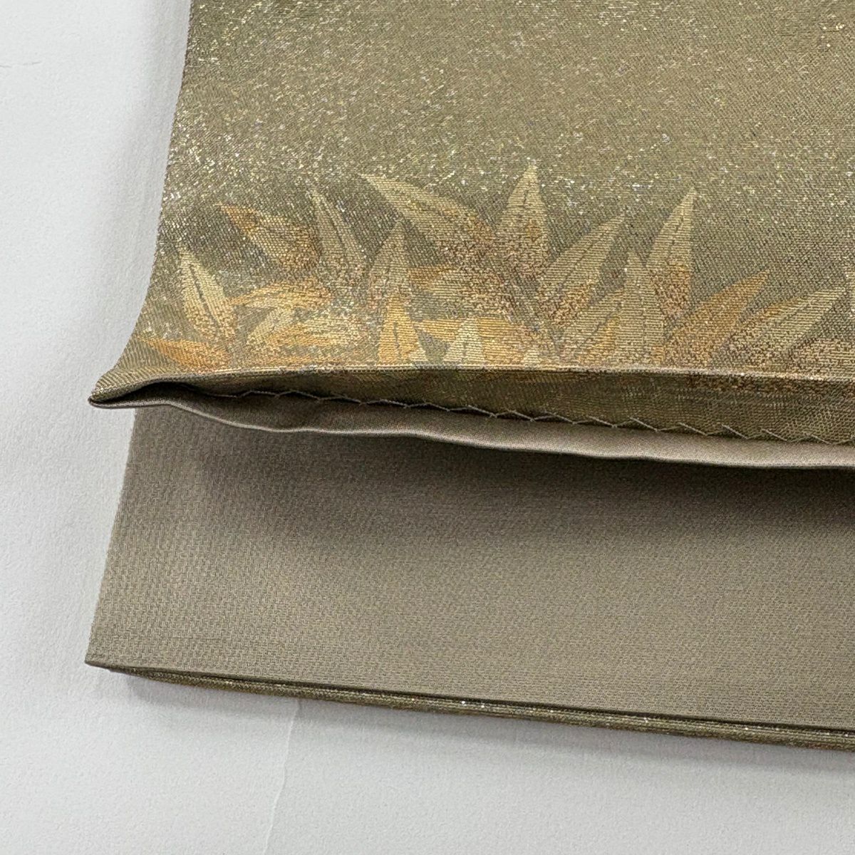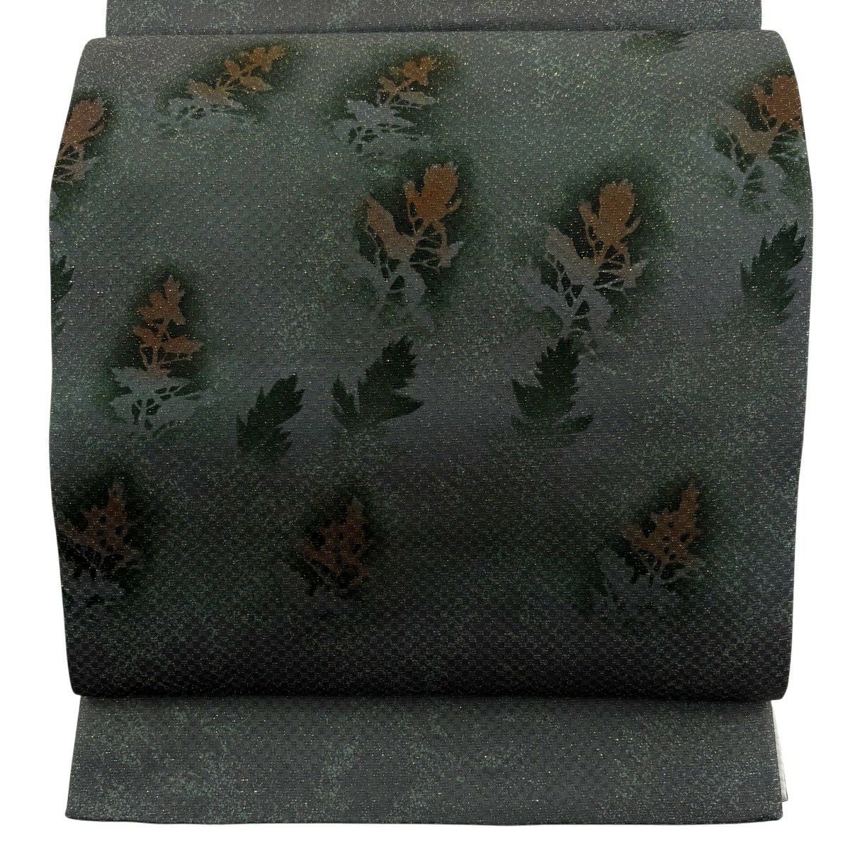 袋帯 秀品 落款あり 葉柄 シルエット 箔 灰緑 お太鼓柄 正絹