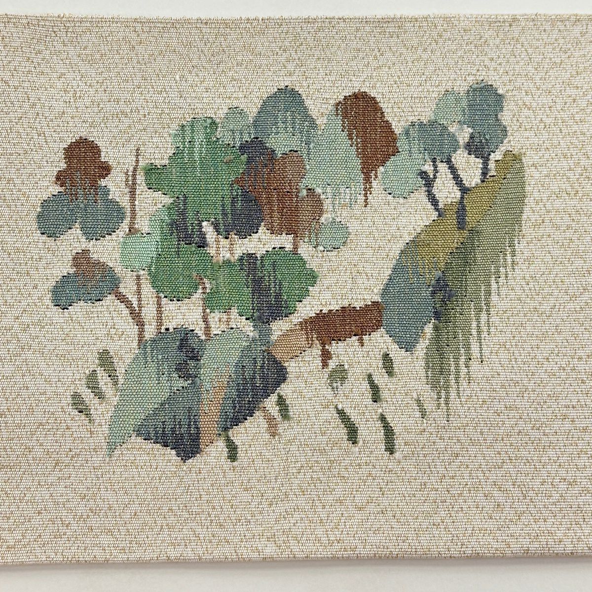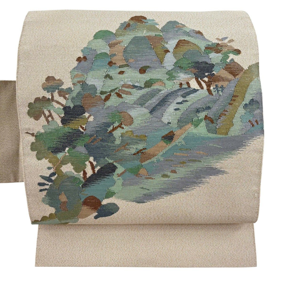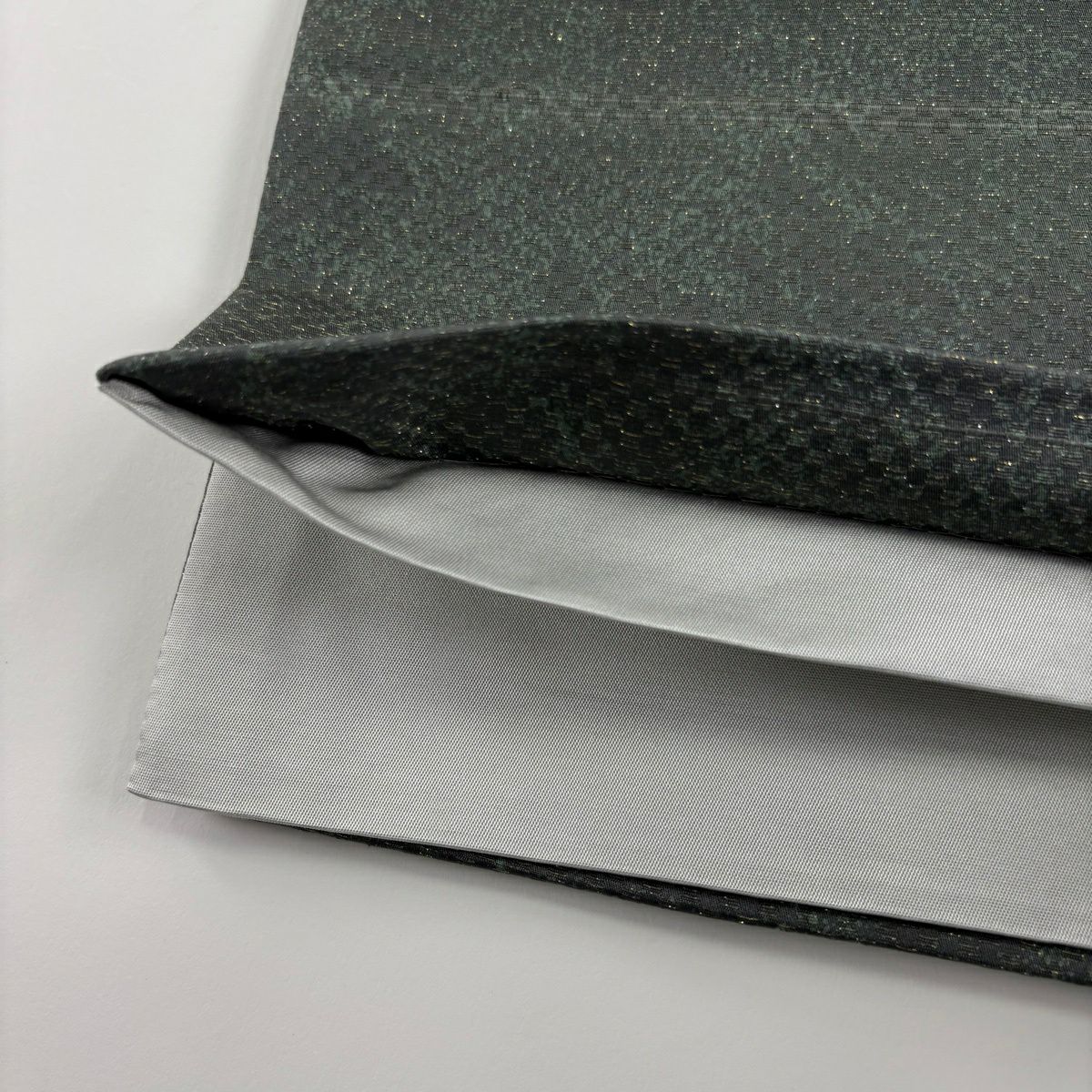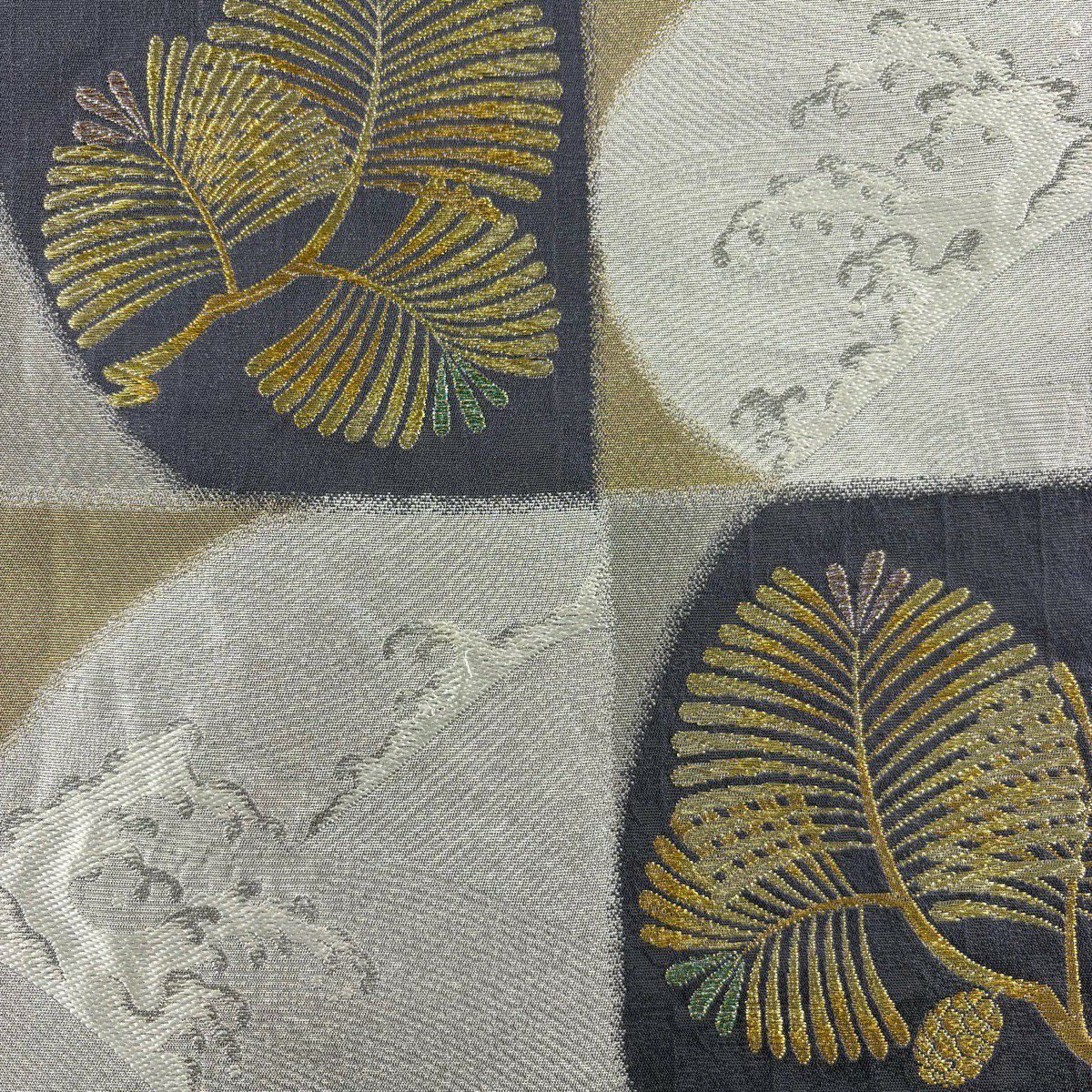 袋帯 秀品 落款あり 葉柄 シルエット 箔 灰緑 お太鼓柄 正絹