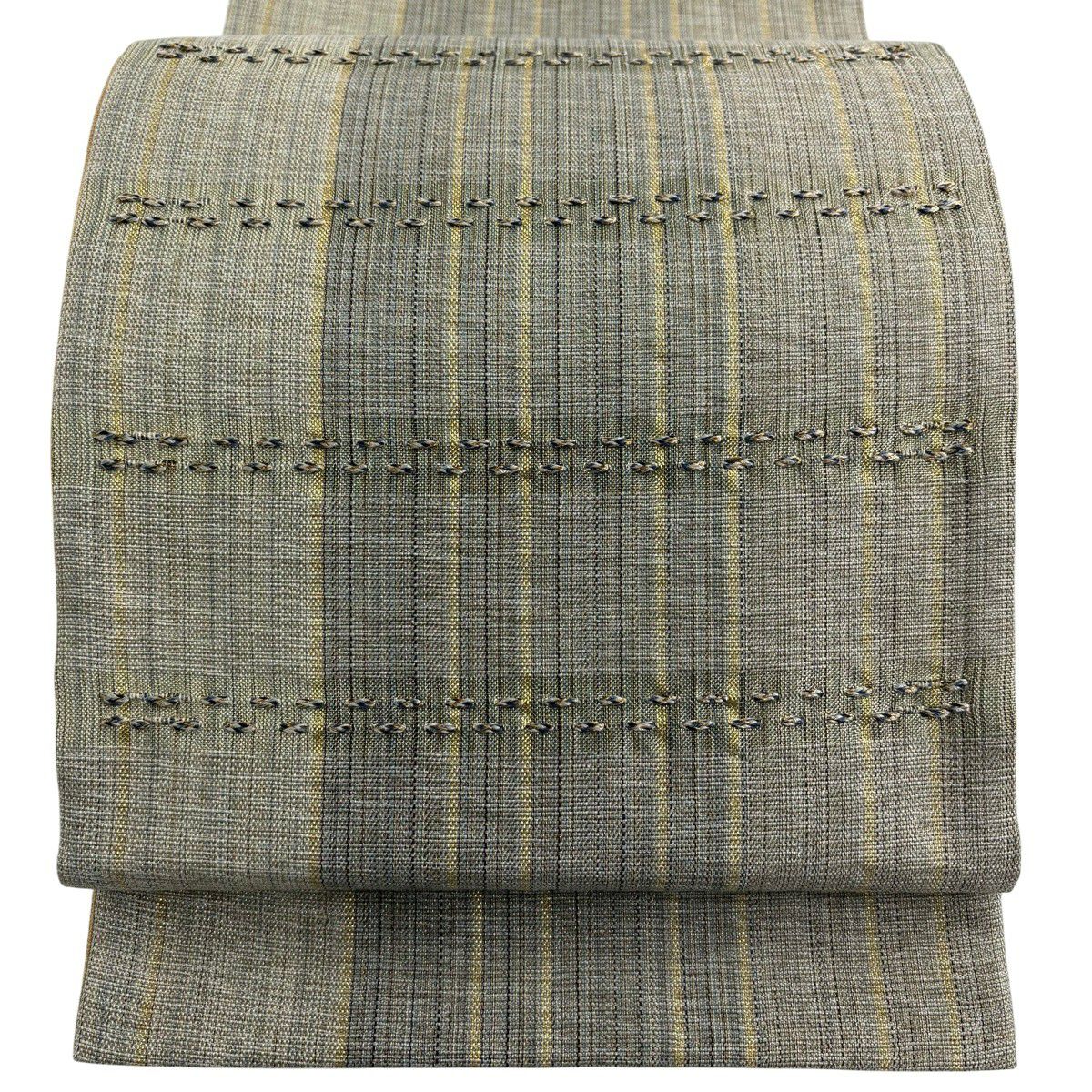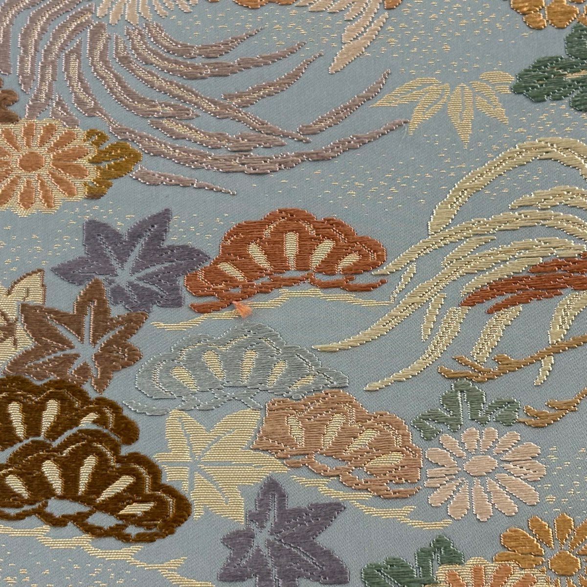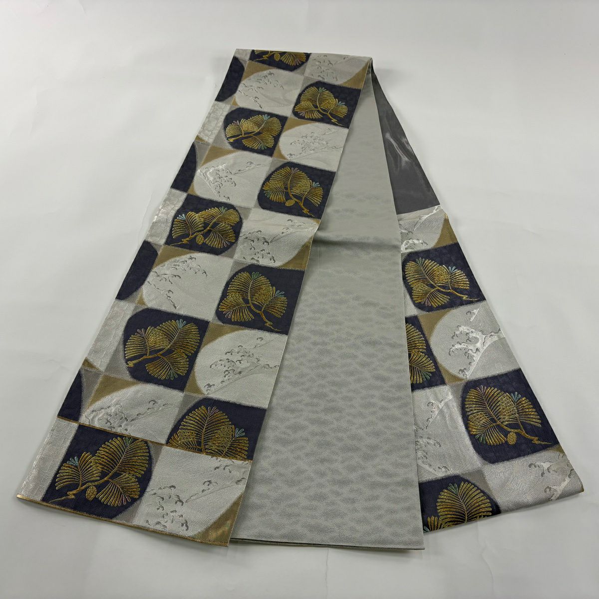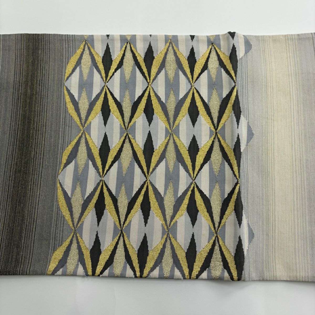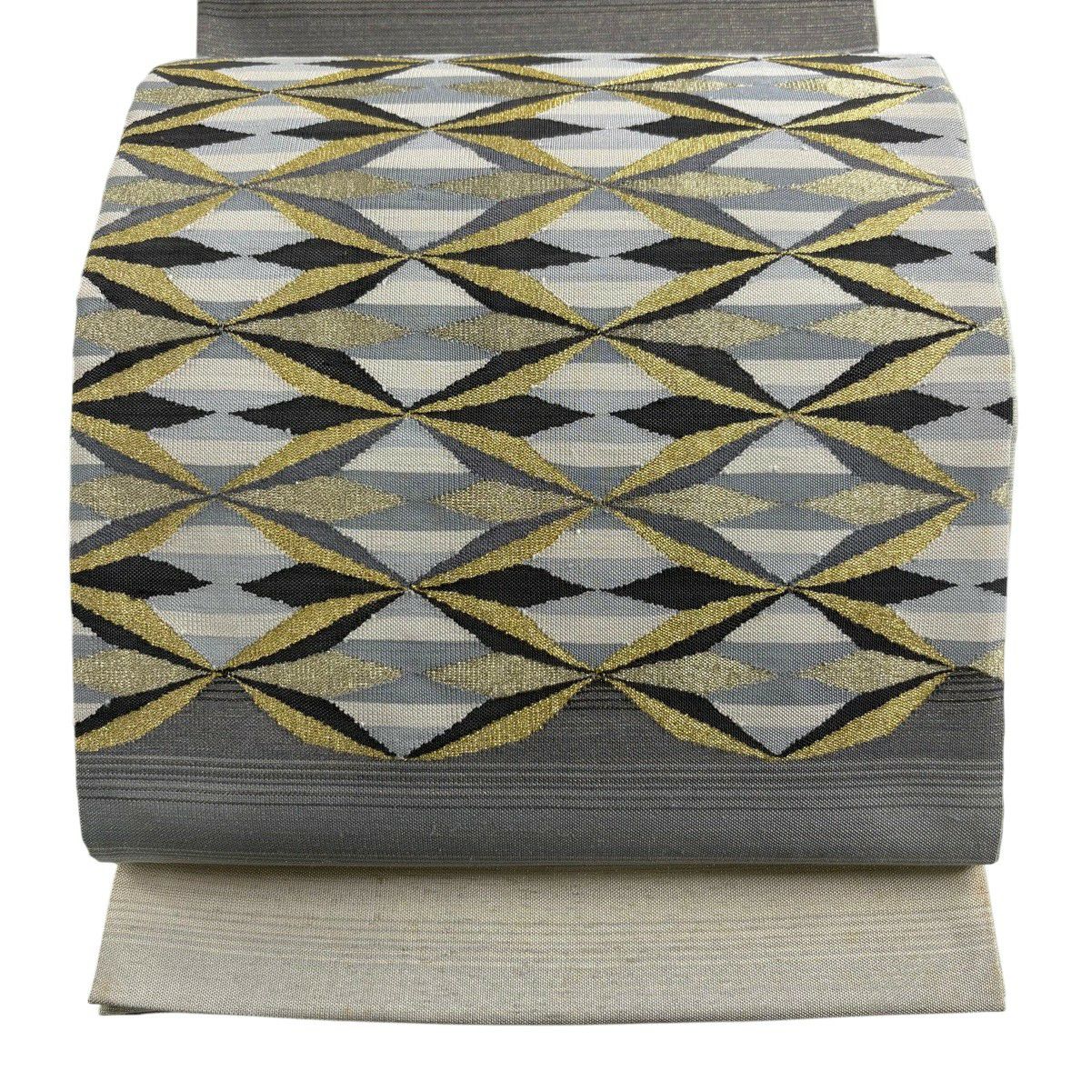 袋帯 秀品 幾何学模様 縞模様 金糸 組織 青灰色 お太鼓柄 正絹