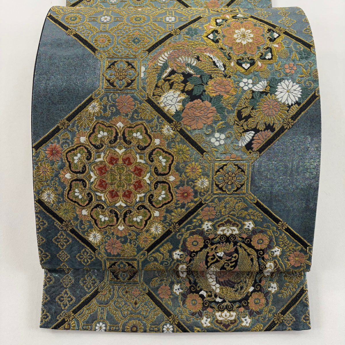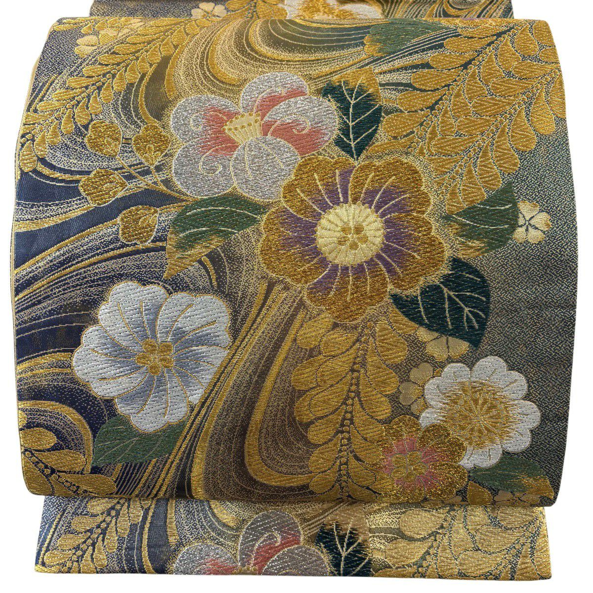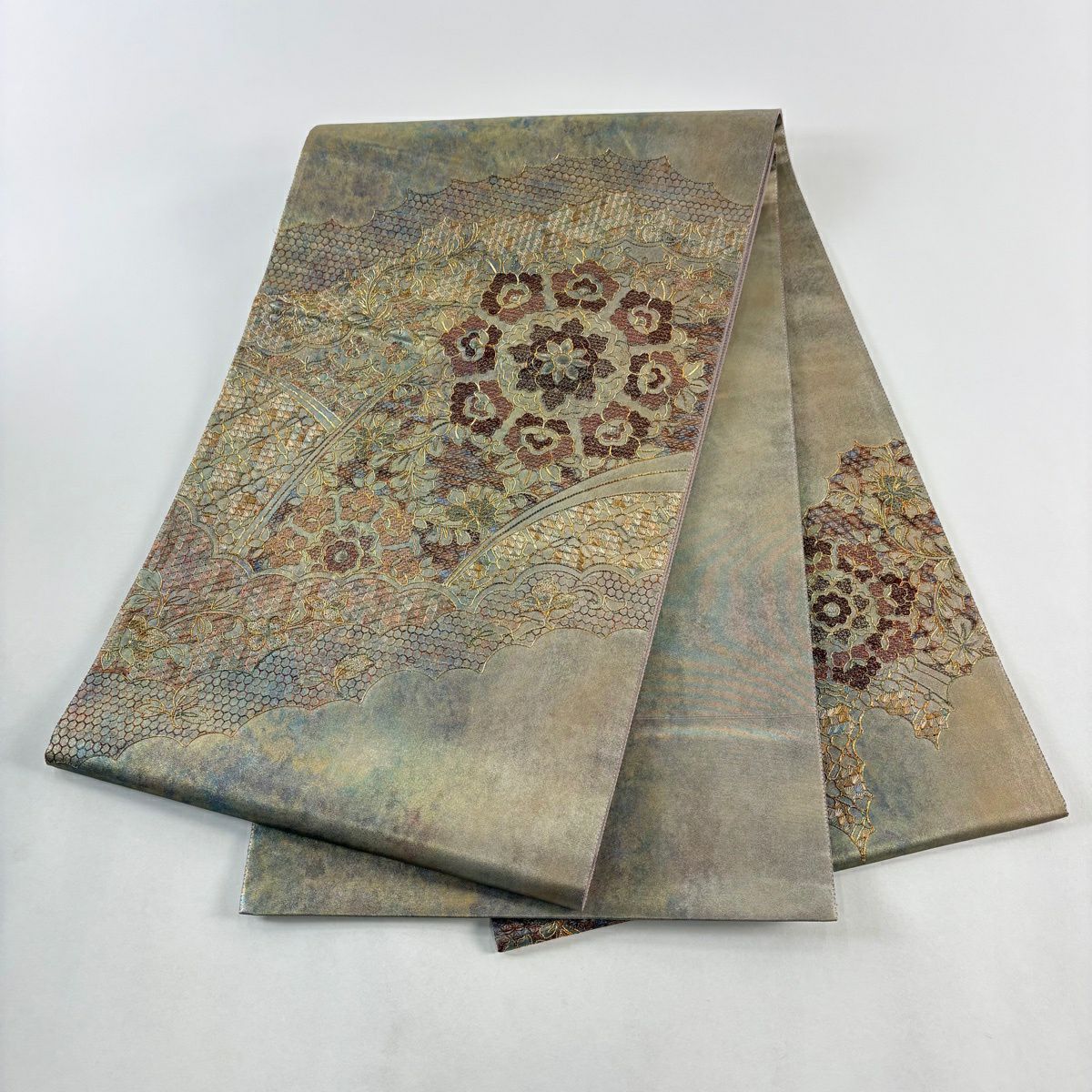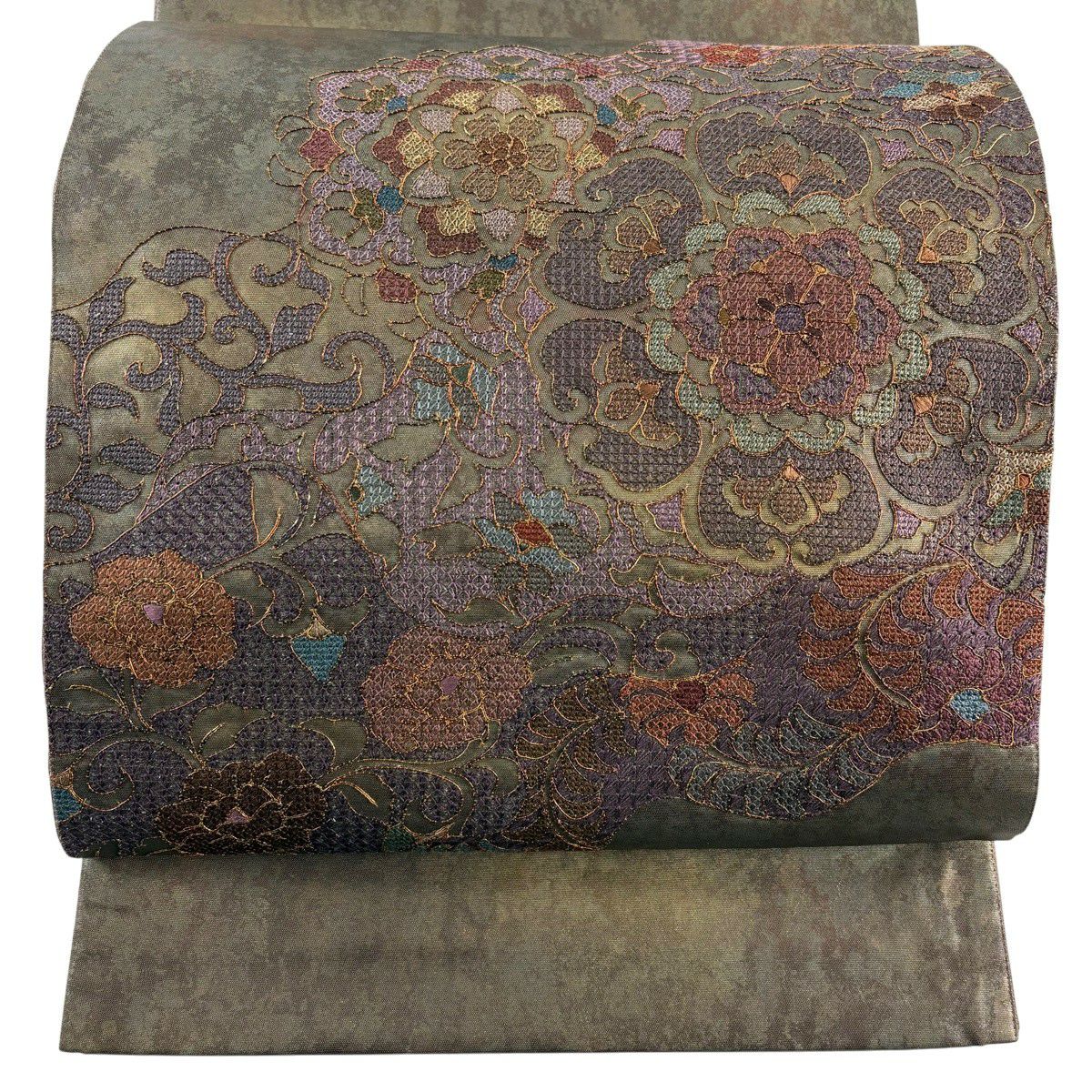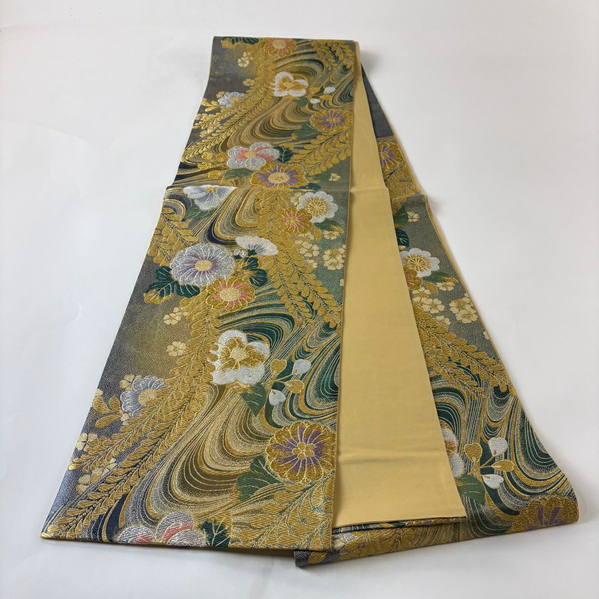 【美品】 袋帯 秀品 華文 草花 金糸 箔 灰緑 お太鼓柄 正絹