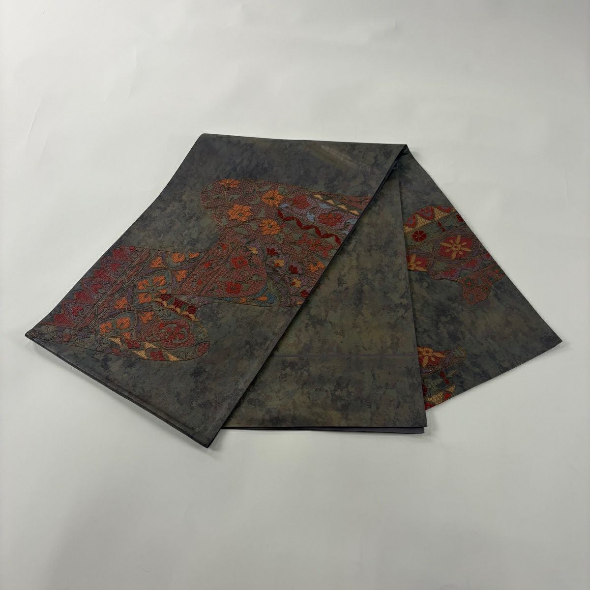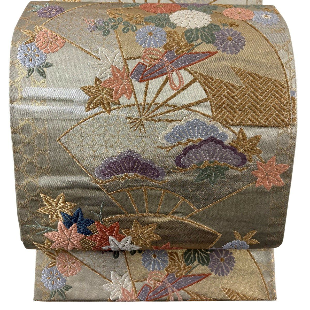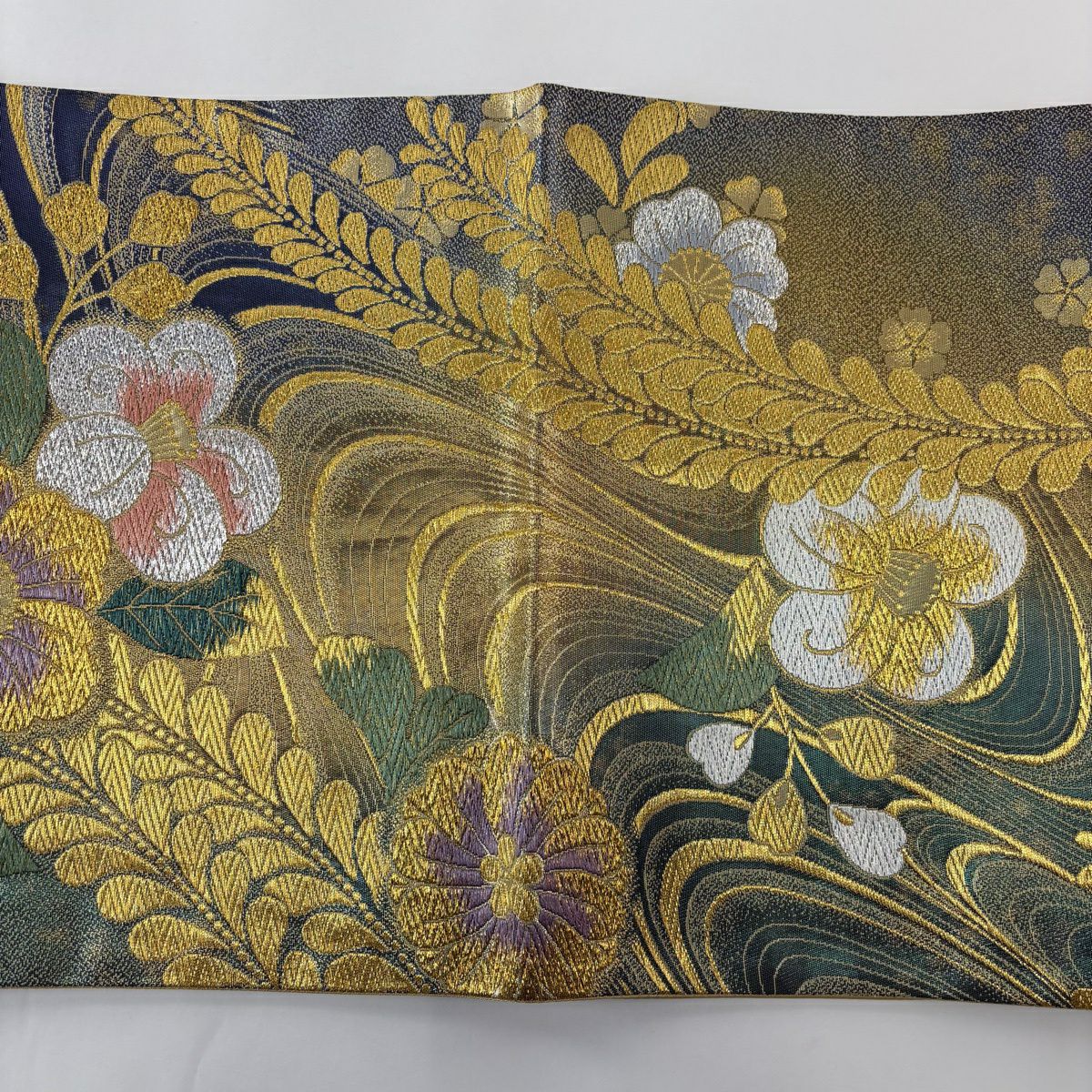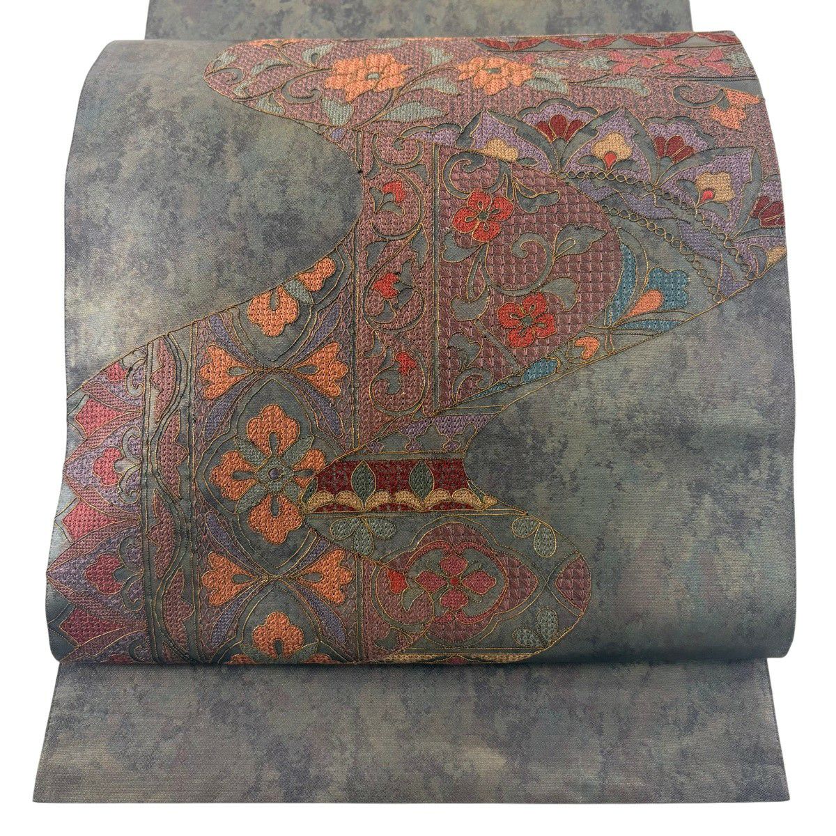 【美品】 袋帯 秀品 華文 草花 金糸 箔 灰緑 お太鼓柄 正絹