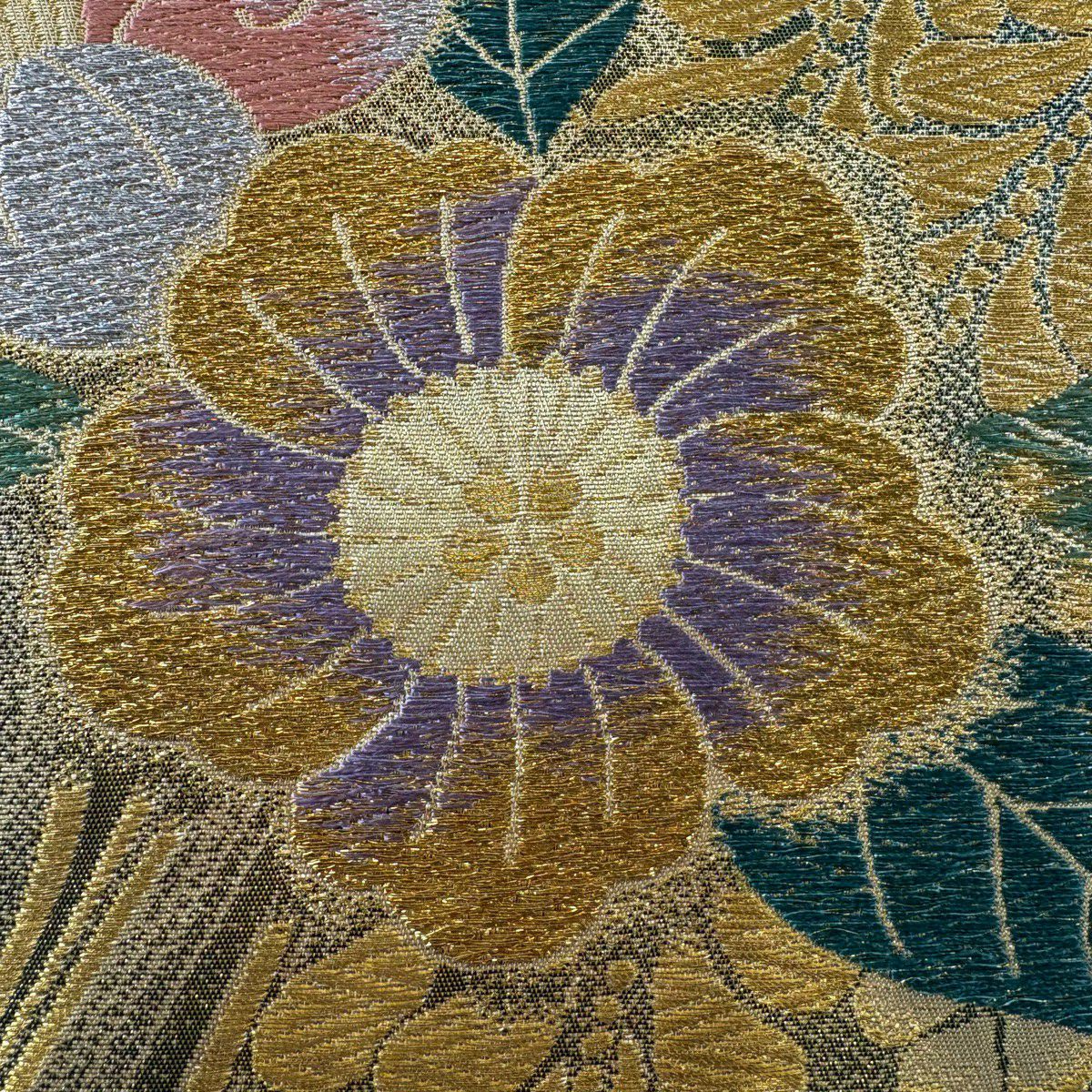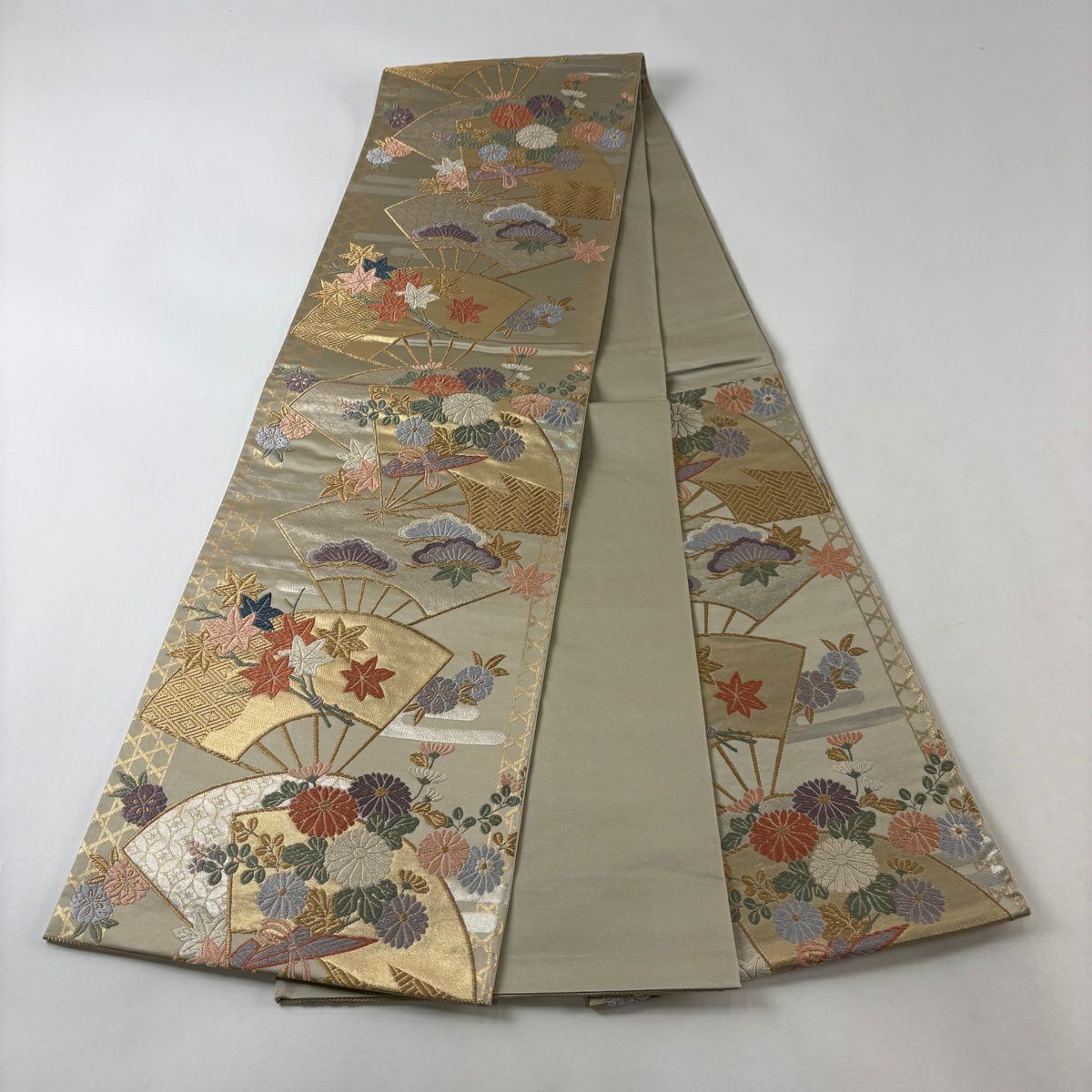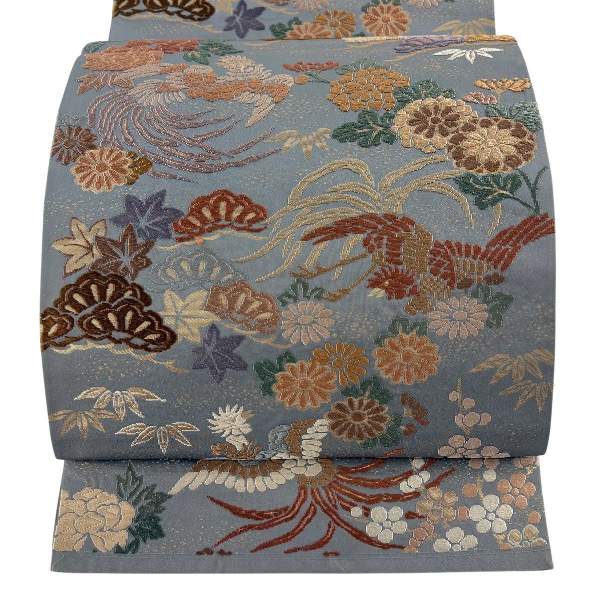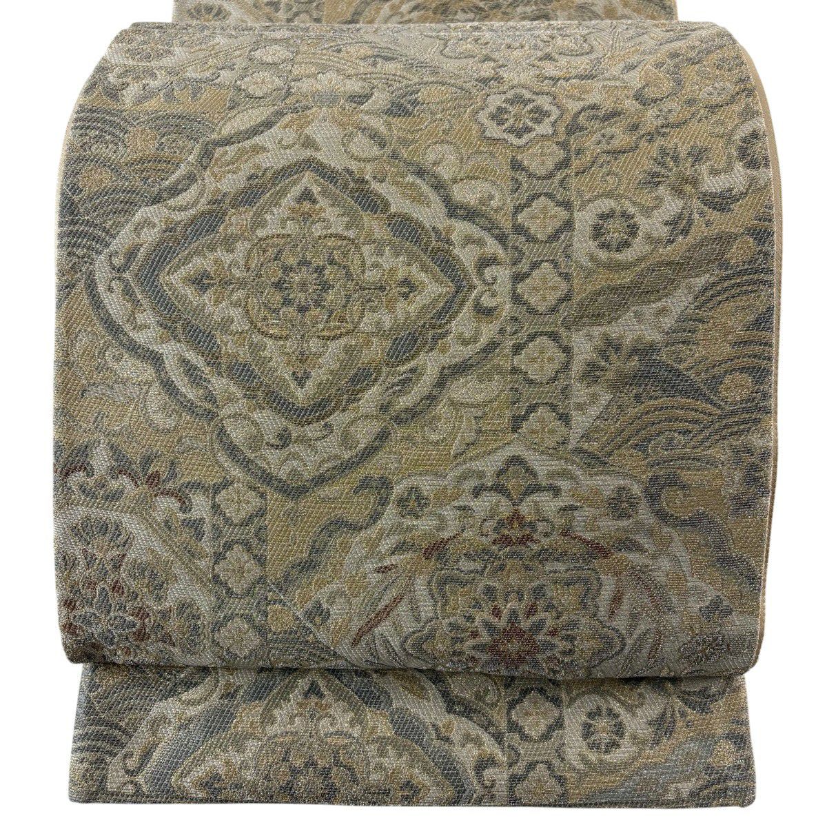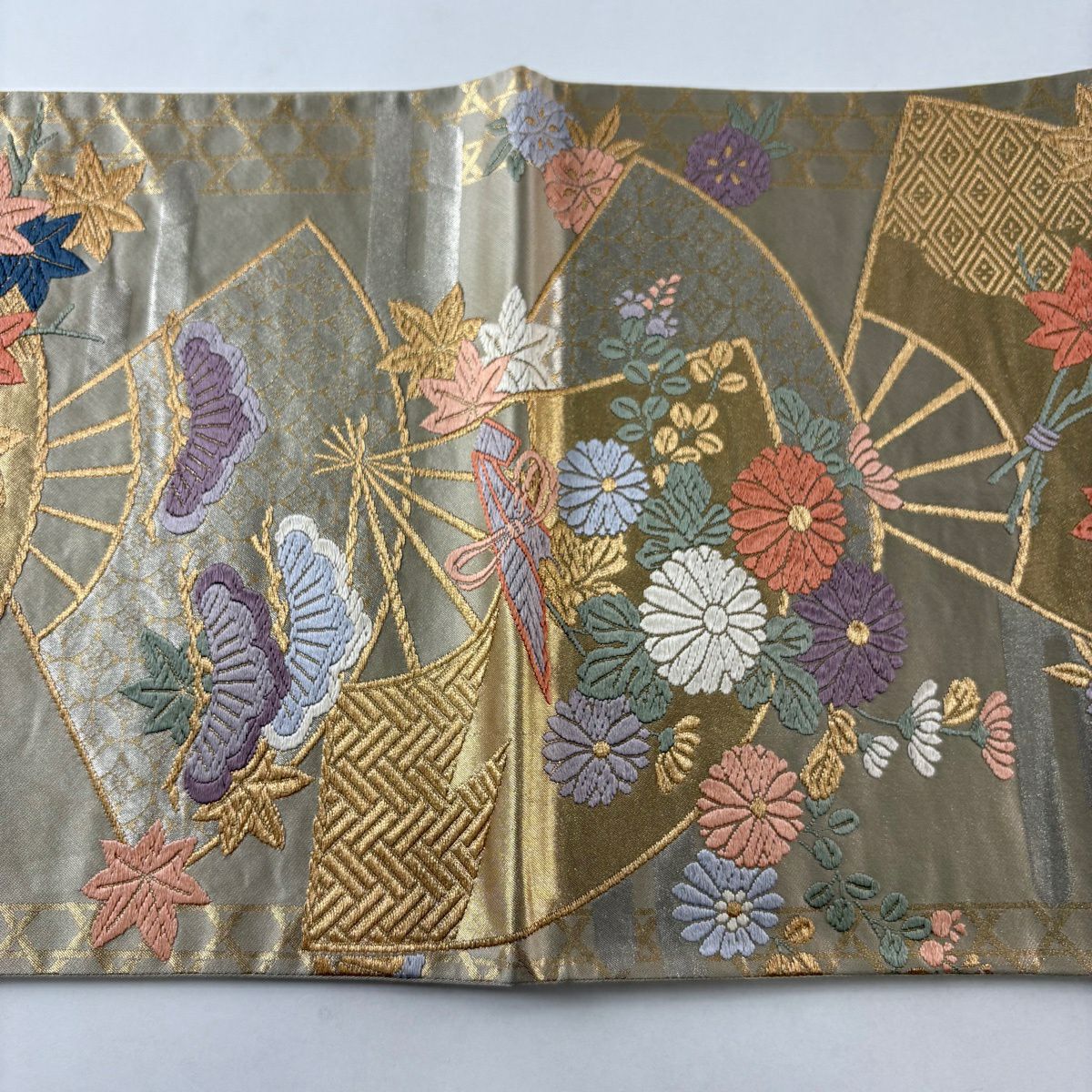【美品】 袋帯 秀品 華文 草花 金糸 箔 灰緑 お太鼓柄 正絹