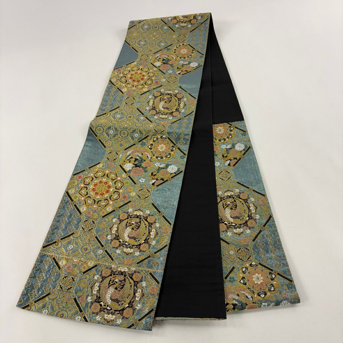 【美品】 袋帯 秀品 蜀江華文 鳳凰 金糸 箔 水色 六通 正絹