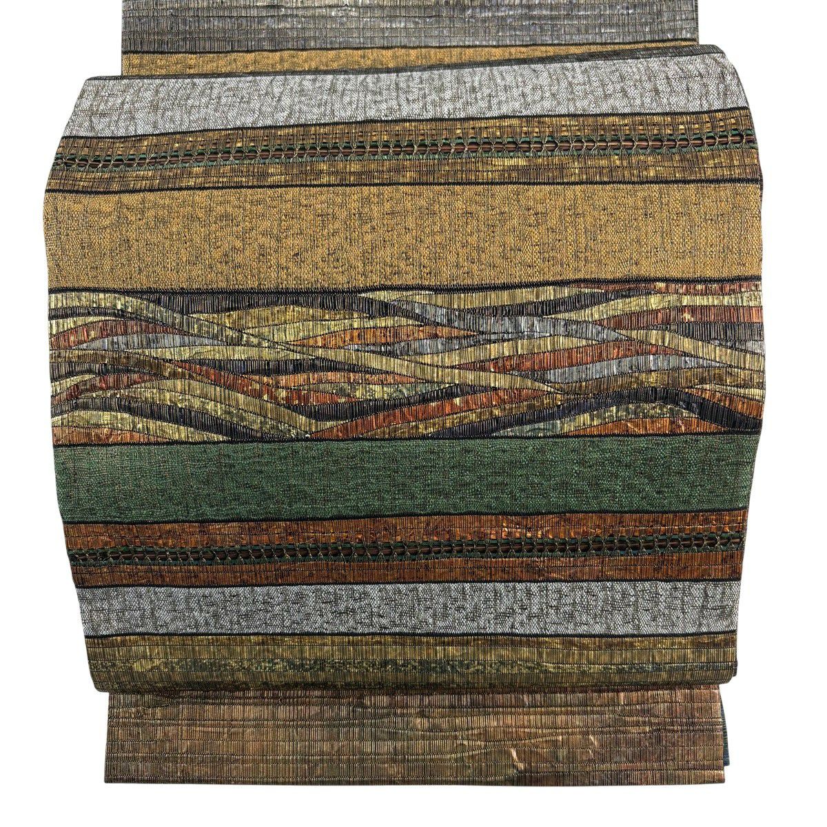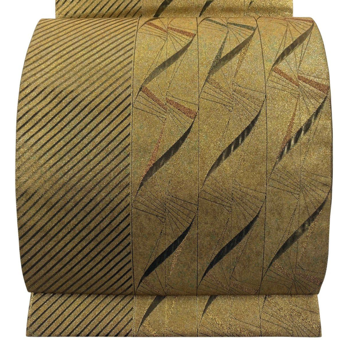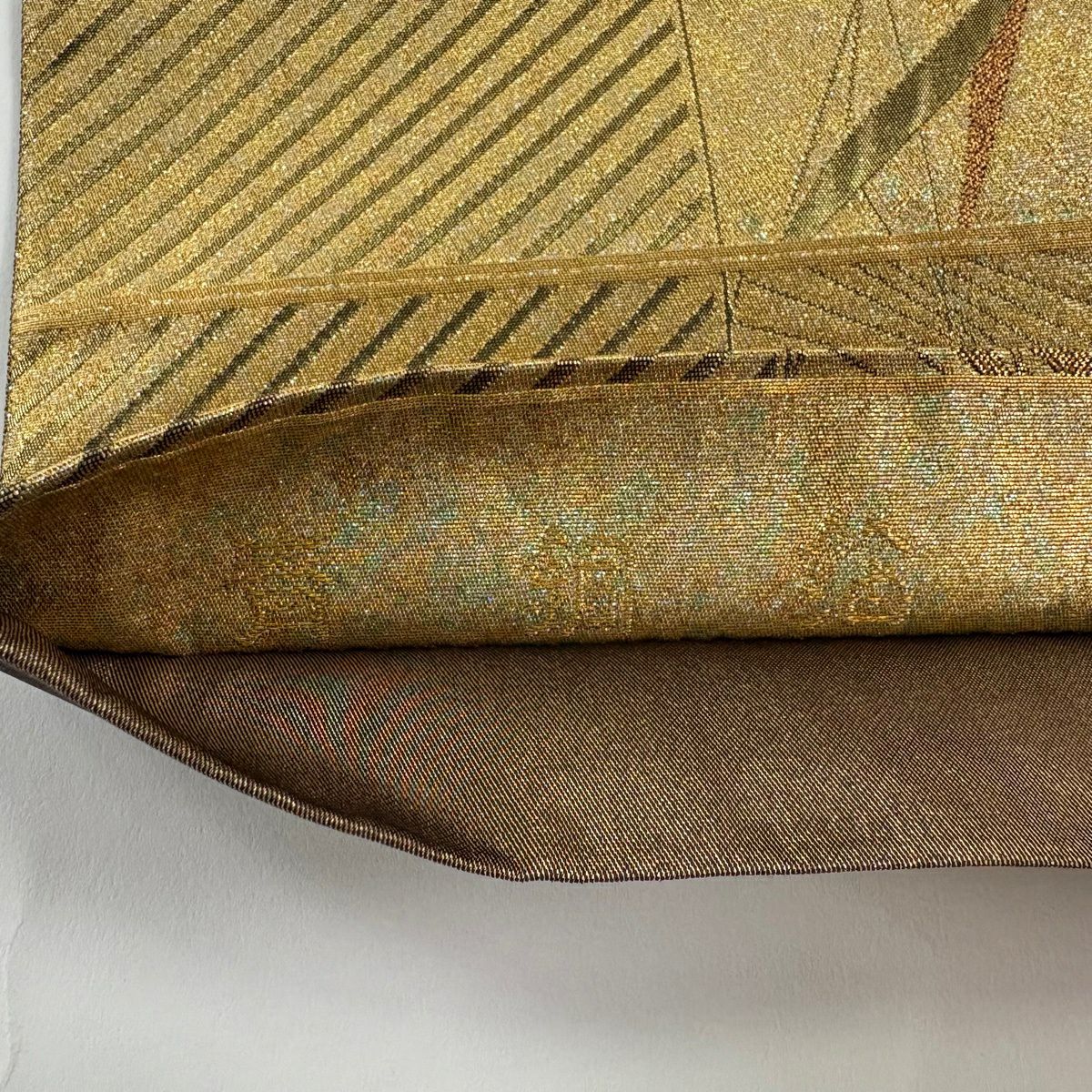 【美品】 袋帯 秀品 斜縞 幾何学 青銅箔 金糸 金色 六通 正絹