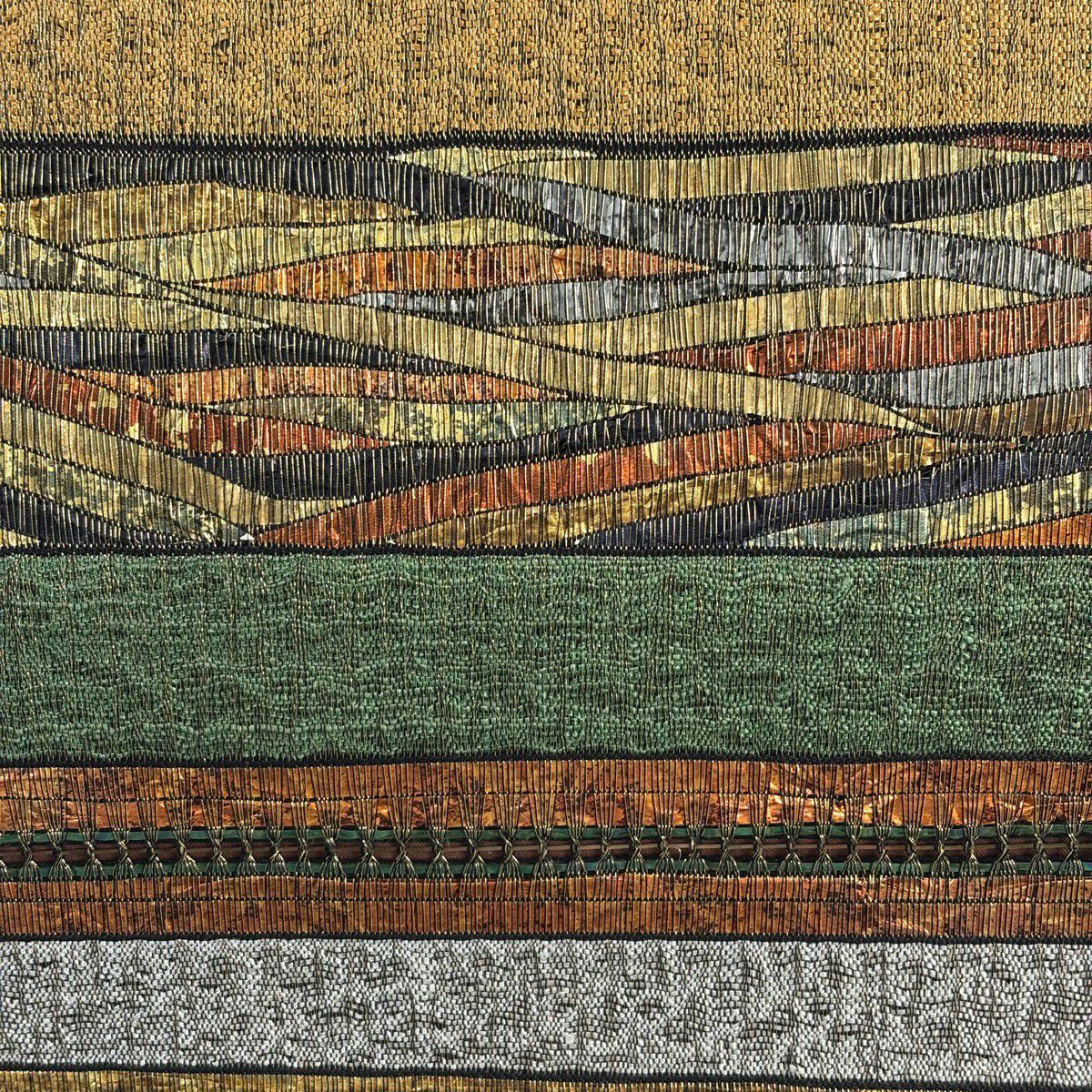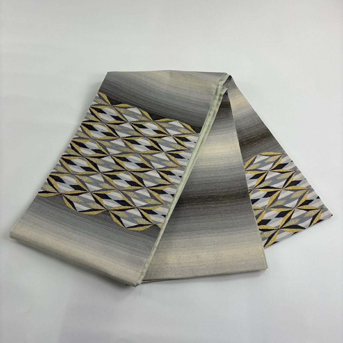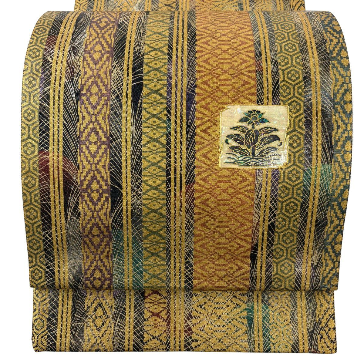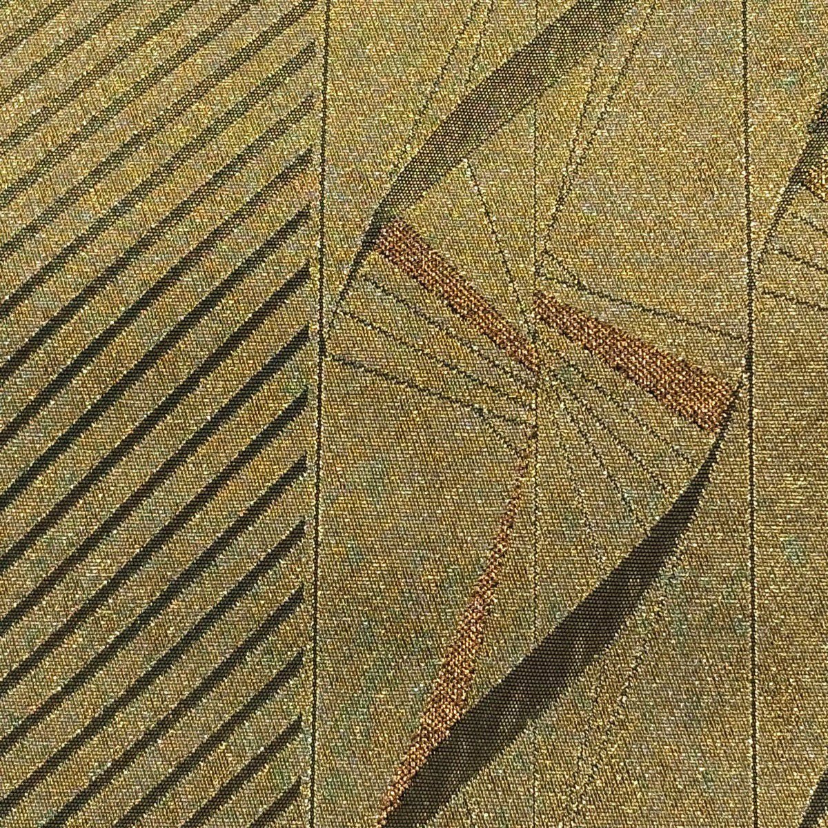 【美品】 袋帯 秀品 斜縞 幾何学 青銅箔 金糸 金色 六通 正絹