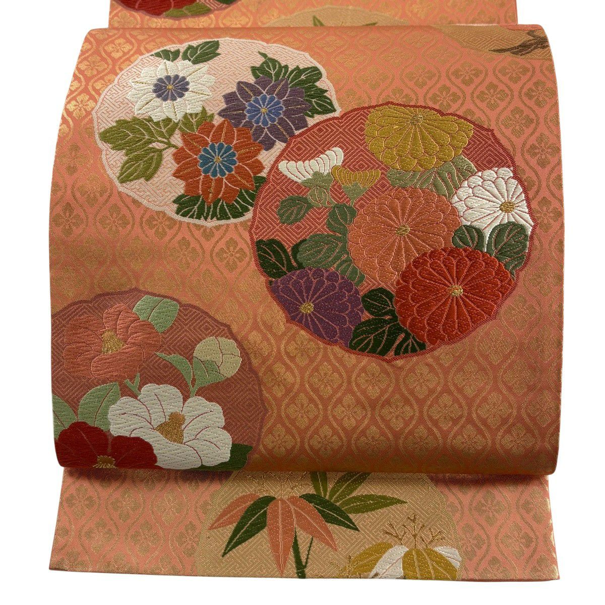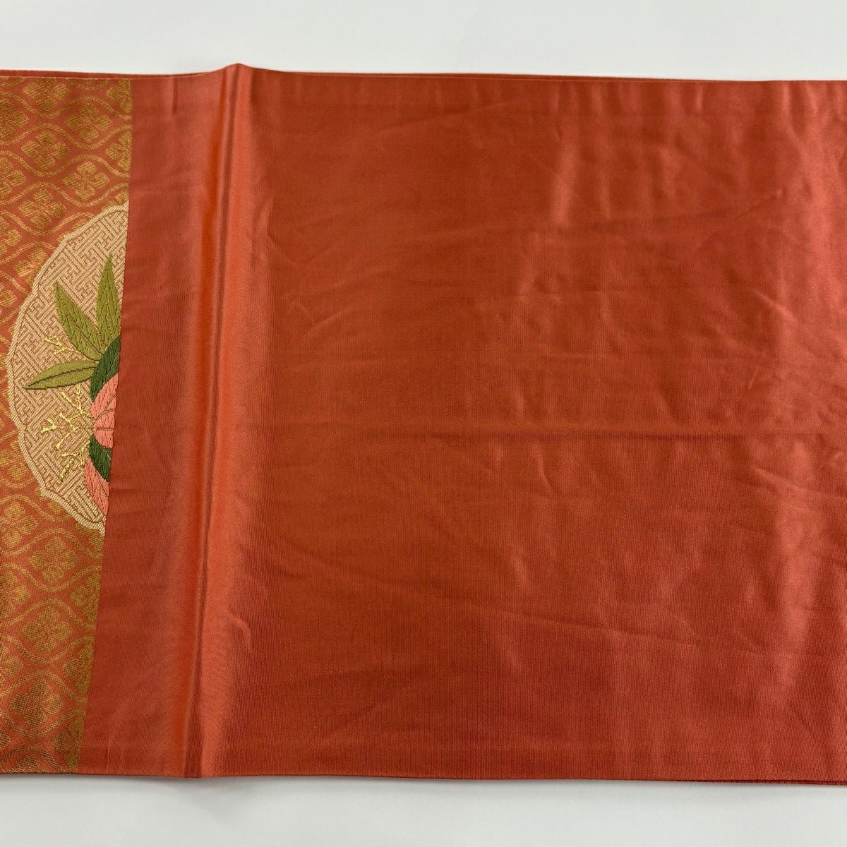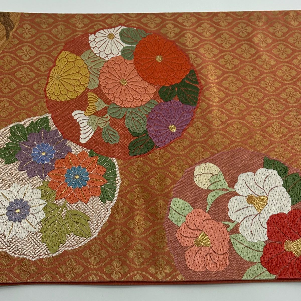 【美品】 袋帯 秀品 菊 立涌 金糸 箔 オレンジ 六通 正絹