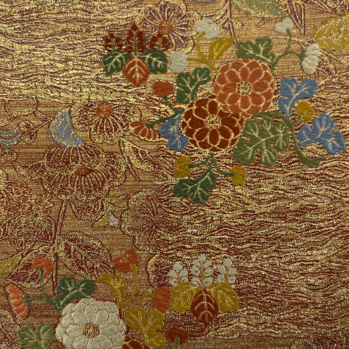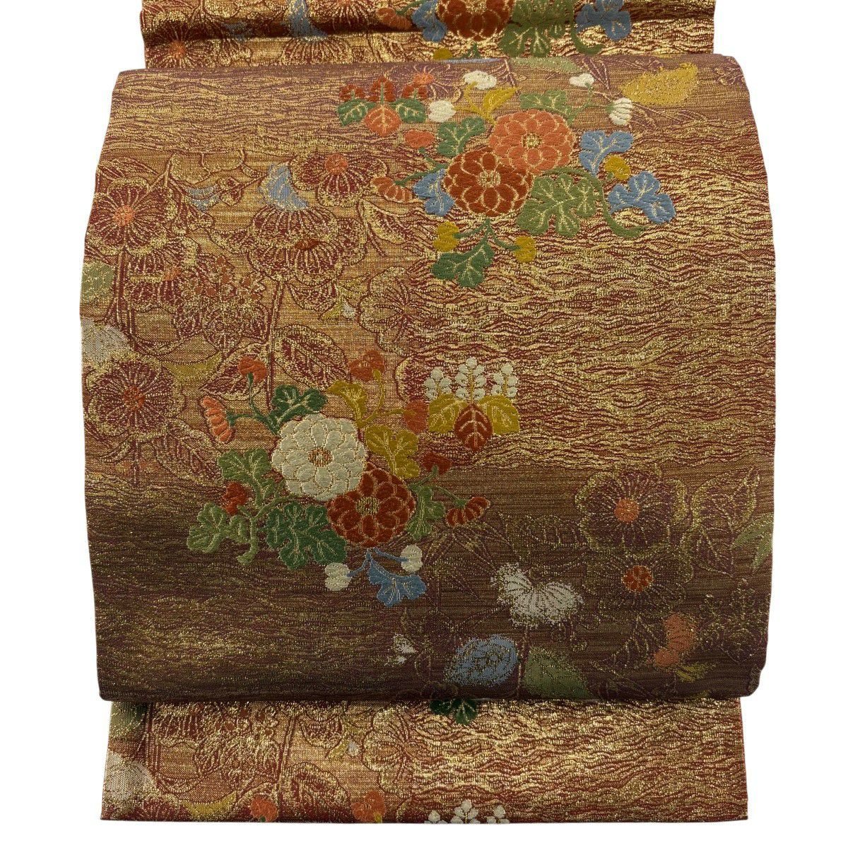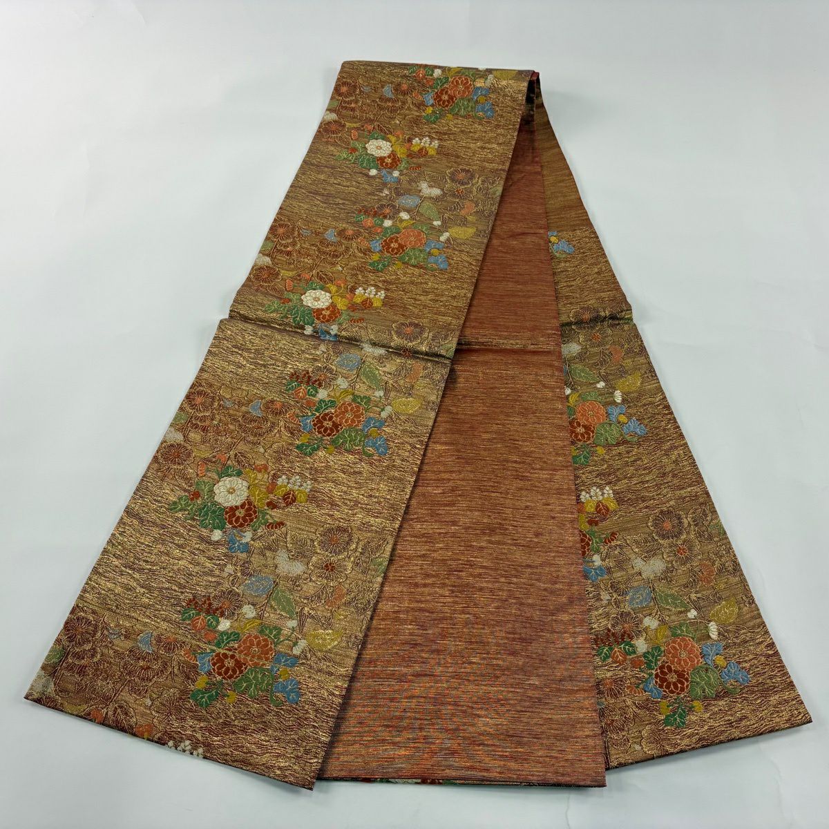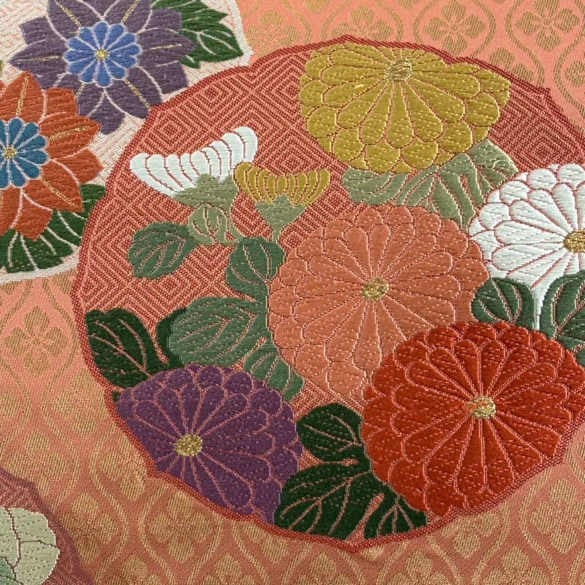 【美品】 袋帯 秀品 菊 立涌 金糸 箔 オレンジ 六通 正絹