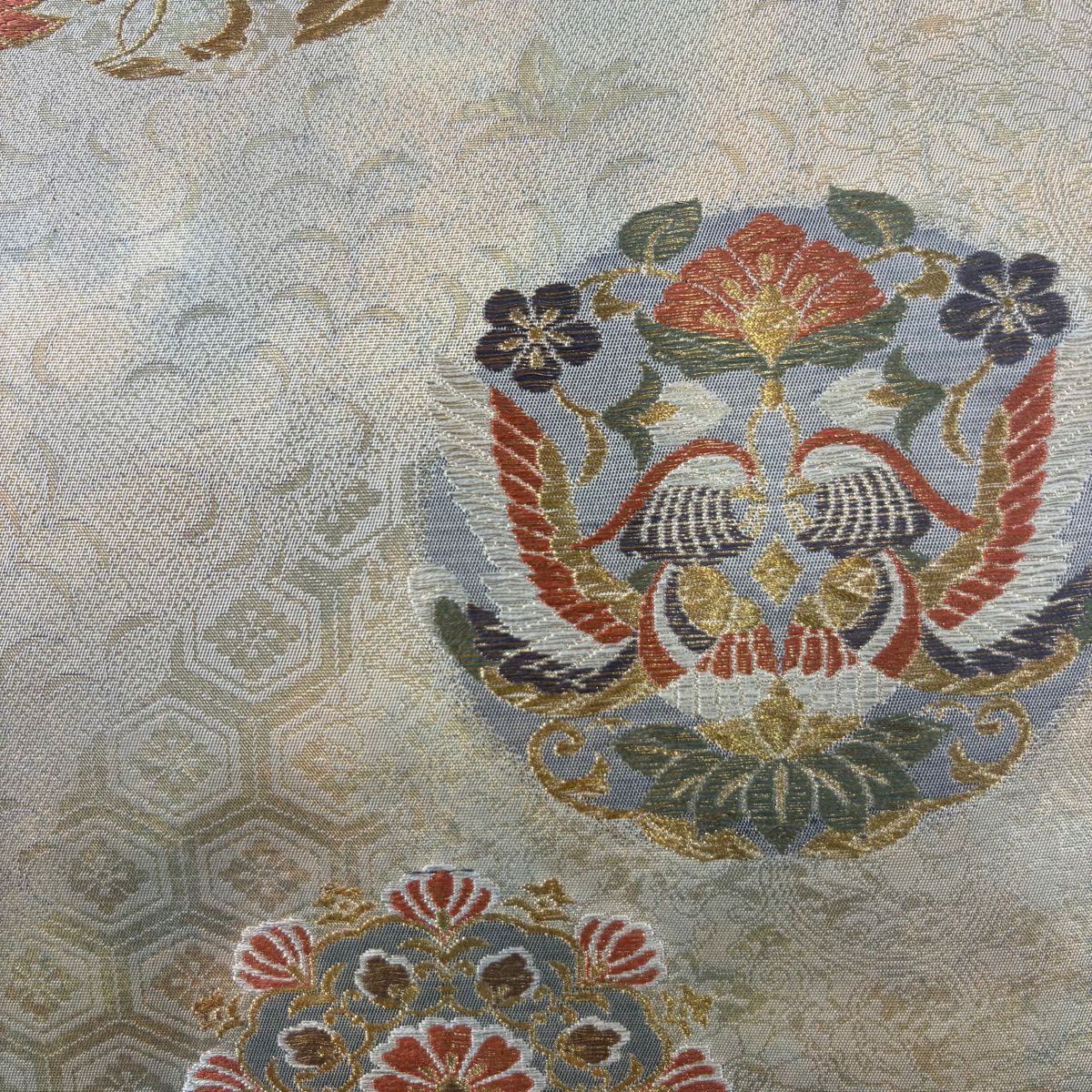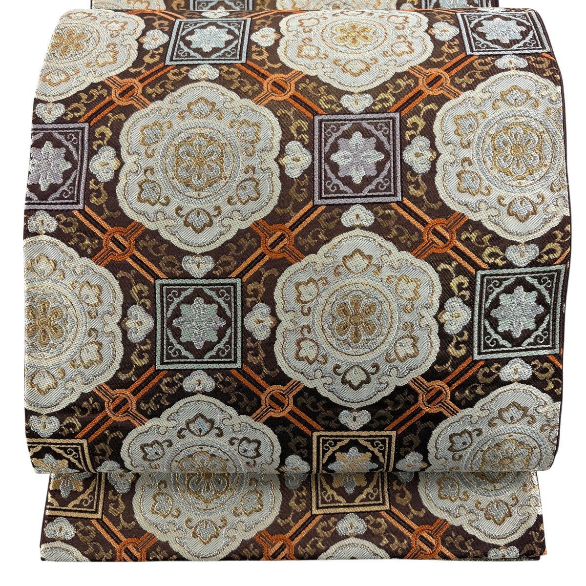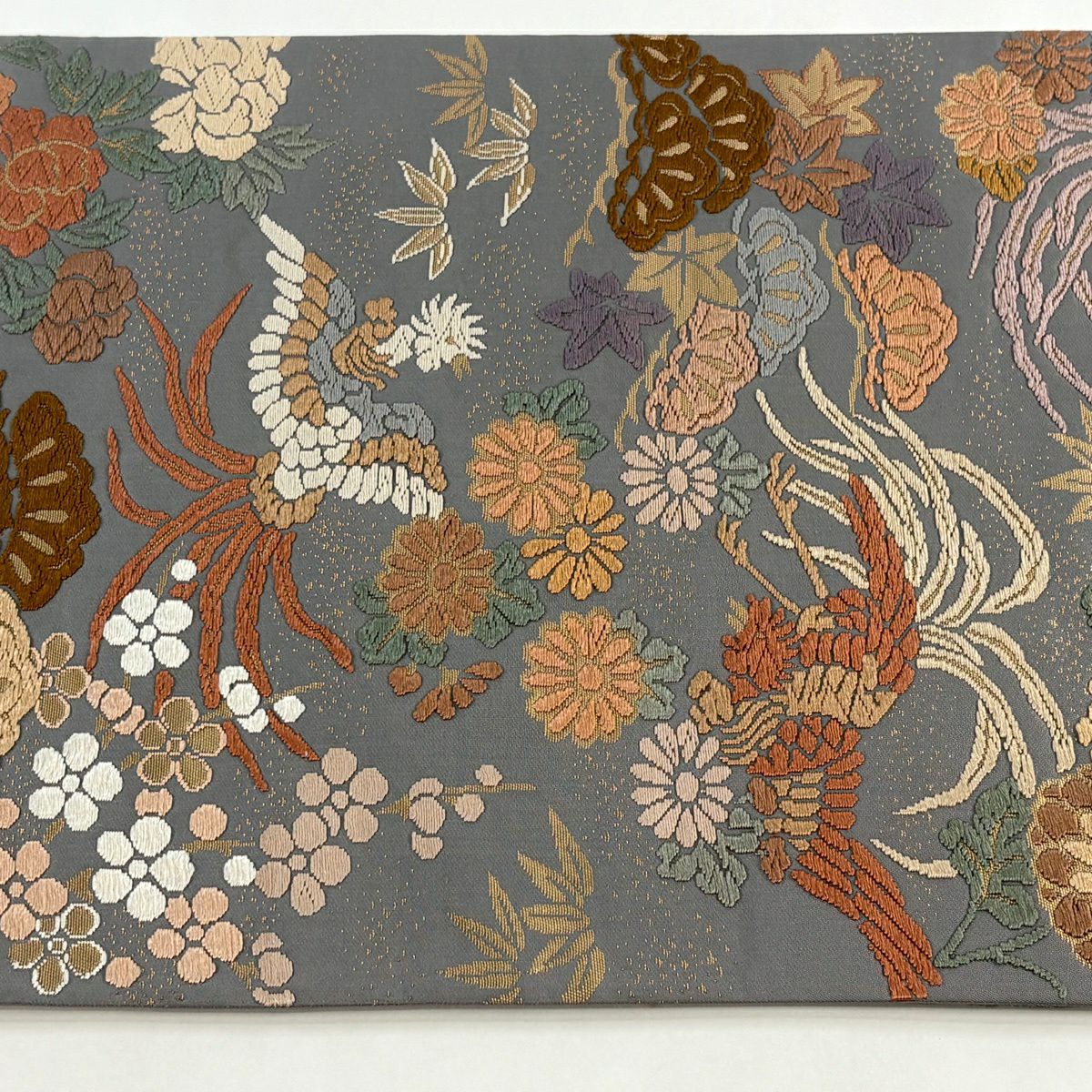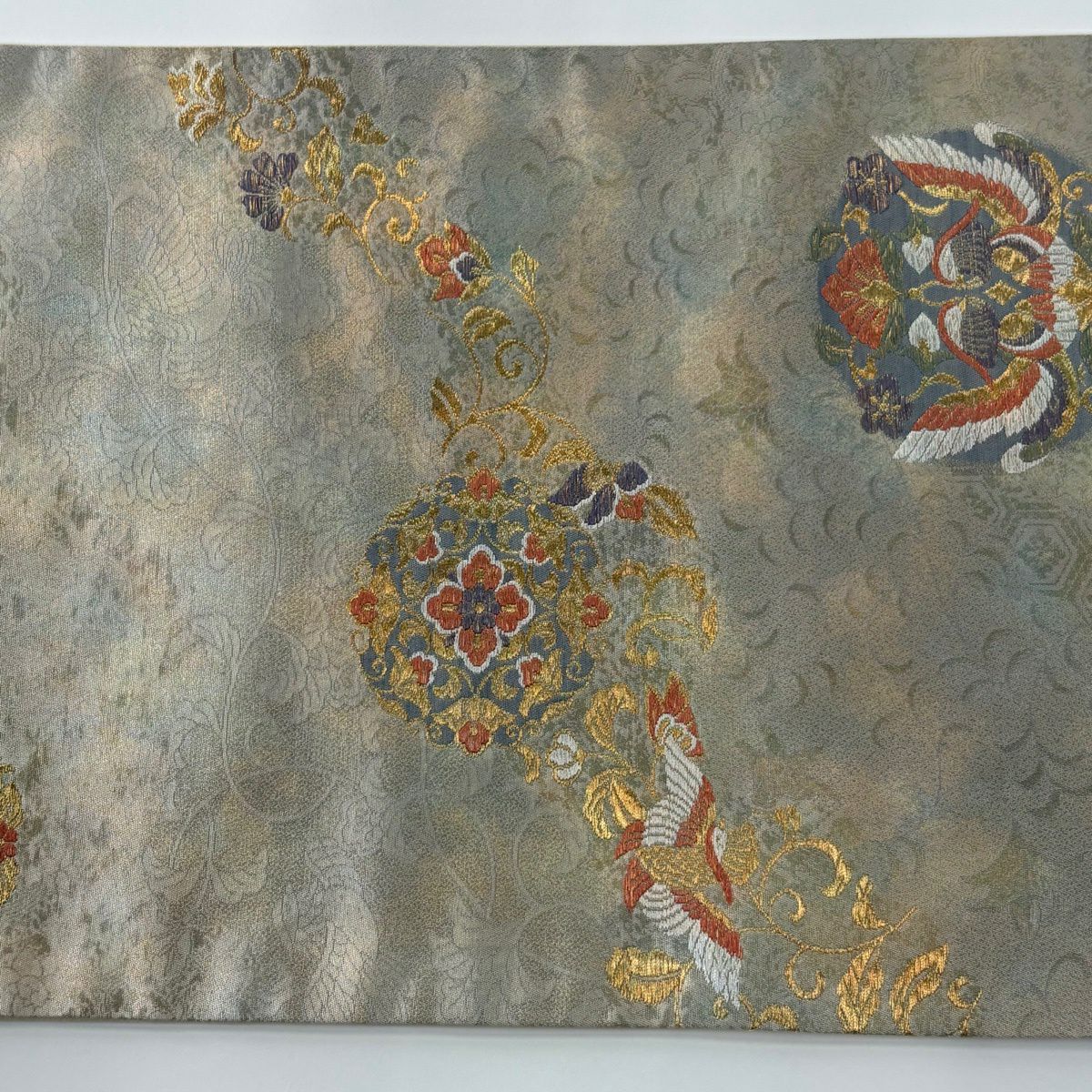 袋帯 秀品 天平の香 向かい鳥 華文 金糸 箔 灰茶 六通 正絹