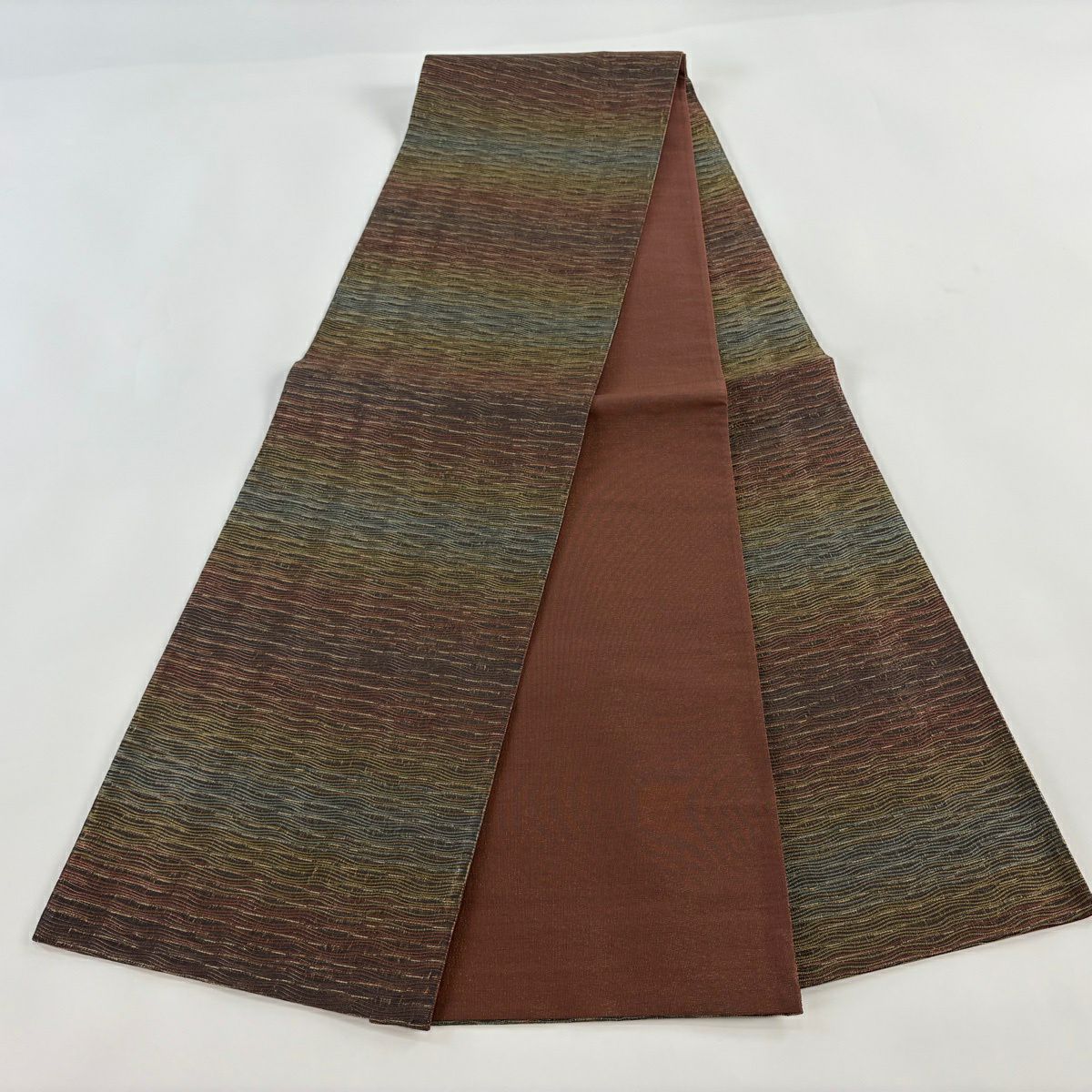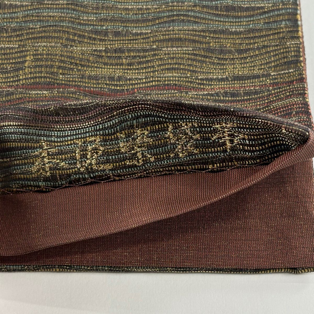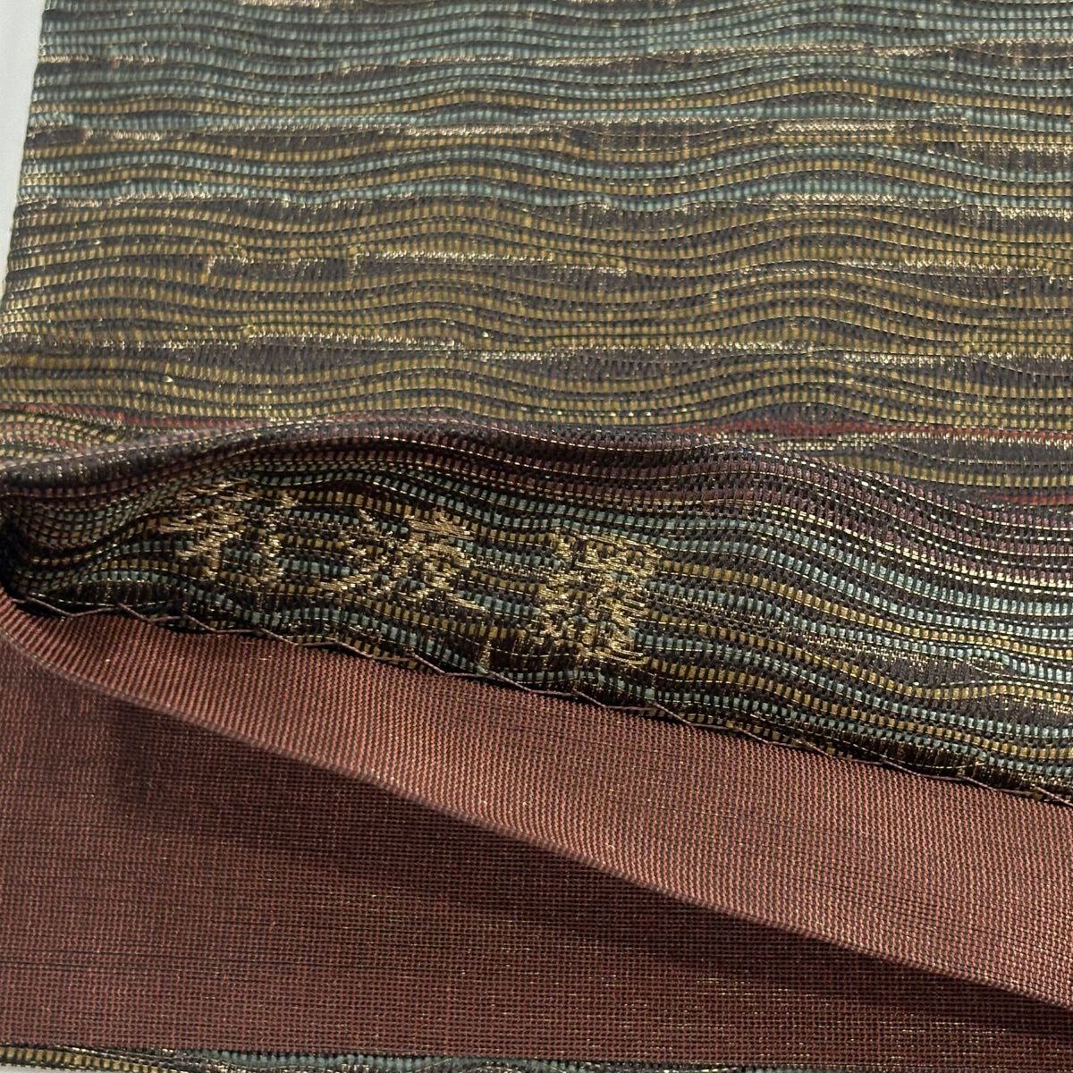 【美品】 袋帯 秀品 泥染 縞 よろけ縞 金糸 茶色 全通 正絹