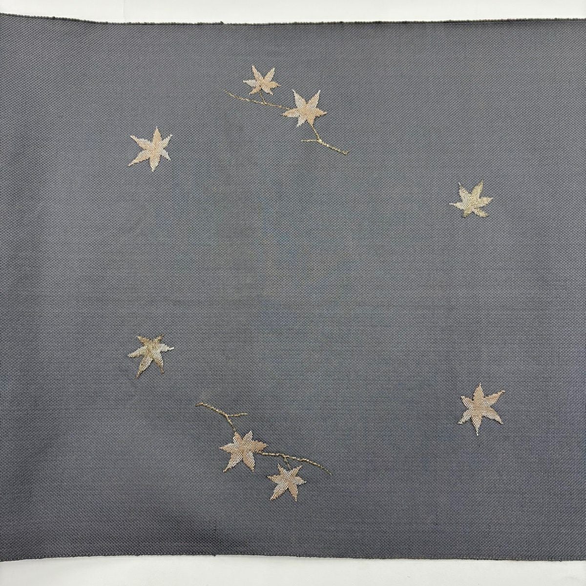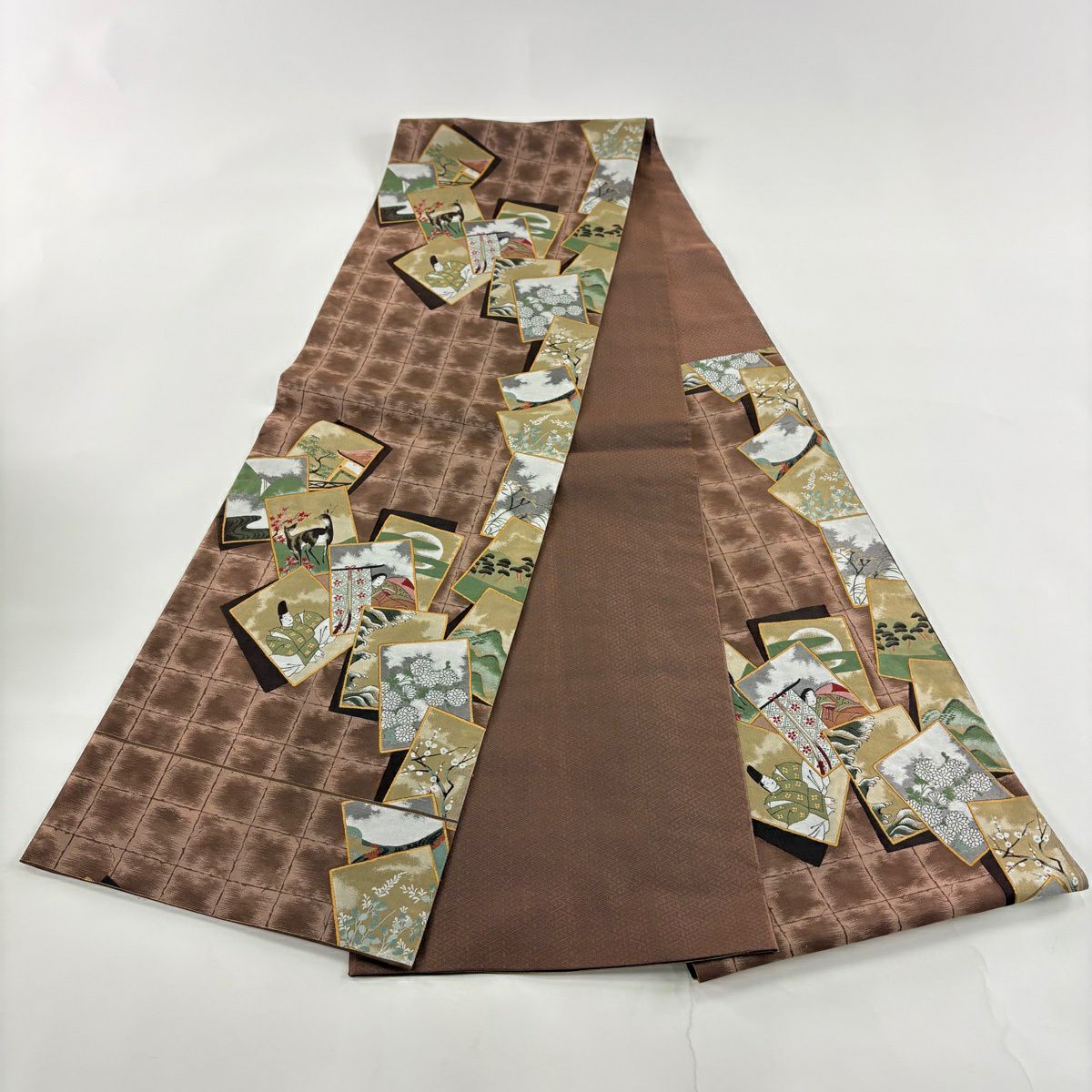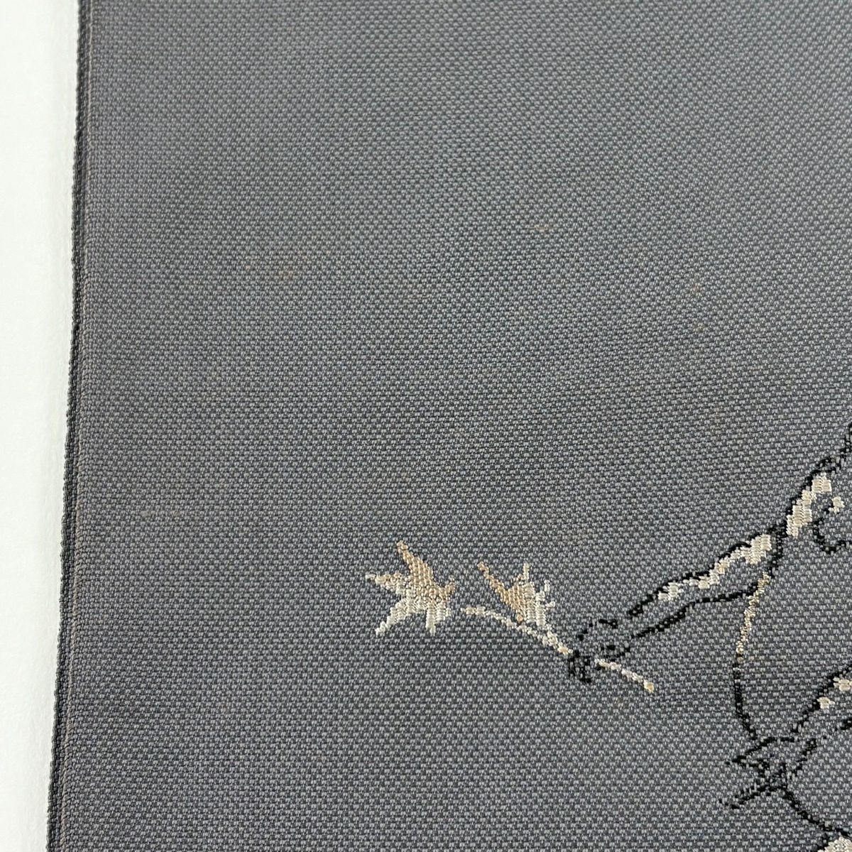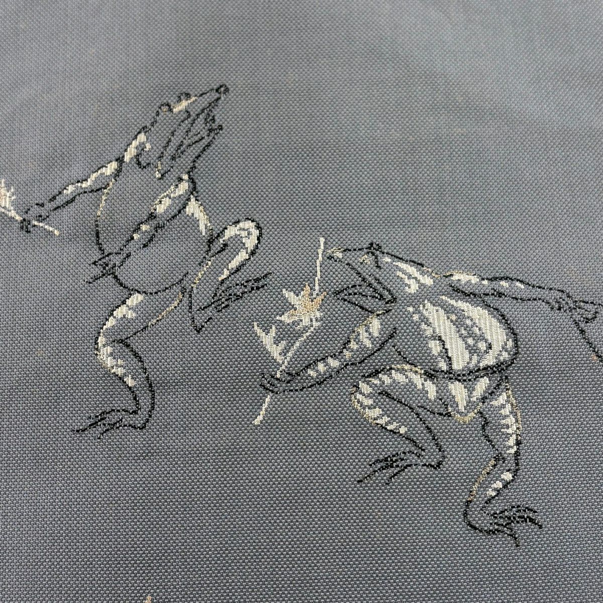 名古屋帯 秀品 落款あり 八寸名古屋帯 カエル 楓 金銀糸 灰色 正絹