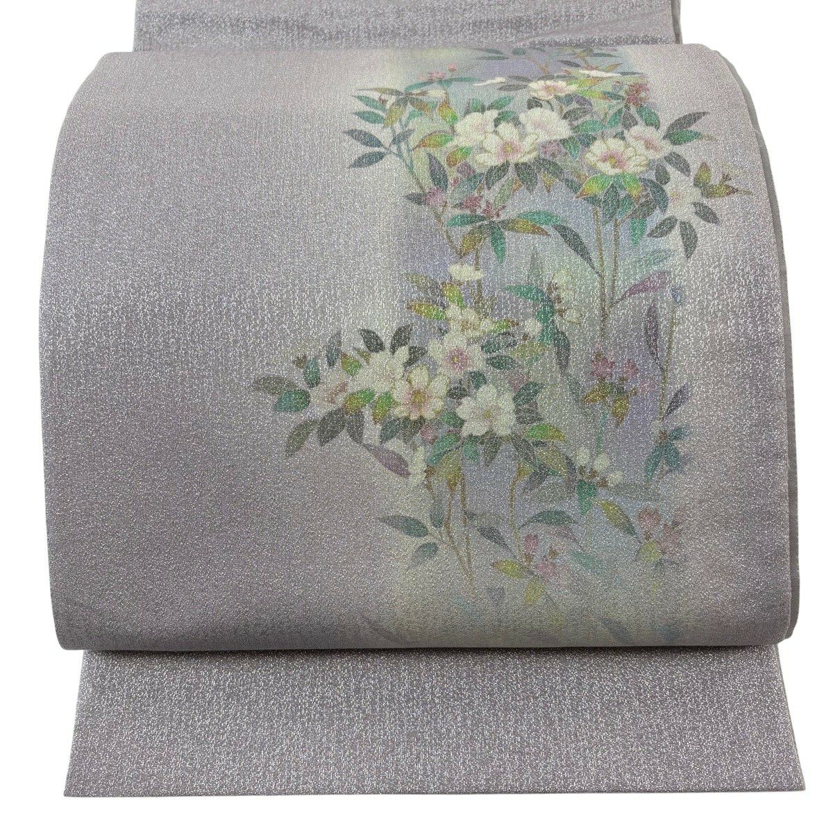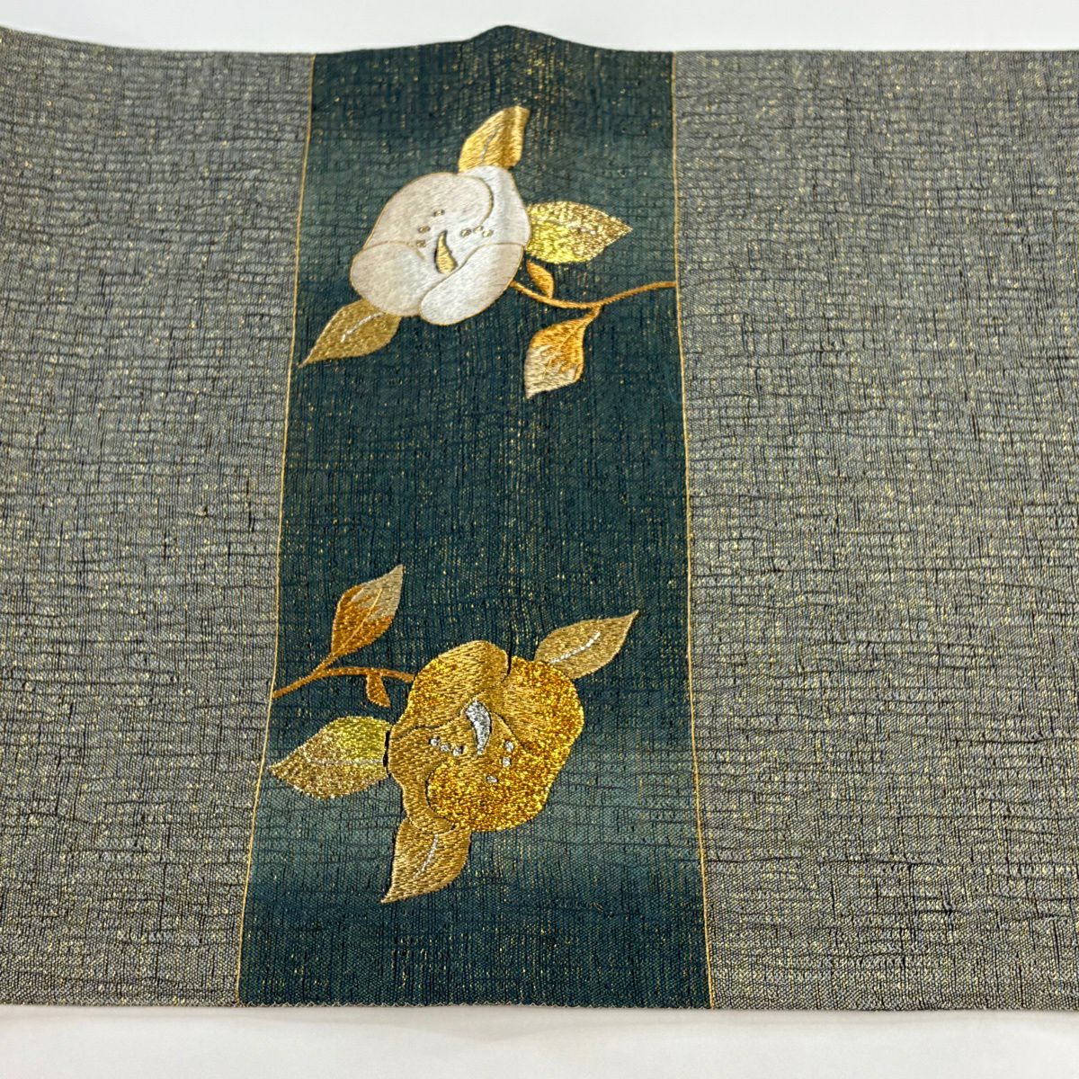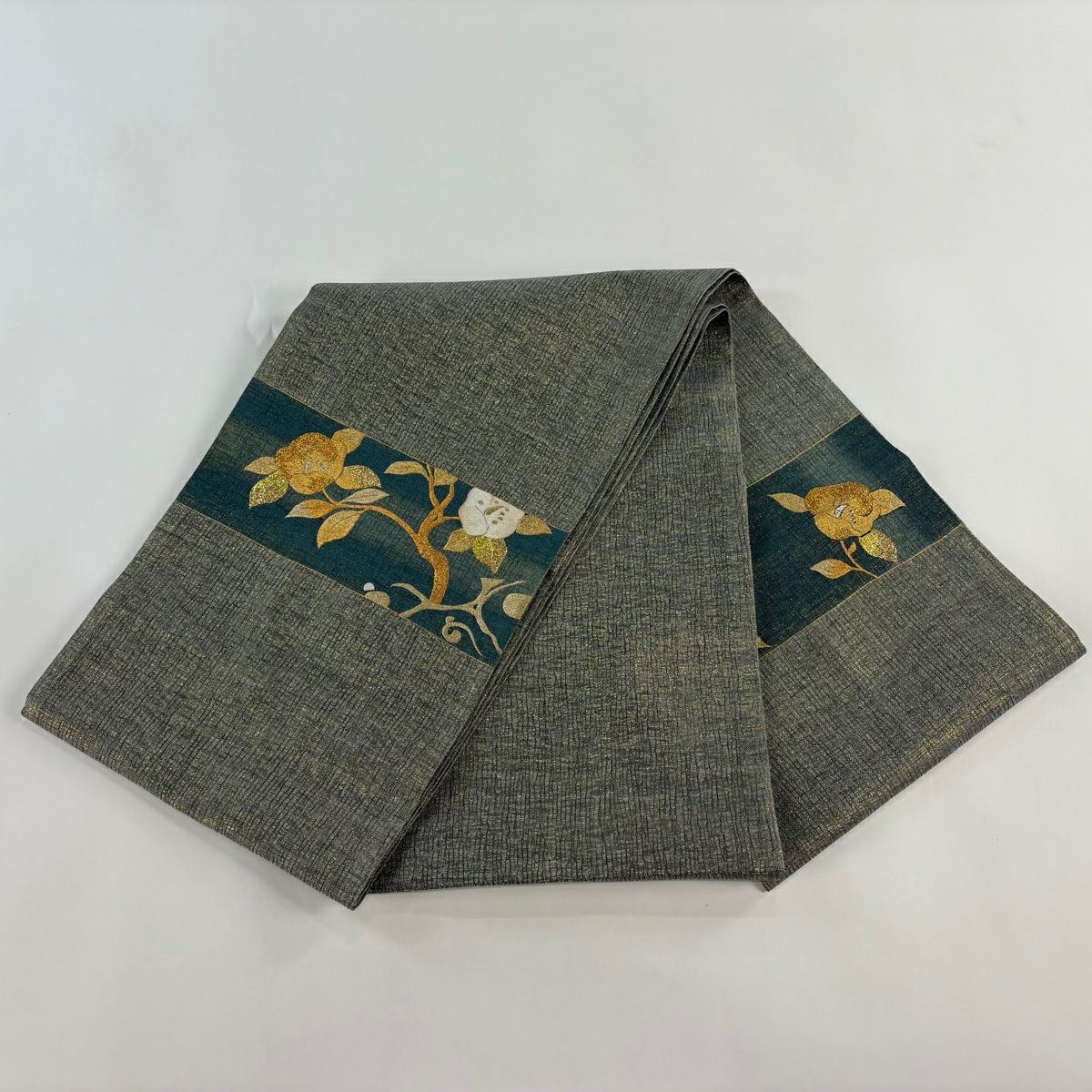 【美品】 袋帯 秀品 夏帯 椿 金銀糸 箔 灰緑 お太鼓柄 正絹