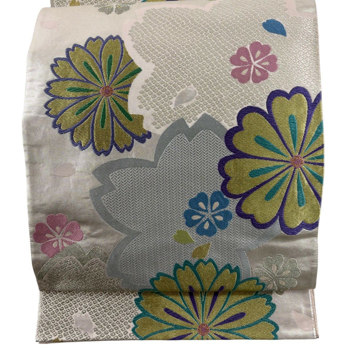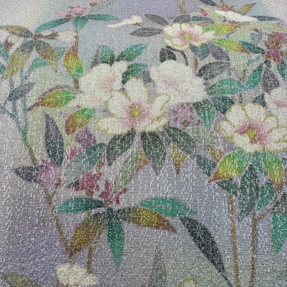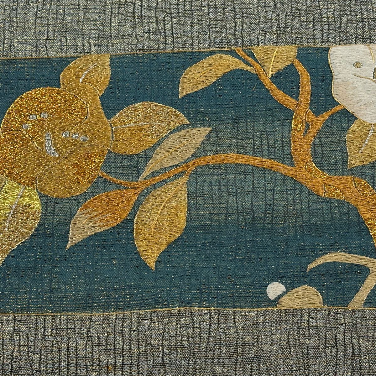 【美品】 袋帯 秀品 夏帯 椿 金銀糸 箔 灰緑 お太鼓柄 正絹