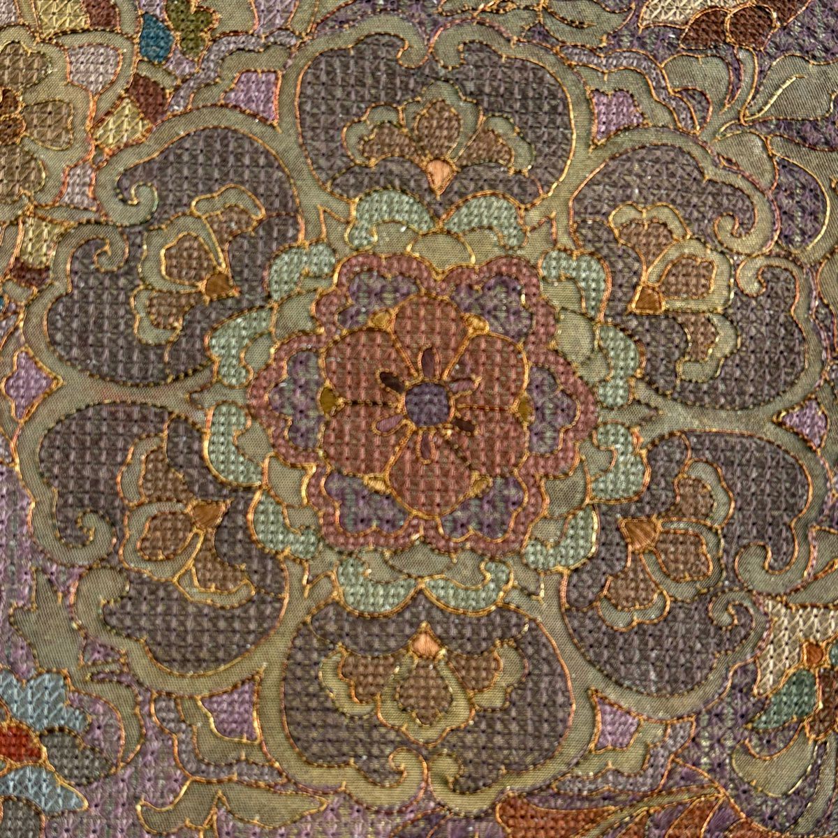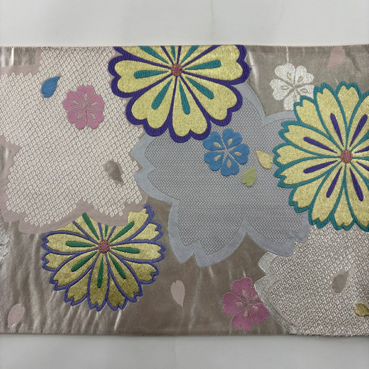 【美品】 袋帯 秀品 草花 霞 刺繍 金糸 灰紫 お太鼓柄 正絹