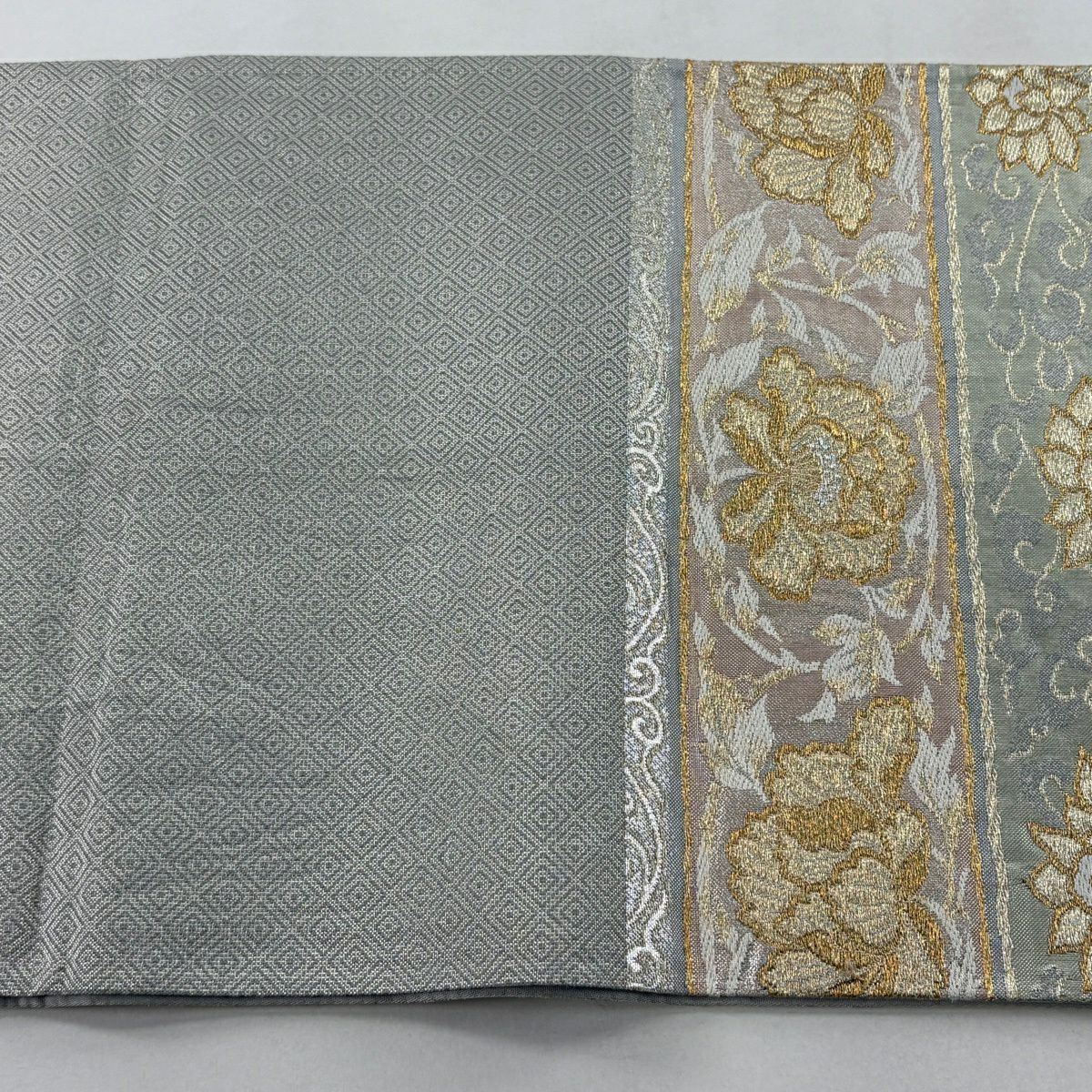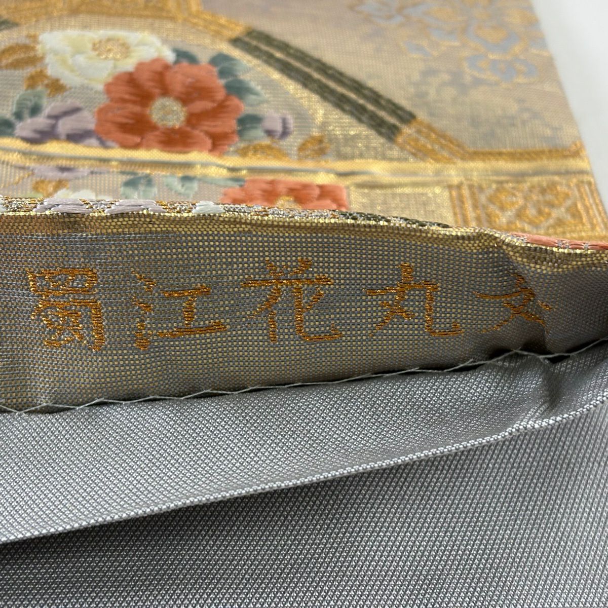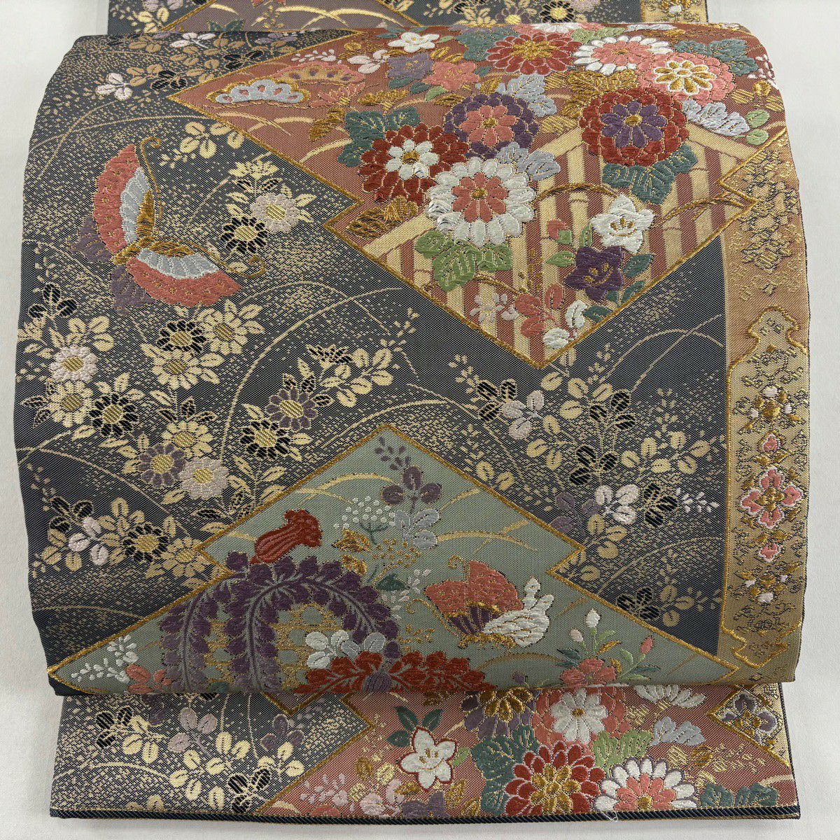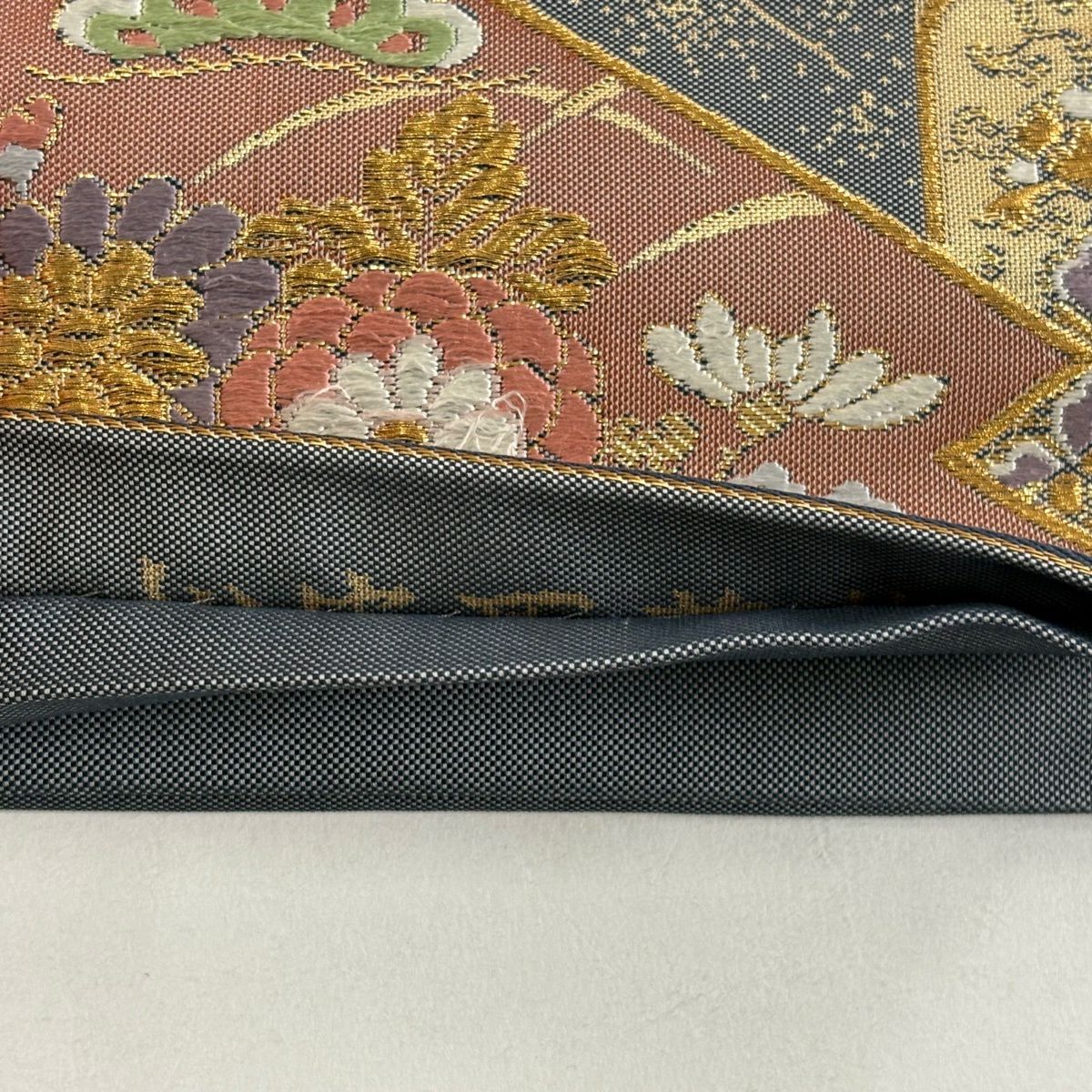 袋帯 秀品 関西仕立て 松皮菱 秋草 金糸 箔 灰色 六通 正絹