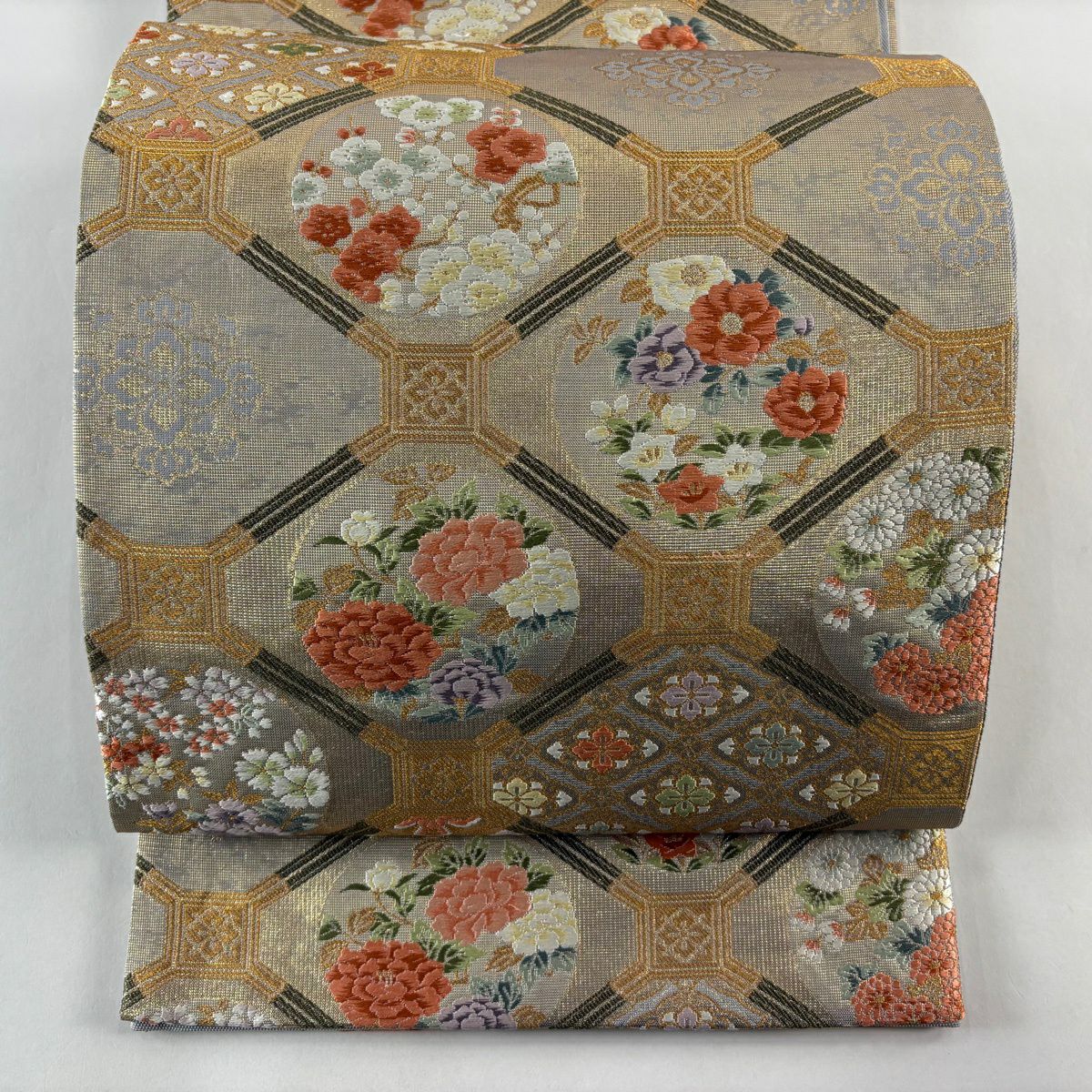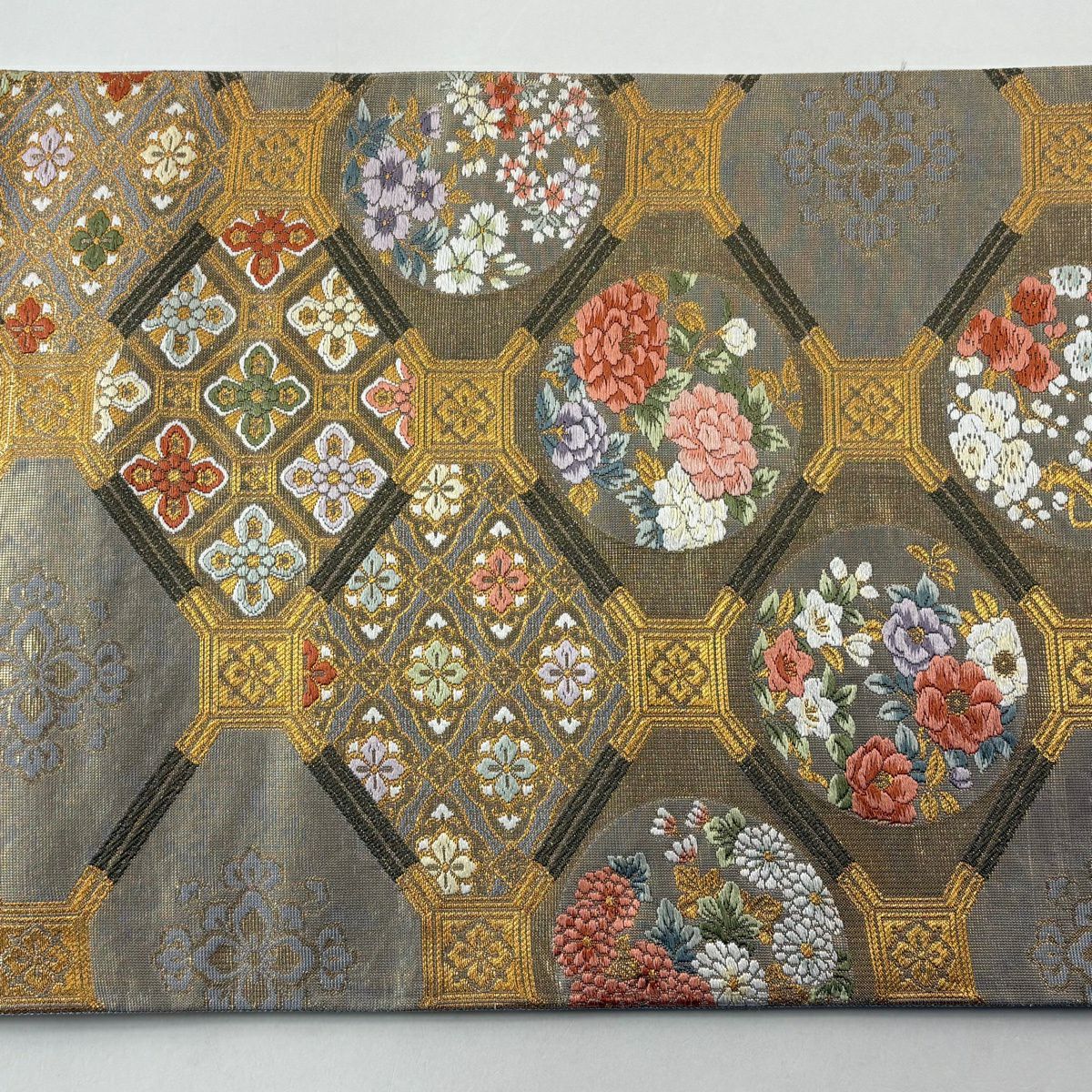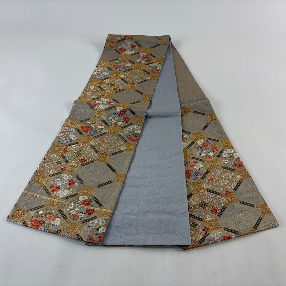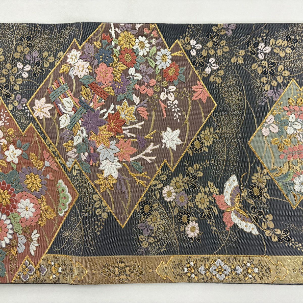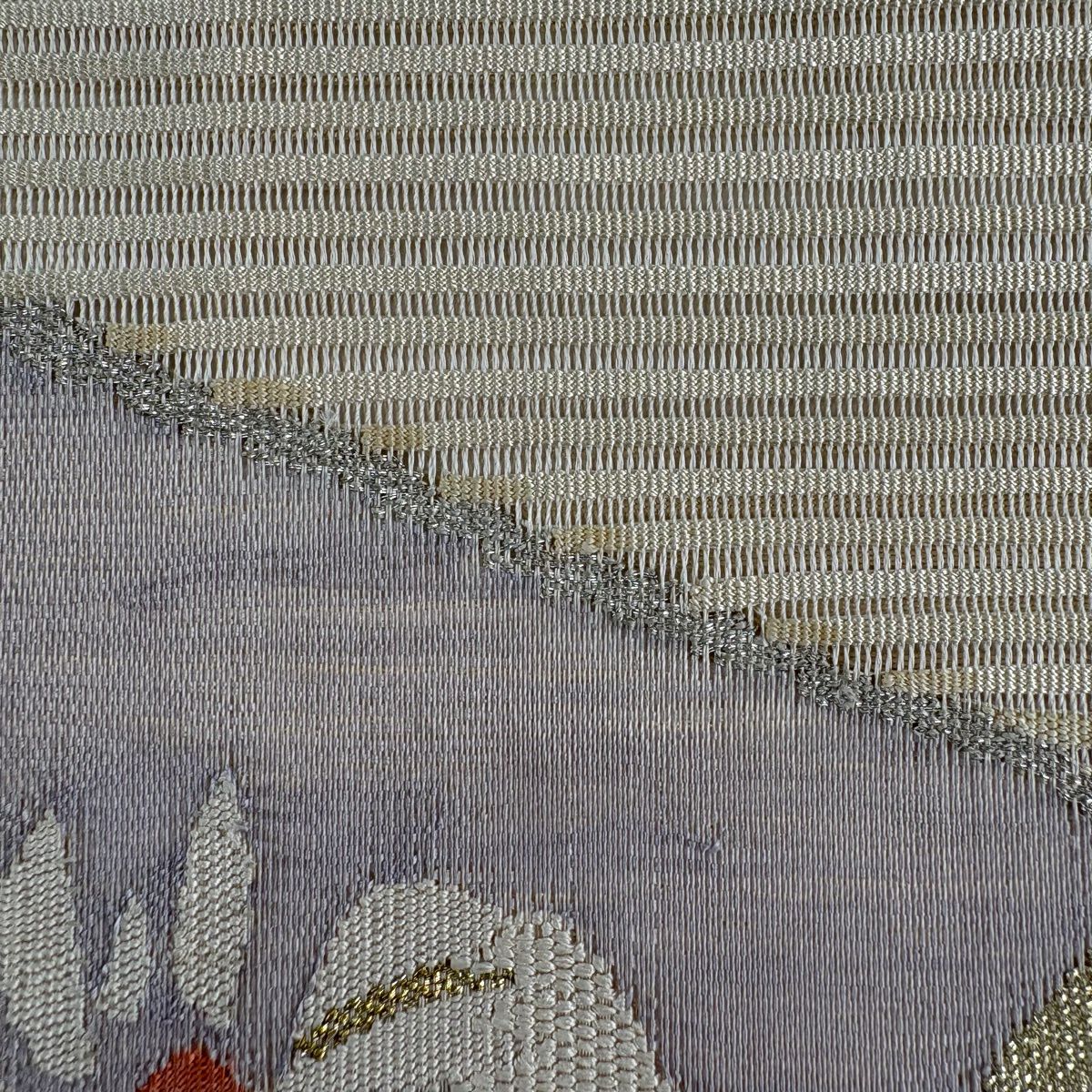袋帯 秀品 関西仕立て 松皮菱 秋草 金糸 箔 灰色 六通 正絹